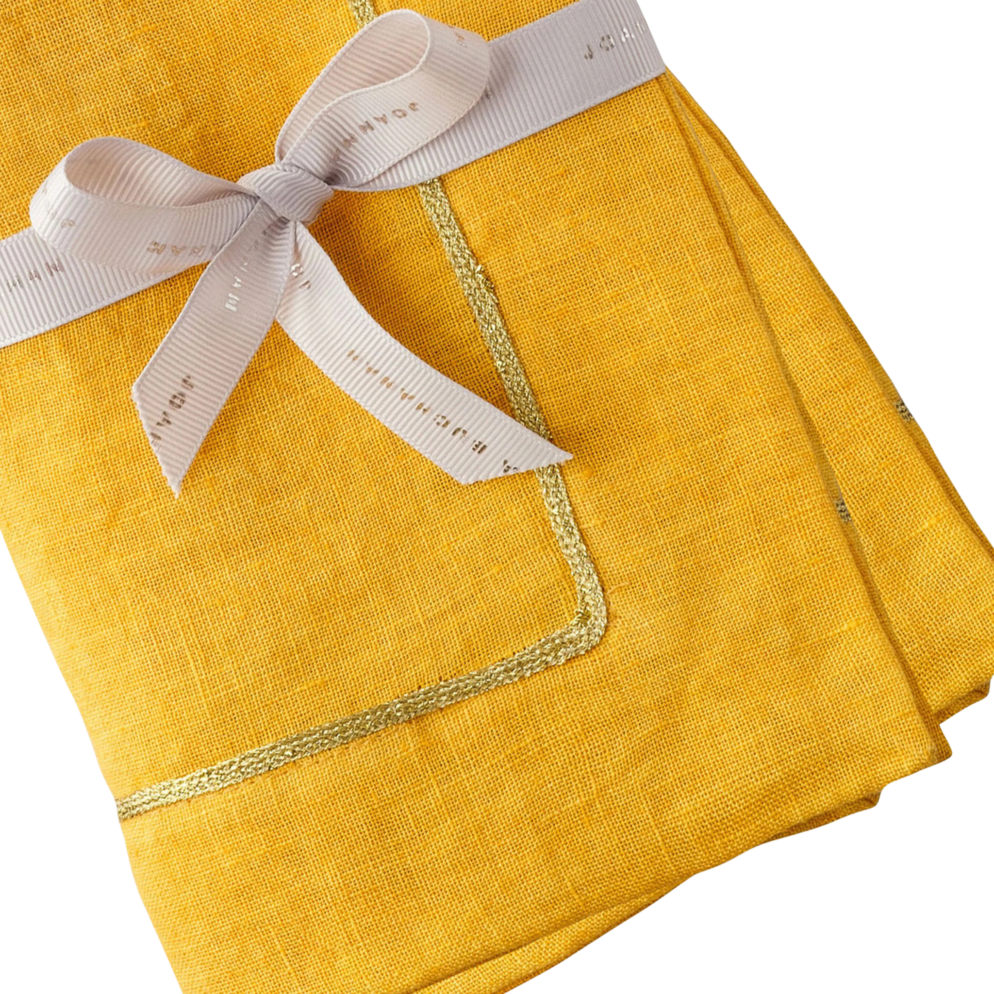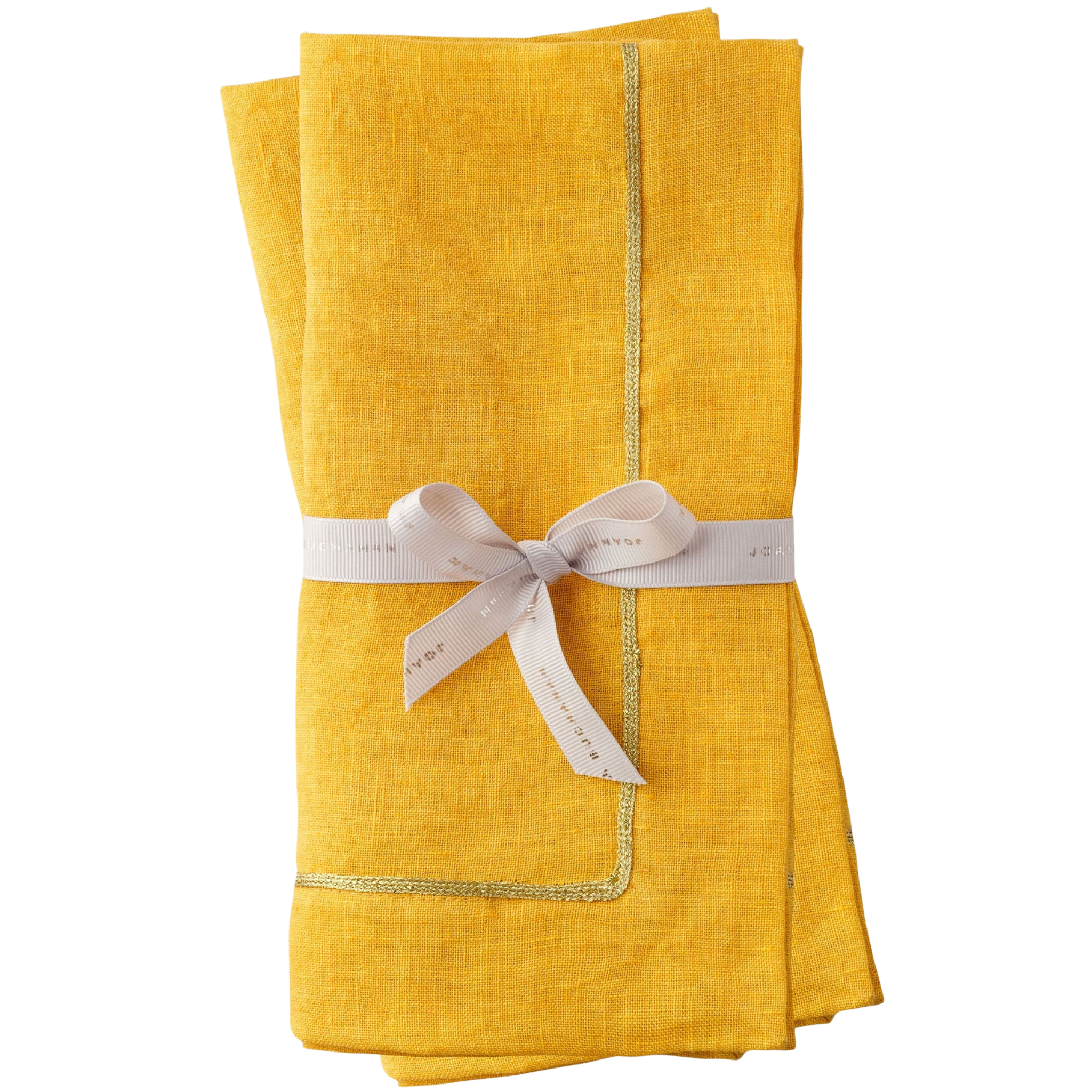Add a touch of sophistication to your table with this Set of Two Gold Trim Dinner Napkins in Yellow. The vibrant yellow fabric is beautifully accented with a sleek gold trim, offering a perfect balance of boldness and elegance. Ideal for special occasions or everyday dining.