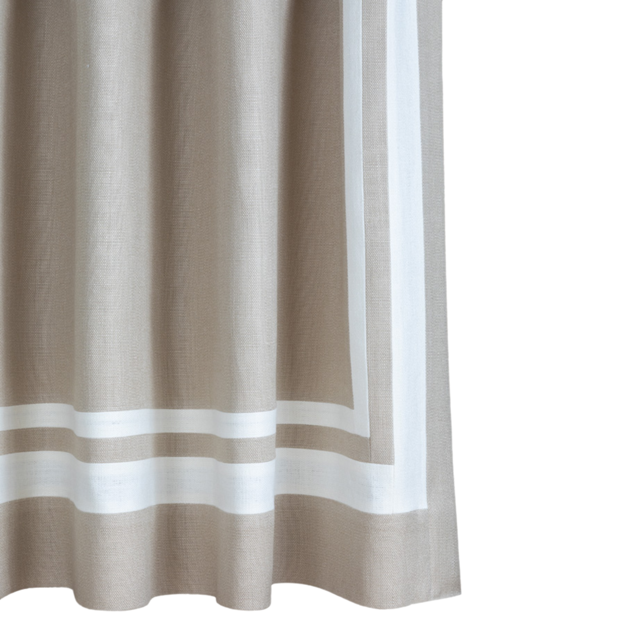 Hugo II, from our Bordered Drapery Panel Collection is detailed with wide and narrow inset borders on the leading edge and at the hem line. Available with any one of the header styles shown below.
