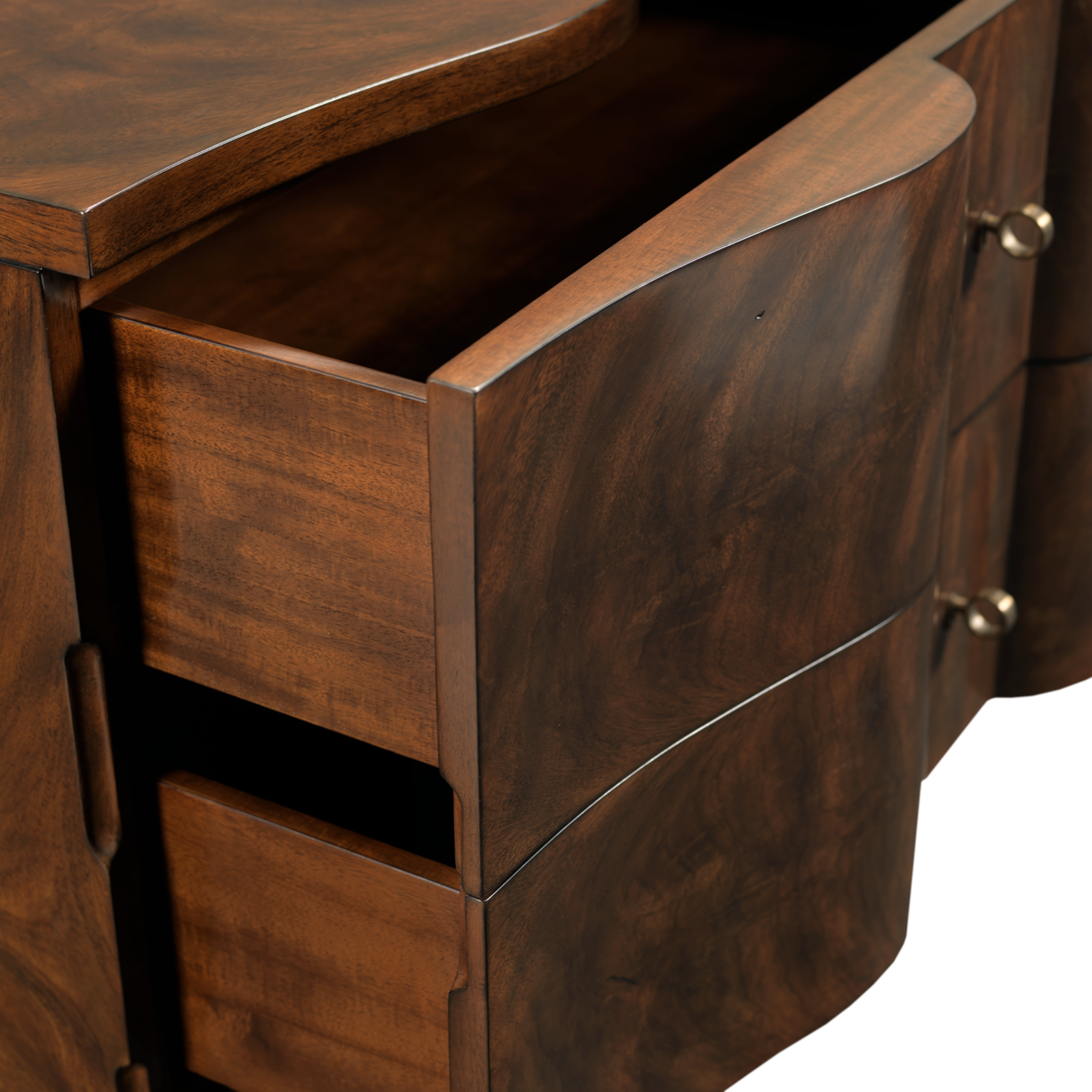 A terrific chest for bedside with a shaped front of three individual drawers over a scalloped base.