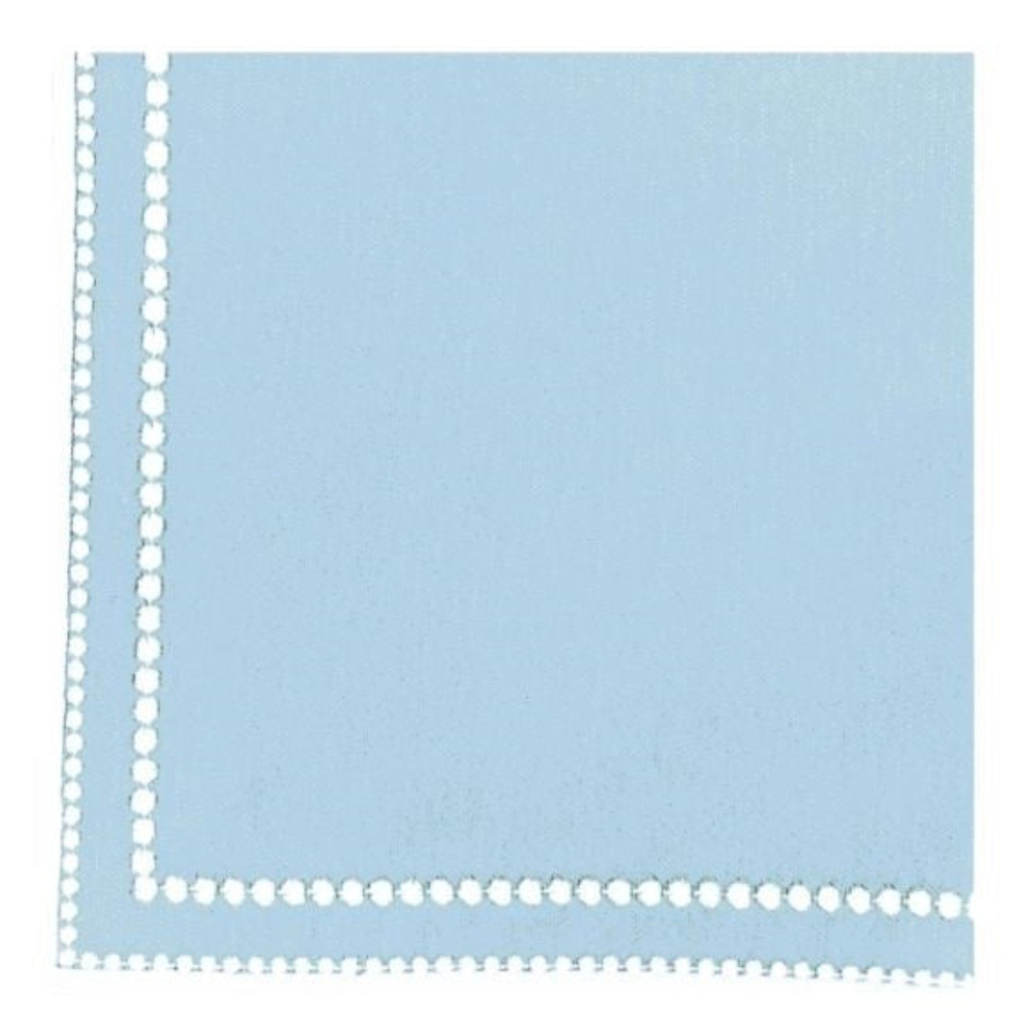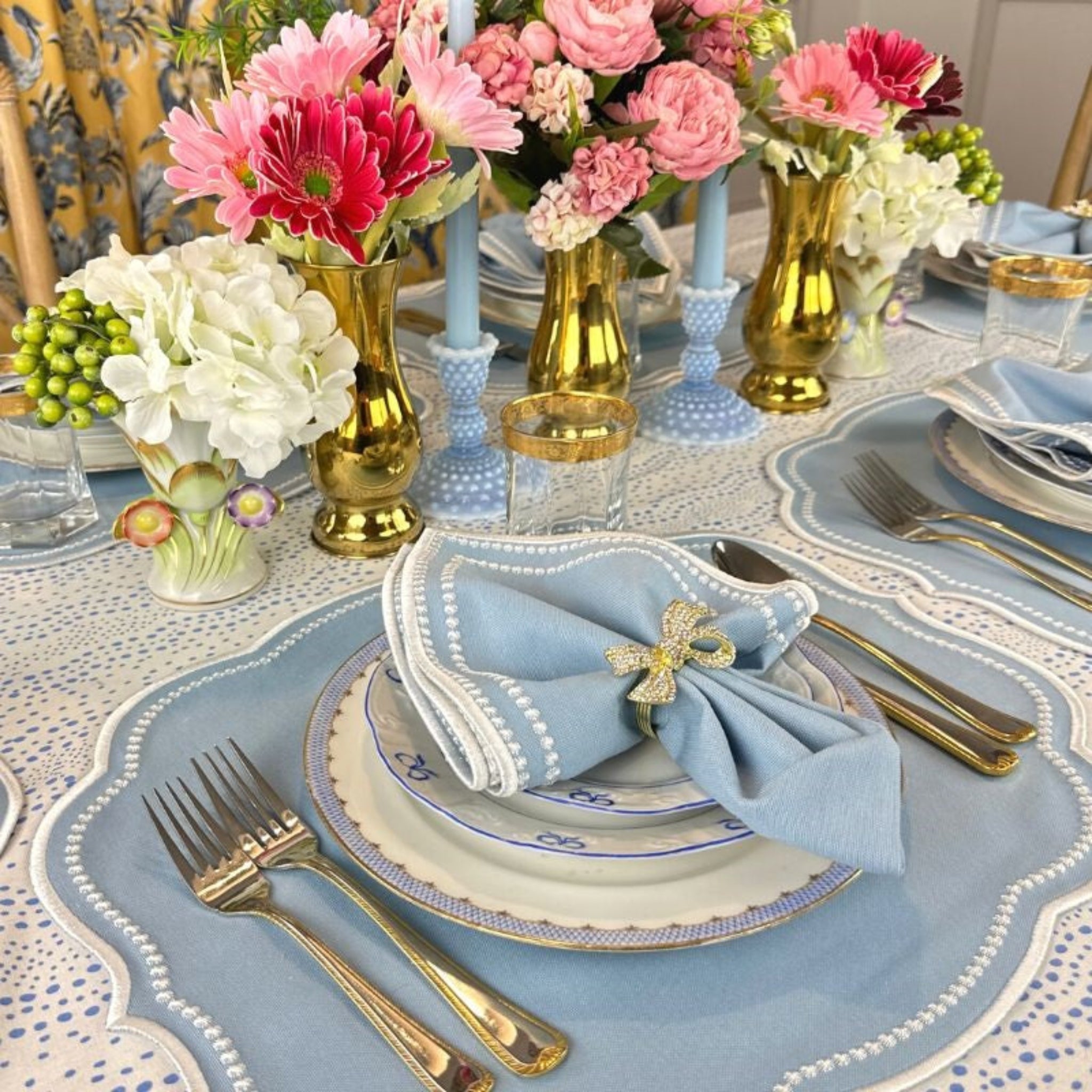 Add classic glamour to your table with our hand-crafted blue Charlotte Napkin with white embroidery. The luxurious feel of this napkin is meticulously crafted from a premium blend of cotton. Its stain-resistant properties ensure long-lasting beauty, while the intricate silk embroidery adds a touch of opulence that captures attention. Its versatile size caters to various table settings, creating a captivating visual impact that resonates with sophistication. Note: Computer or mobile screens can differ. The color of this item is blue with white embroidery. The white background of the picture can make the white embroidery look a little blue in the picture.