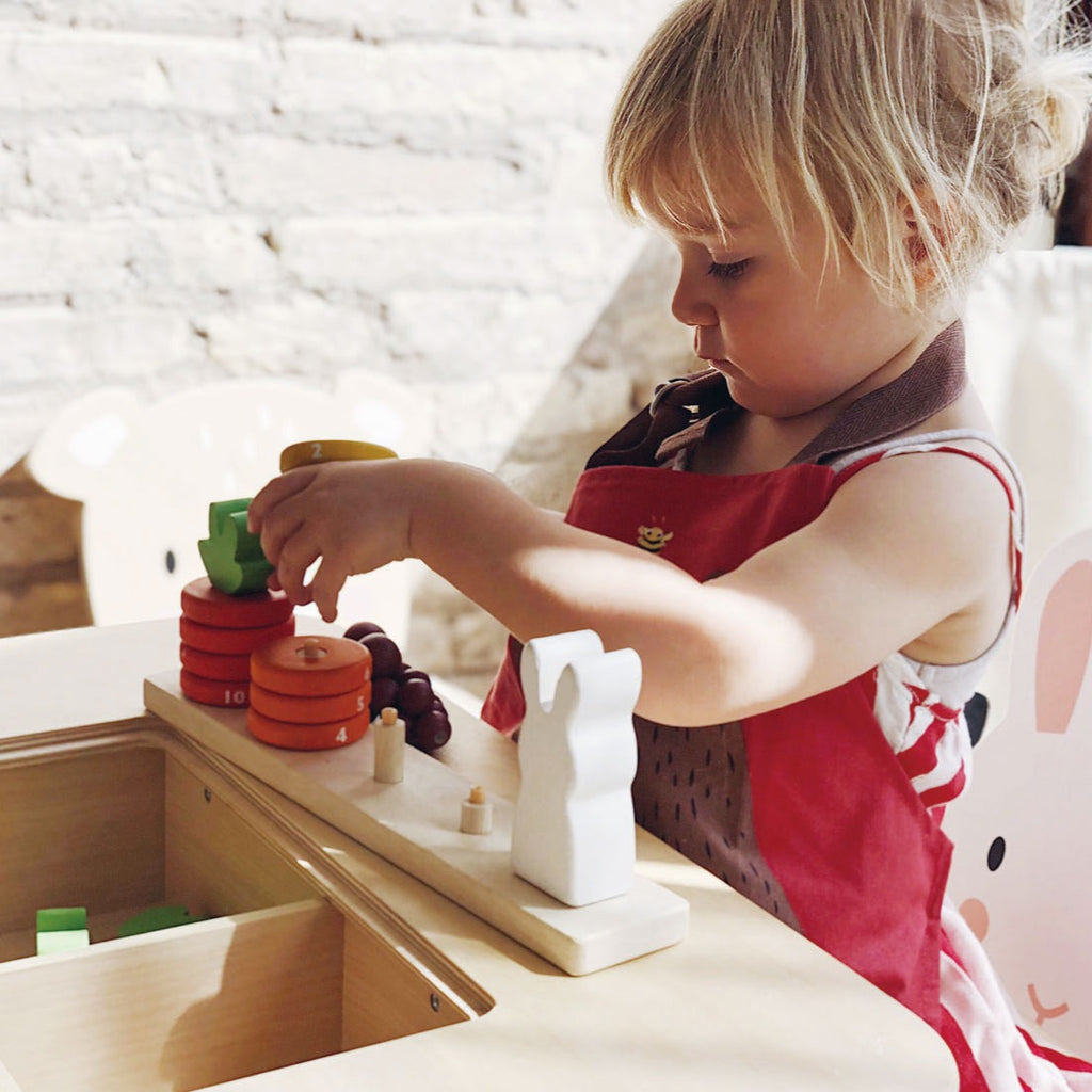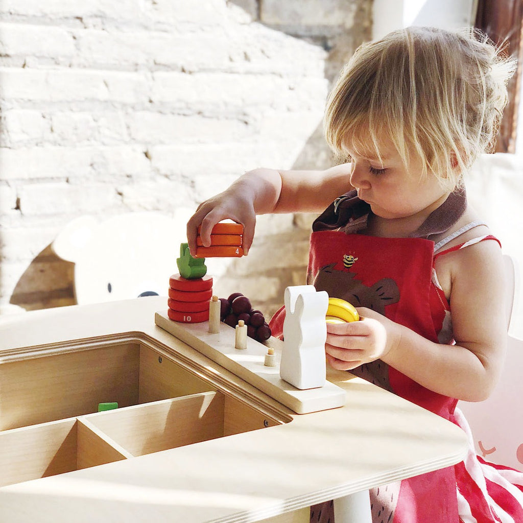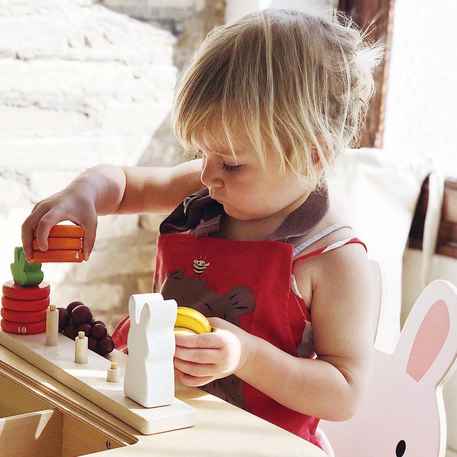 A sturdy plywood and rubberwood childrens table with a removable chalkboard central panel. When the panel is removed it reveals a hidden compartment to store pencils etc. 2 plywood and rubberwood childrens chairs with a bear and bunny faced back panel.