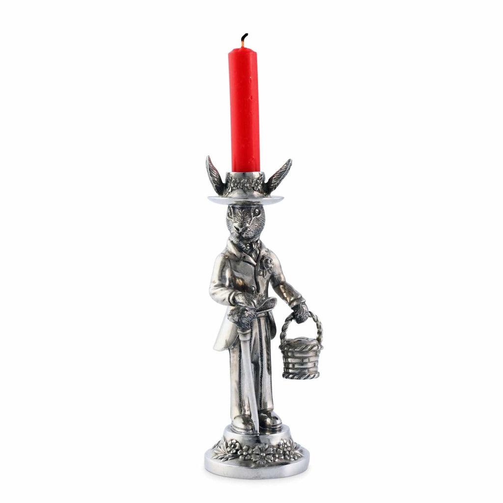 Impart whimsy and beauty to your home decor with this gentleman hare short candlestick. This highly detailed candlestick boasts sleek pewter construction for easy inclusion with existing silver tone pieces and room on top for your favorite taper candles.