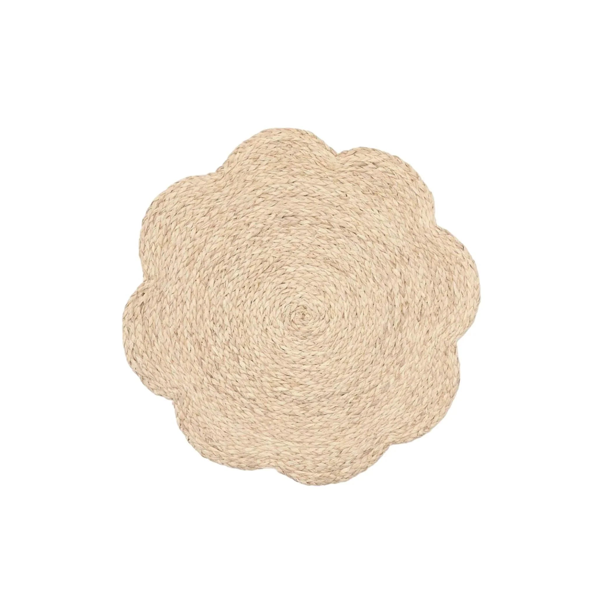 These lovely placemats usher in dining with their scalloped floral design. Natural woven bleached raffia is casually chic. Fun, sustainable, and great for al fresco dining.
