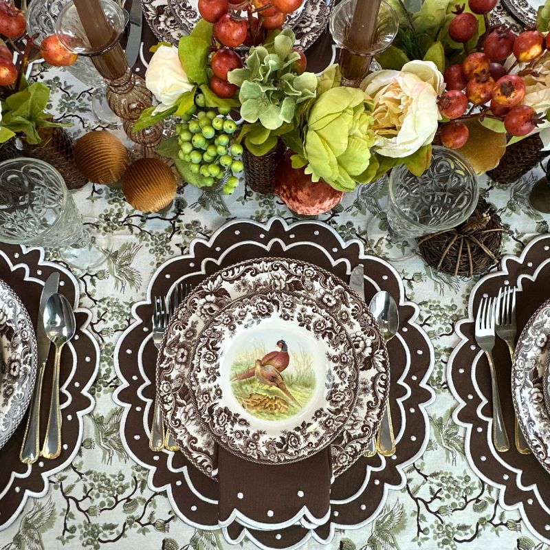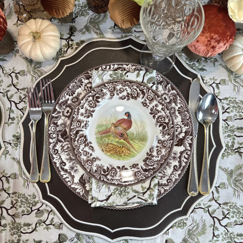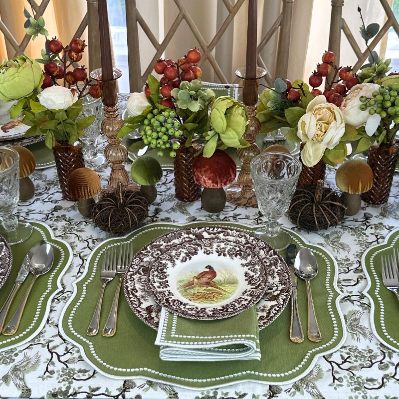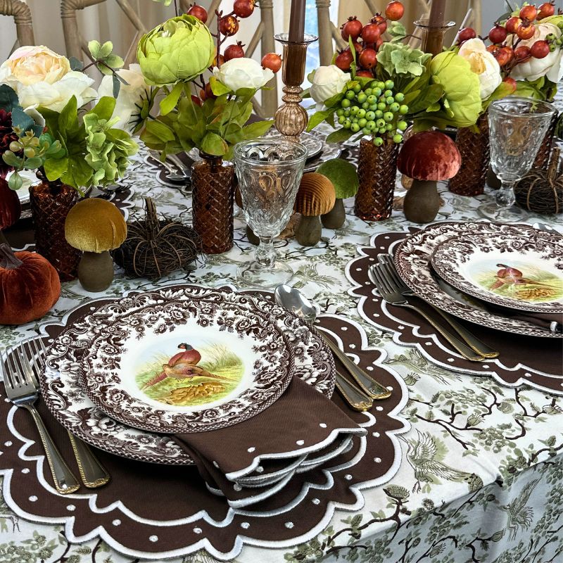 Transform your dining experience with the graceful beauty of sage birds perched on exquisite chestnut branches. This enchanting print brings a touch of nature's elegance to your table décor, creating a captivating ambiance for the season.