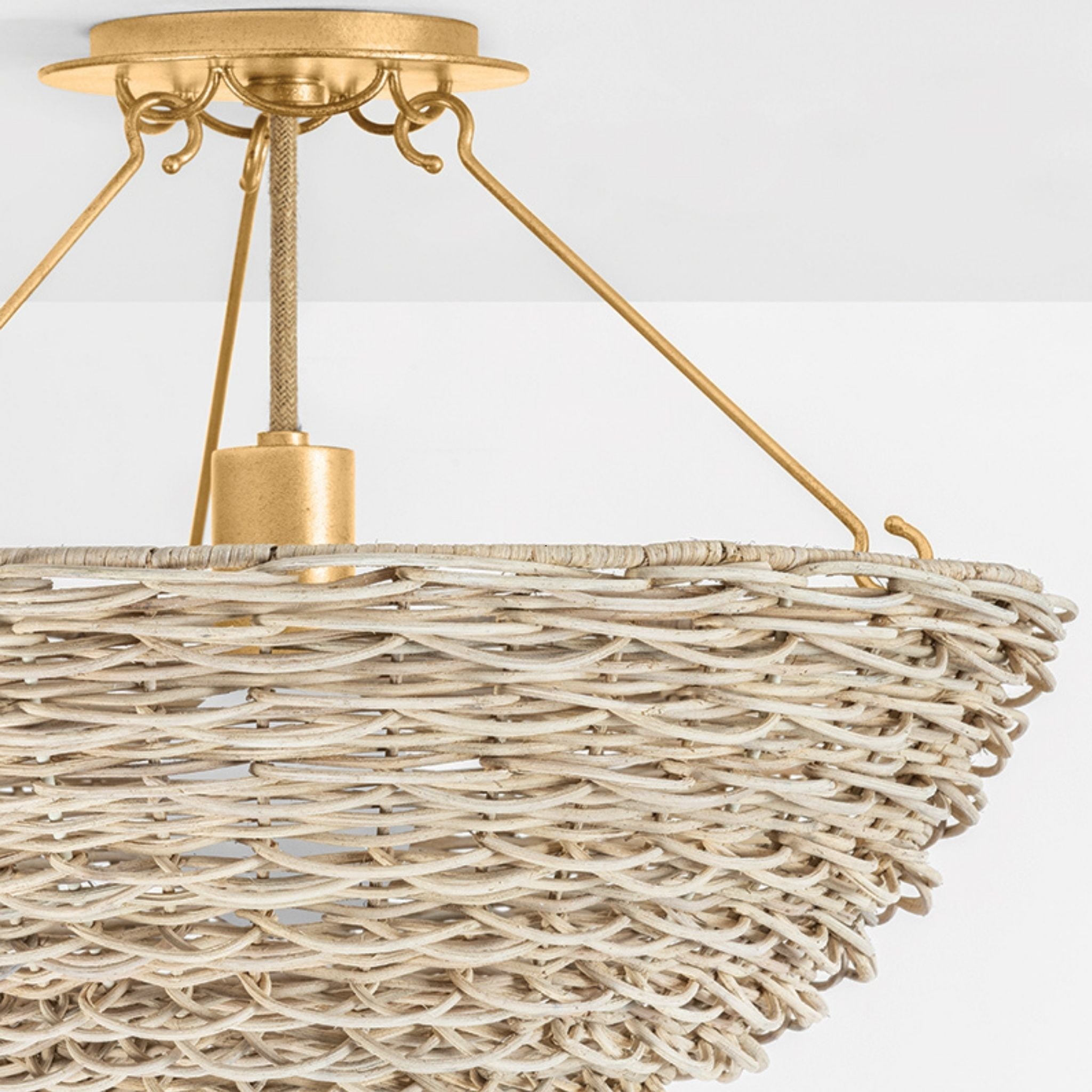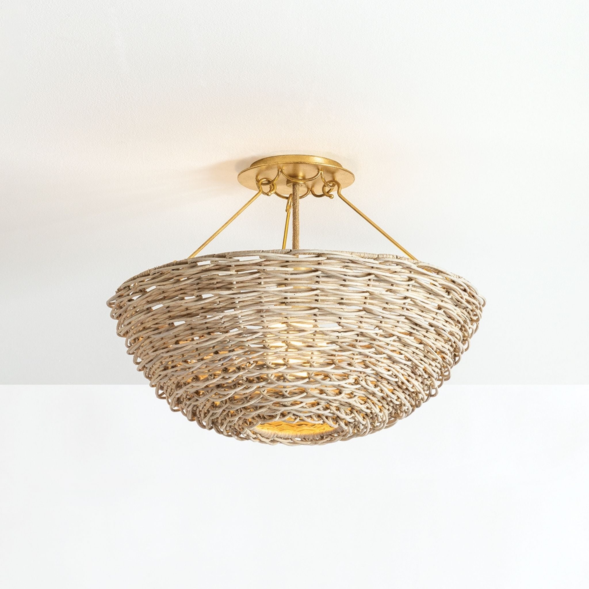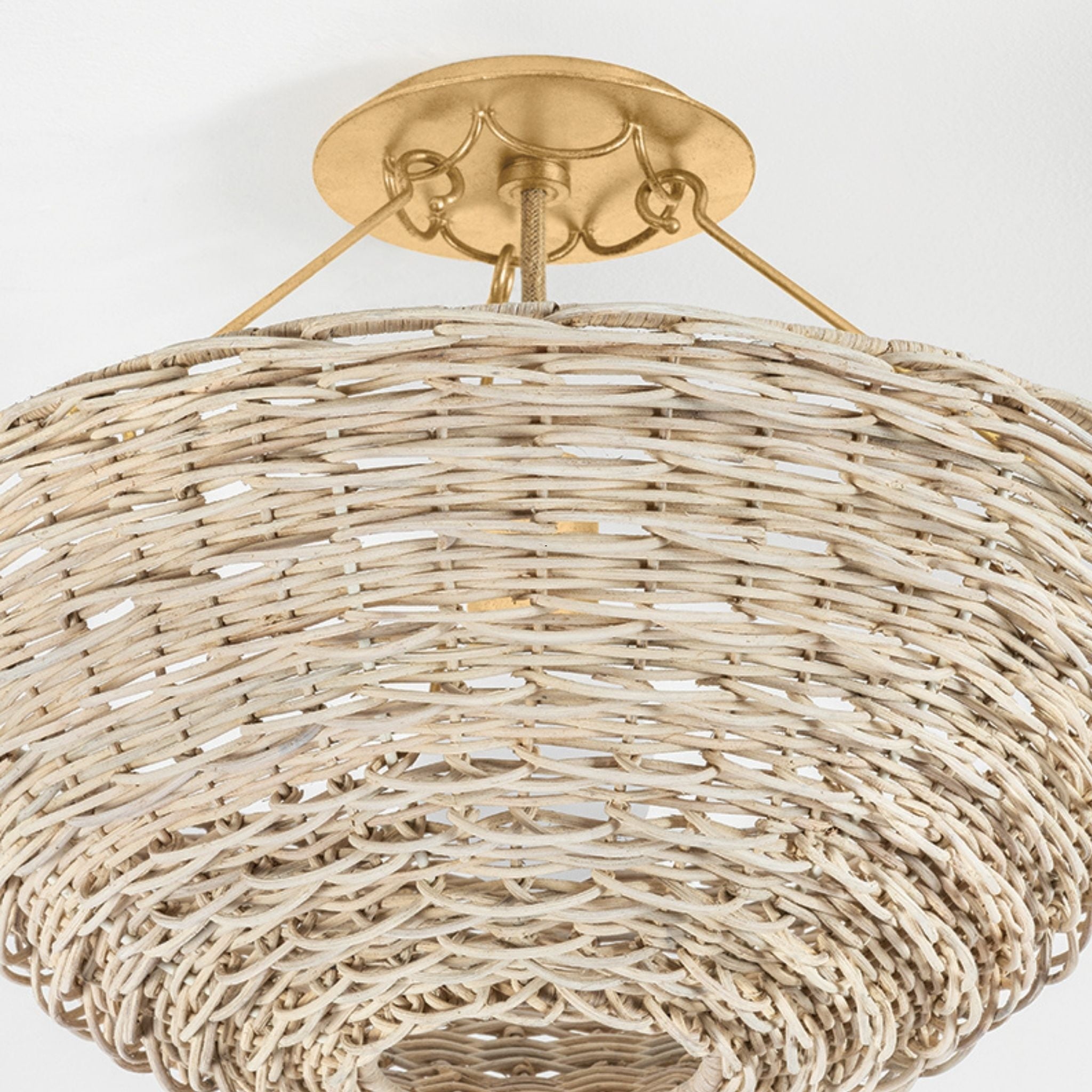 Woven in a unique scalloped pattern, the whitewash rattan of Campo makes for a highly textural and beautiful flush mount shade. The loose weave allows light to radiate through the negative space, casting mesmerizing lighting effects on the walls and ceiling. Vintage Gold Leaf metalwork supports the fixture, adding a touch of shine.