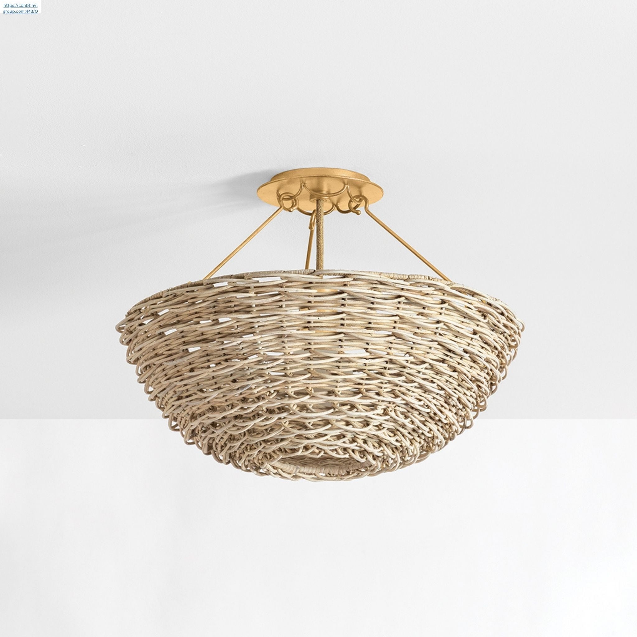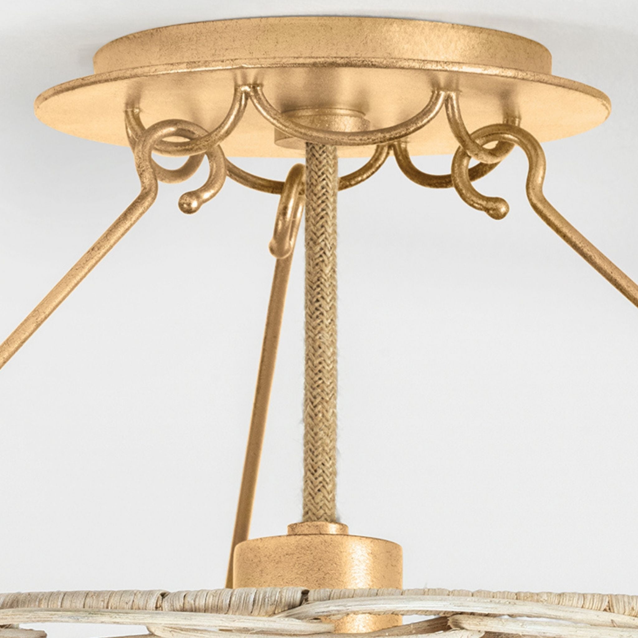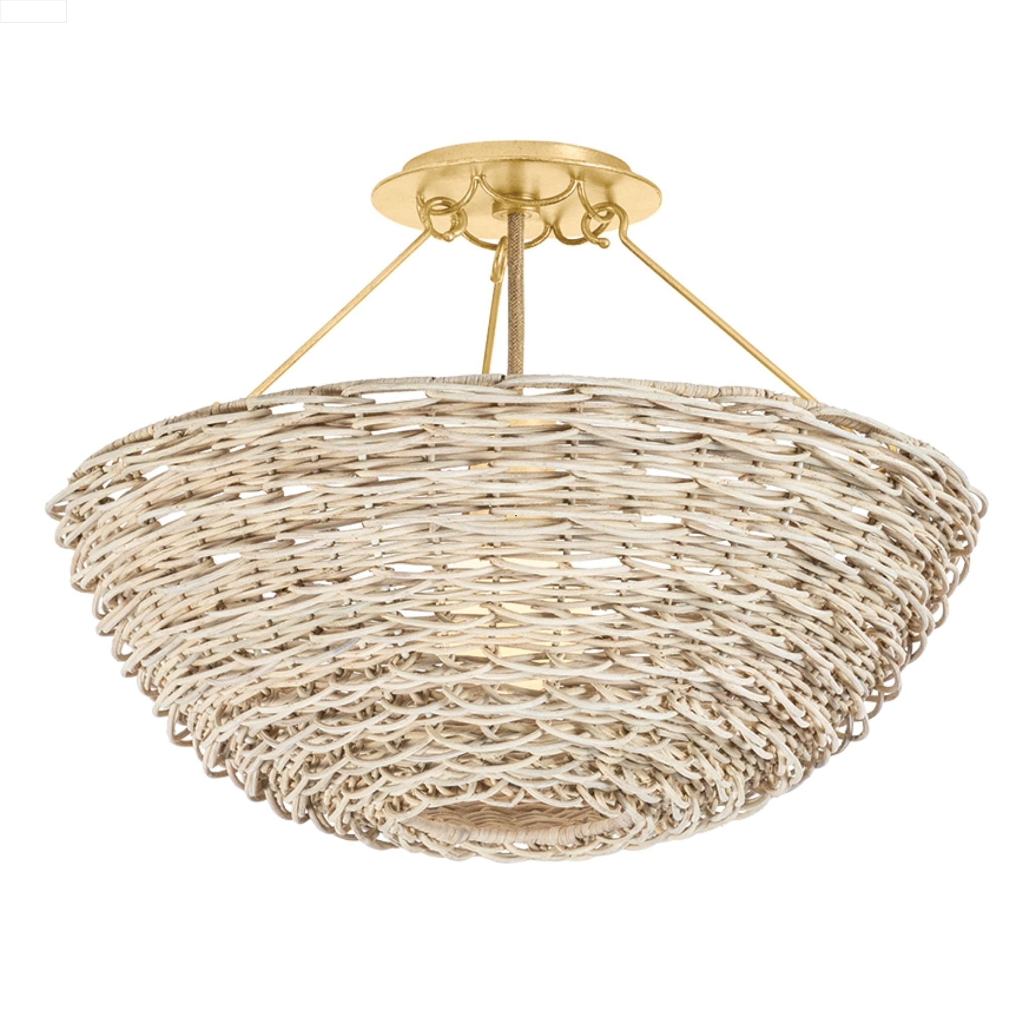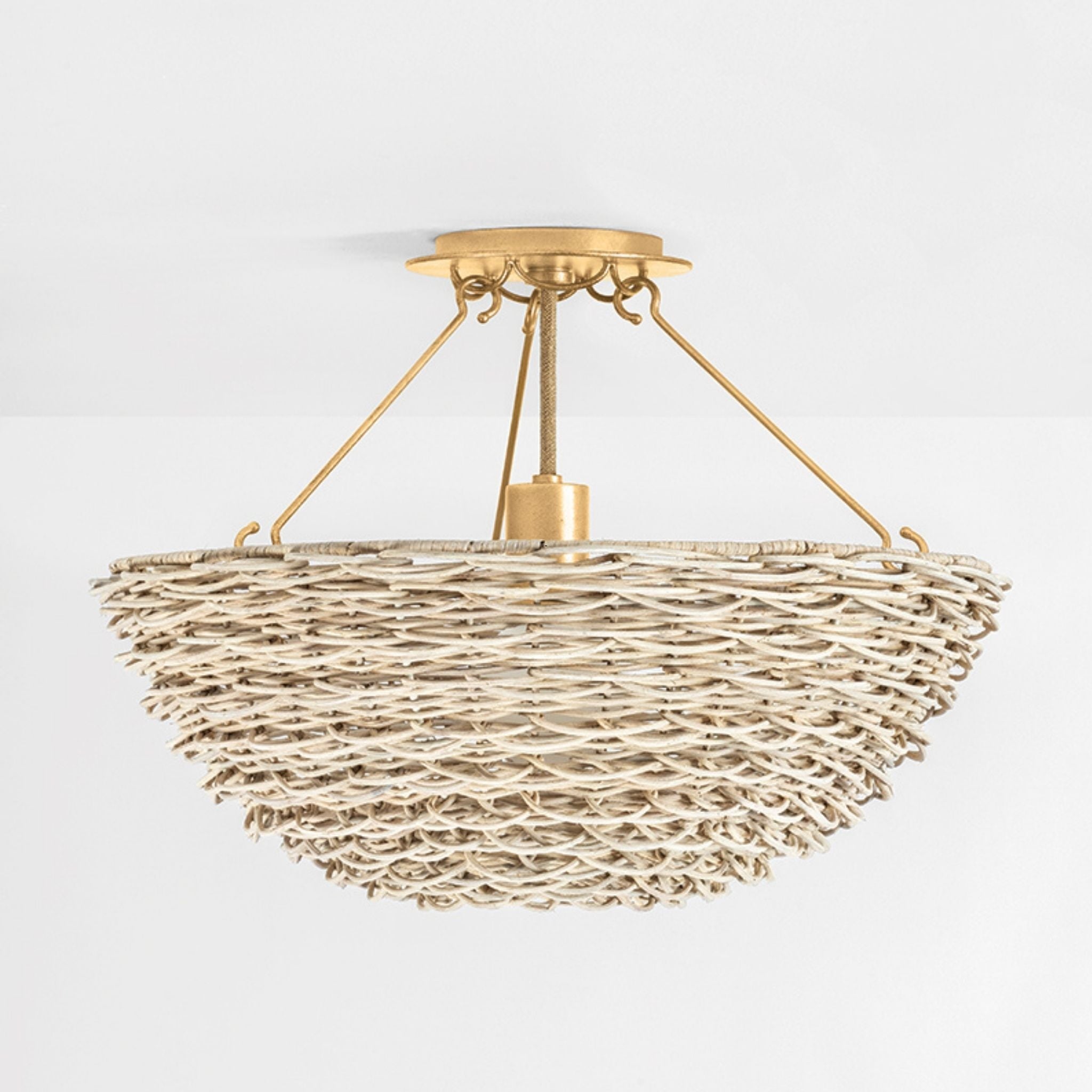 Woven in a unique scalloped pattern, the whitewash rattan of Campo makes for a highly textural and beautiful flush mount shade. The loose weave allows light to radiate through the negative space, casting mesmerizing lighting effects on the walls and ceiling. Vintage Gold Leaf metalwork supports the fixture, adding a touch of shine.