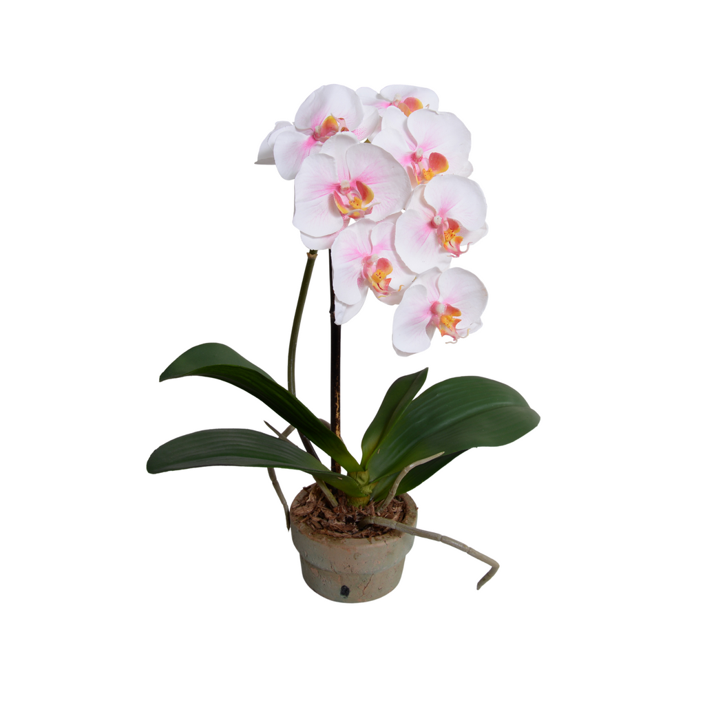This small faux Phalaenopsis Orchid plant is mounted 4" hand-built natural terracotta orchid pot. The realistic blooms with pink-white coloration is attached to natural black bamboo with a reproduction leaf spray with roots at the base, and finished with our signature artificial Durt® potting mix. Intended for Indoor Use.