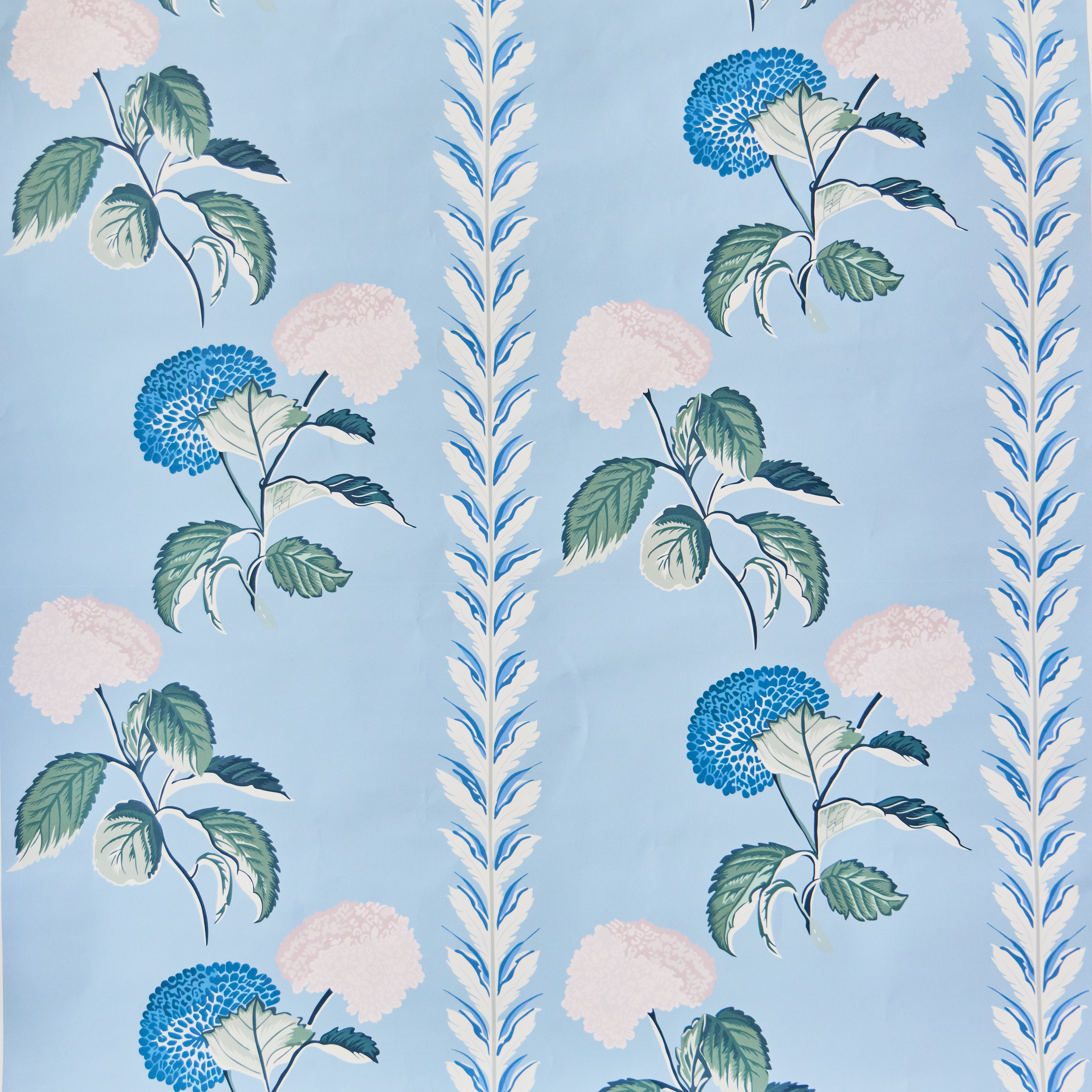 Designed by Melissa Hawks exclusively for The Well Appointed House, this elegant wallpaper features blooming hydrangeas in soft pink and coastal blue, framed by painterly leafy stripes. A graceful balance of formality and freshness, it brings a breezy sophistication to traditional interiors.