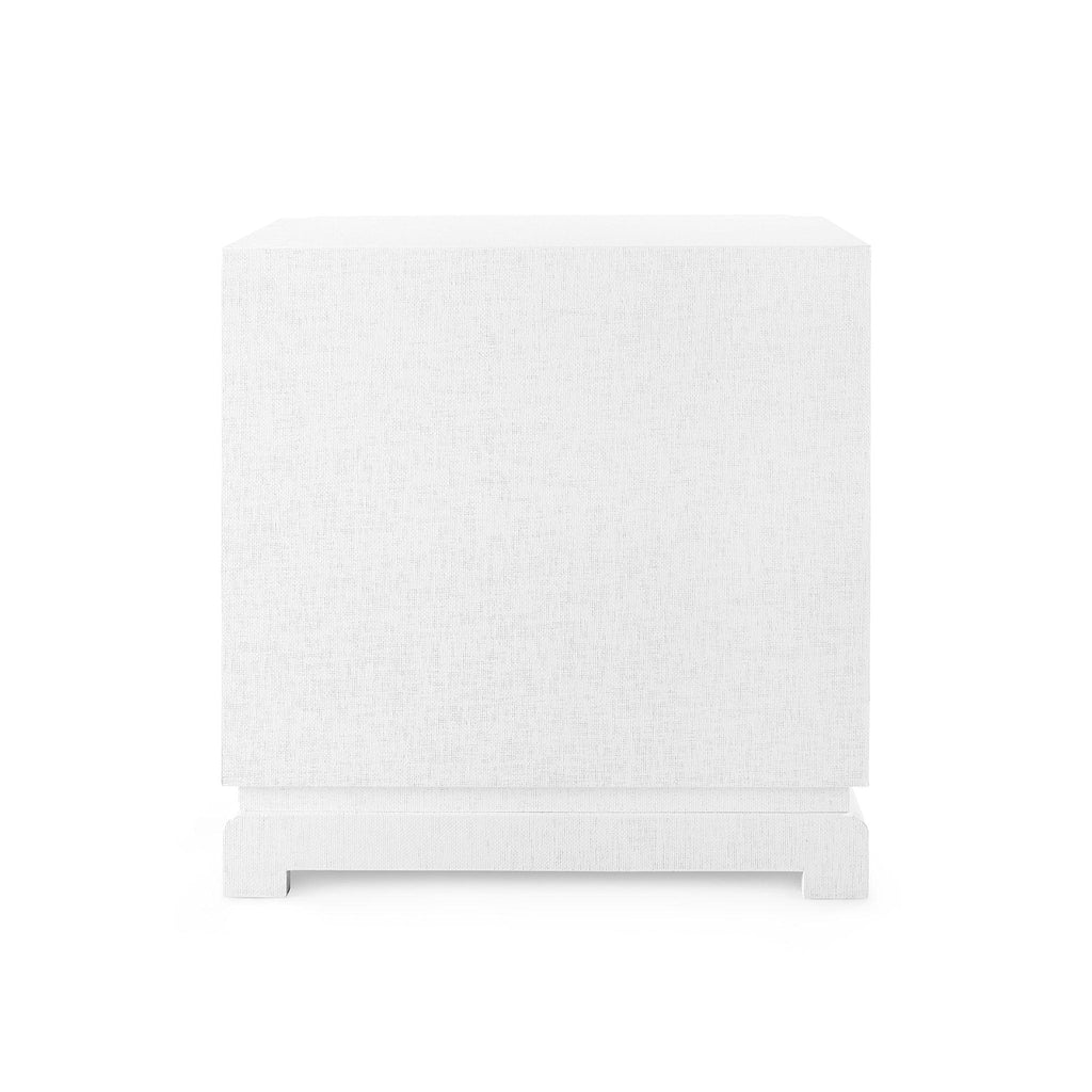 The Pavel Side Table features lovely and unique elements, such as drawers projecting from a cantilevered base and receding sides that are reminiscent of Art Deco styles. The rounded columns on the Pavel pieces gives an added element of piazza, along with the chunky base. This table comes together with a gorgeous and fresh grasscloth texture, complimented by ring pulls.
