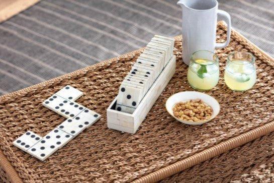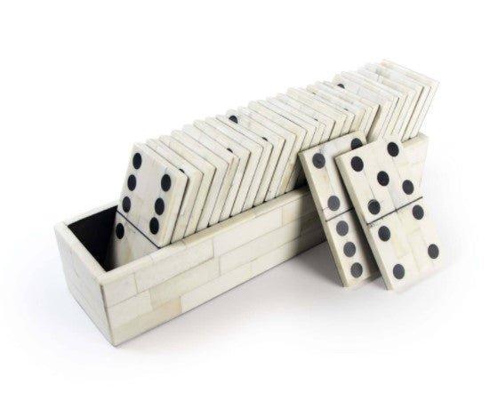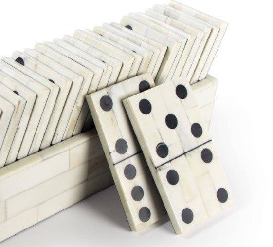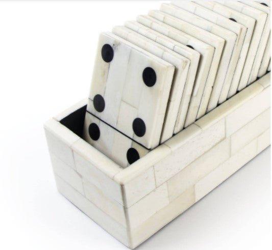 A beautiful piece of functional decor, this Domino Set is anything but ordinary. The domino pieces are real, white bone with black dots and their case is made from fragments of bone that have been shaped into tiles and inlaid by hand to create a rich mosaic look. Place on a side table, coffee table or bar top for decor that also functions as a classic game to thrill guests. Click on images for greater detail.