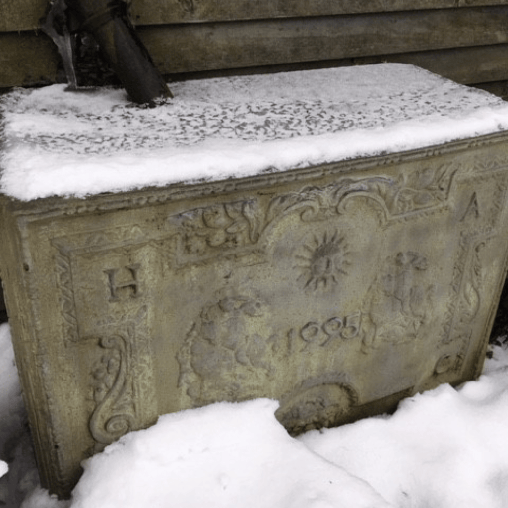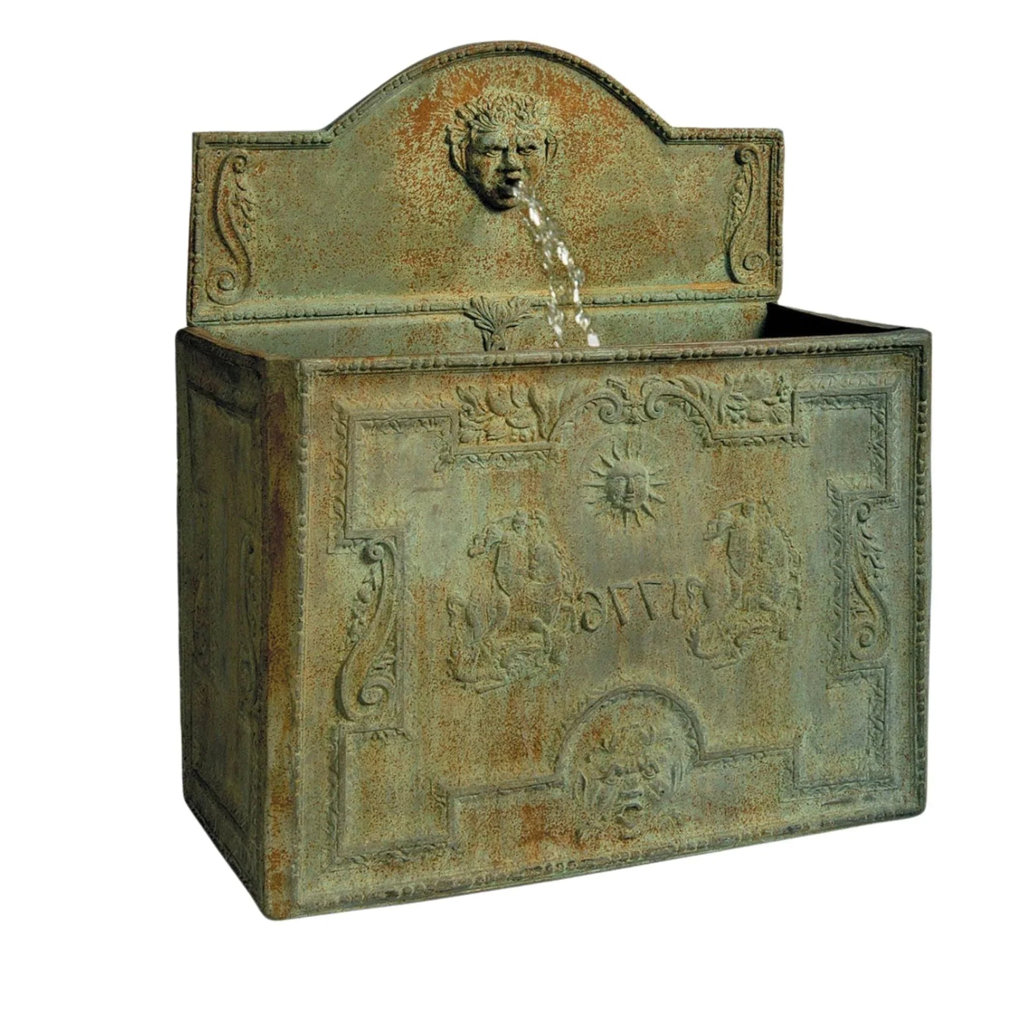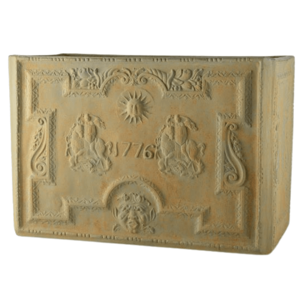The medieval legend of George slaying a dragon to rescue an innocent maiden is represented on this fine water tank with the initials 1776. The tank is made from fiberglass and can be personalized with bespoke initials, dates, or even crests. There is an optional backplate available to transform the tank into an atmospheric water feature. The back plate rests on the top of the tank and needs to be placed against a wall or fence for additional support. For additional finish options, please contact customer service. The tank is made from very durable fiberglass. There is a photo here of one of our tanks dating back to 1995, taken on a freezing cold day with temperatures down to -5, and the tank still looks fabulous!