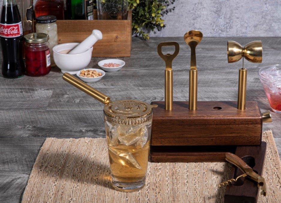 Tools include: Jigger, Spoon, Strainer, and Bottle Opener