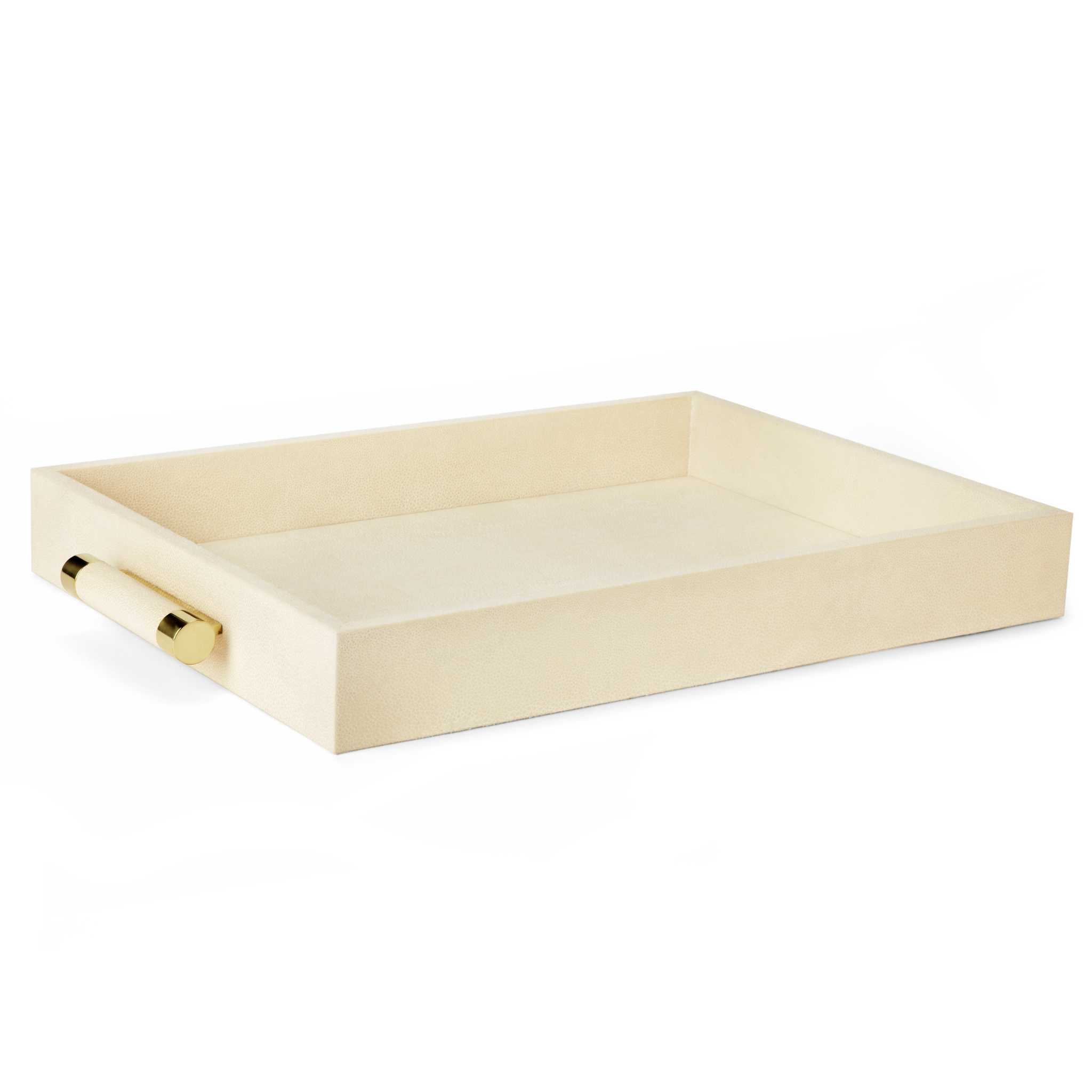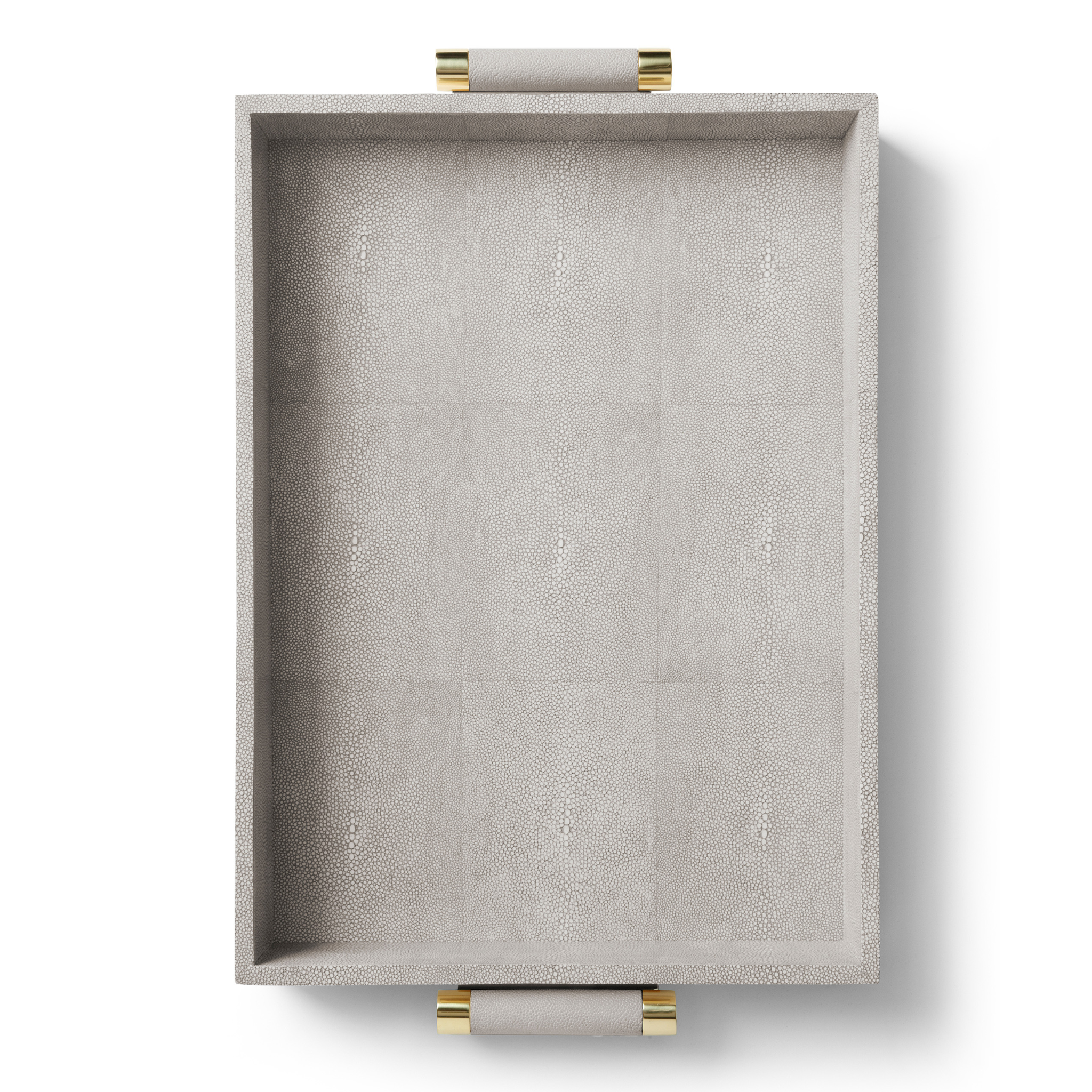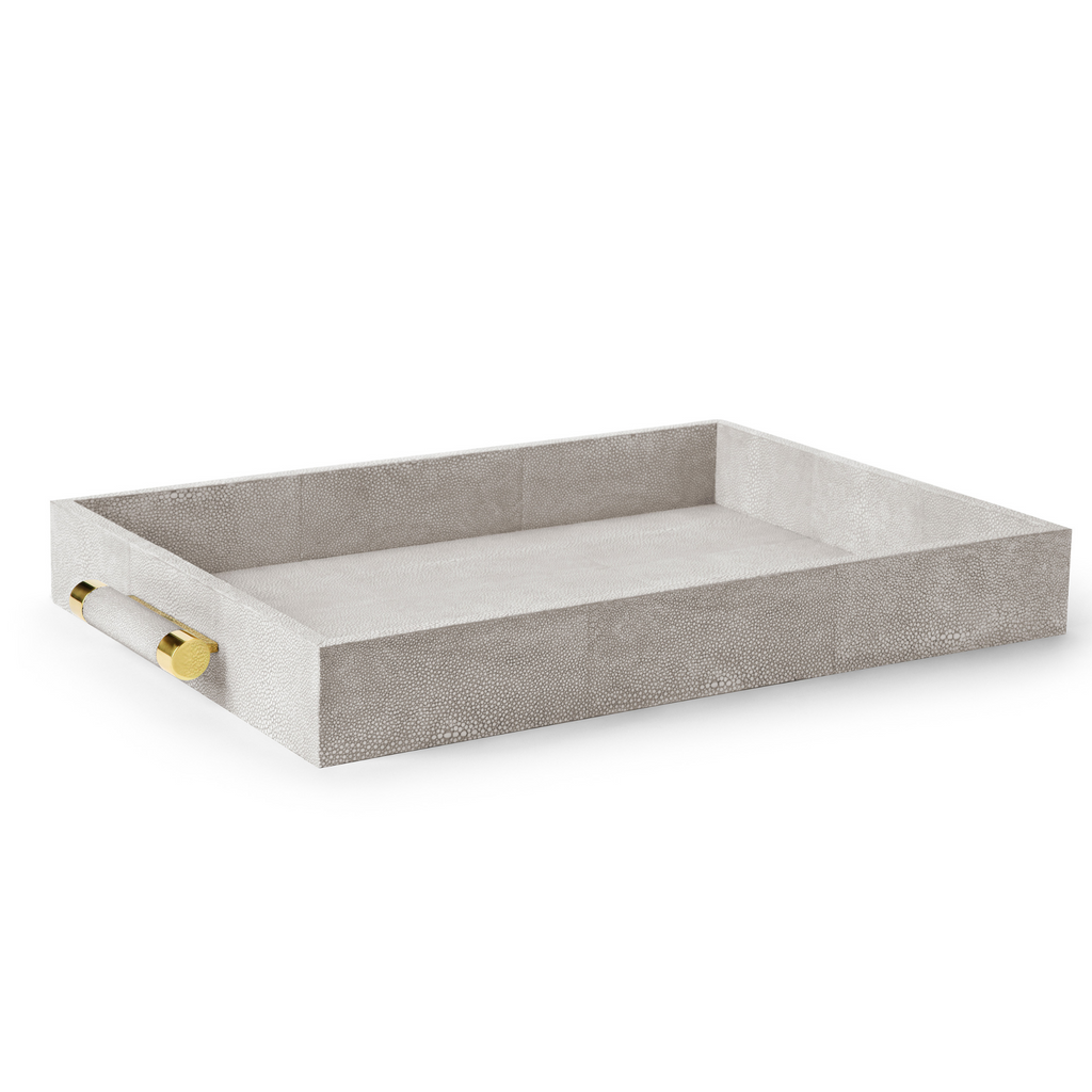 This serving tray features a delicately embossed shagreen pattern, while its brass handles add a luxurious feel. It is perfect for a casual gathering, an elegant dinner party or organizing personal objects.