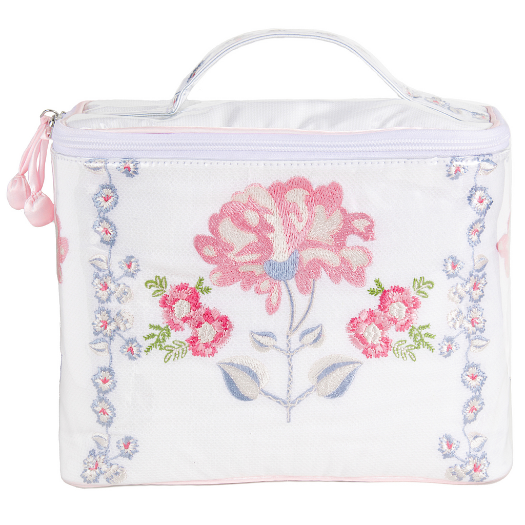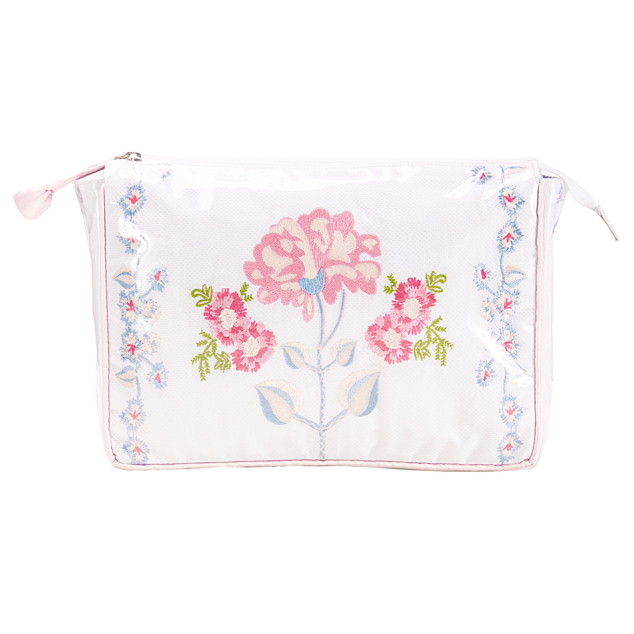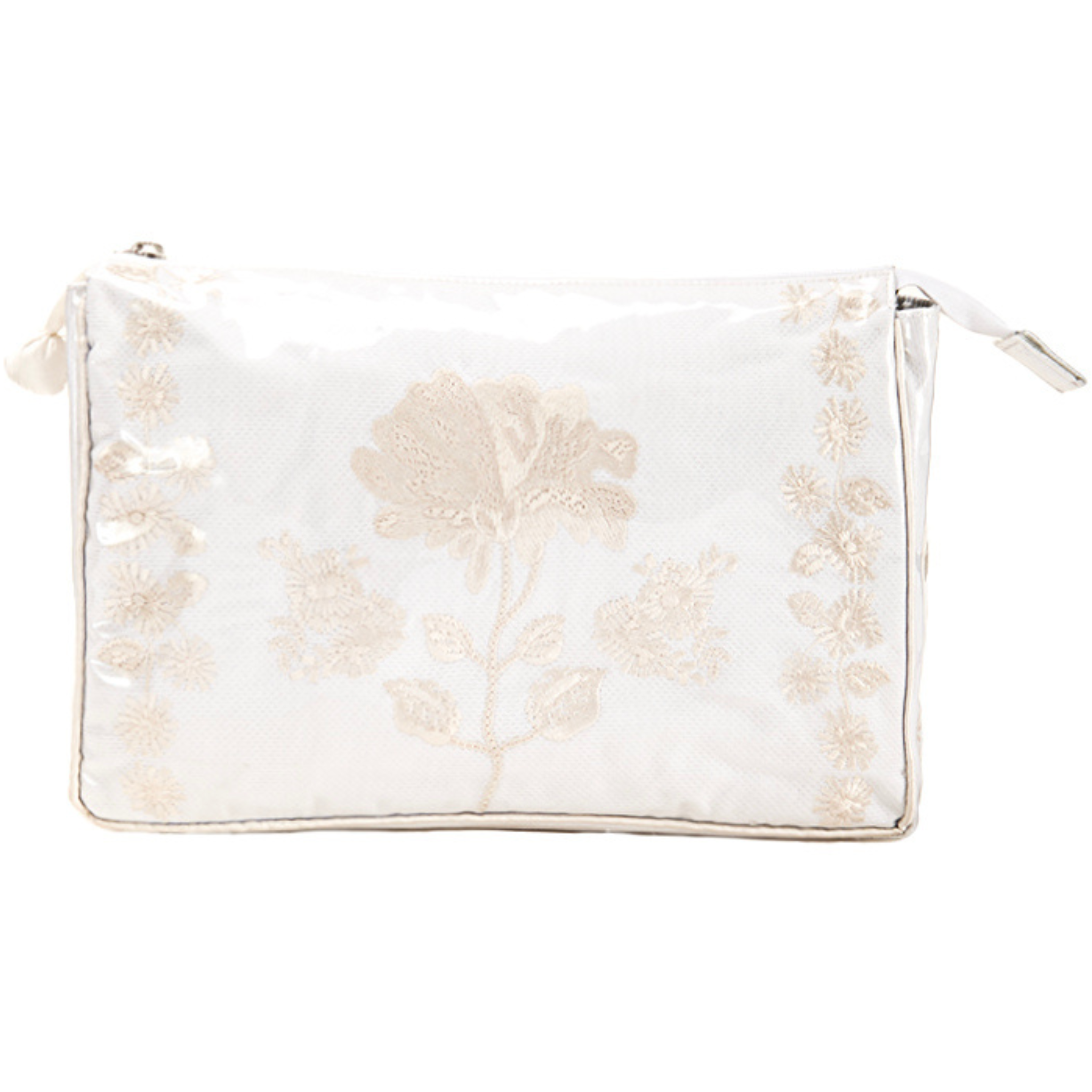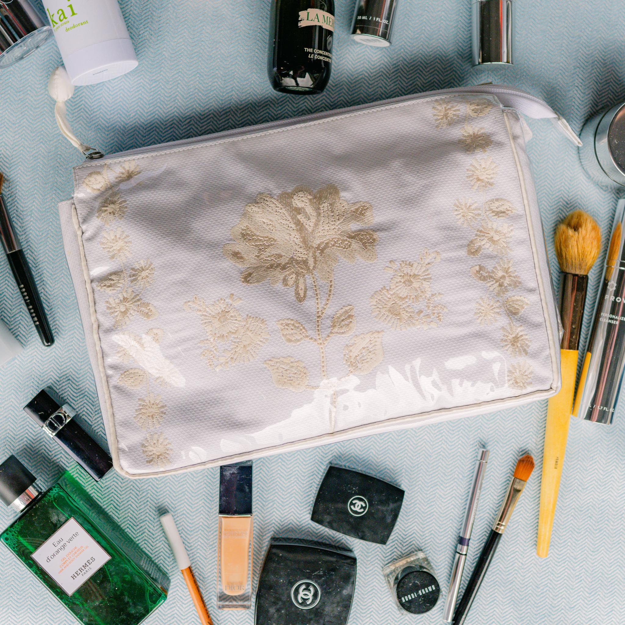 Our Embroidered Make Up Bag bridges the gap between our Train Case and Small Cosmetic Bag. This bag provides enough room to stow away all your beauty essentials, meaning you don't have to skip or modify a single step in our regular routine. It's also wrapped and lined in a clear, water resistant material that makes for easy cleanup while protecting against smudges and stains.