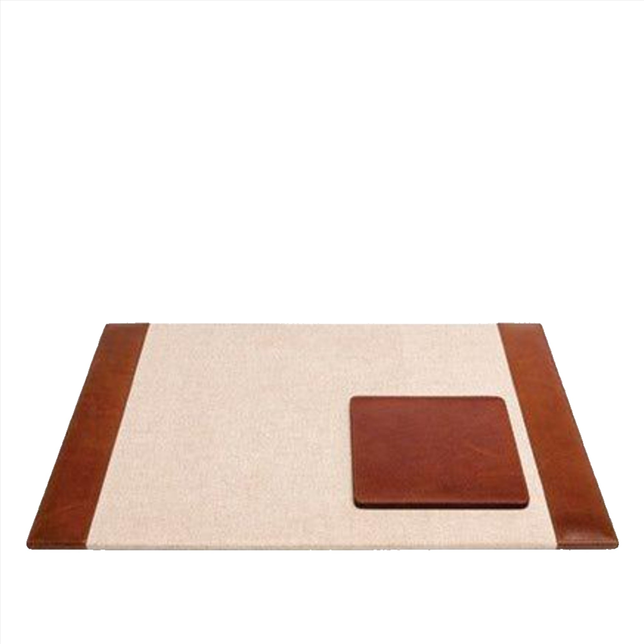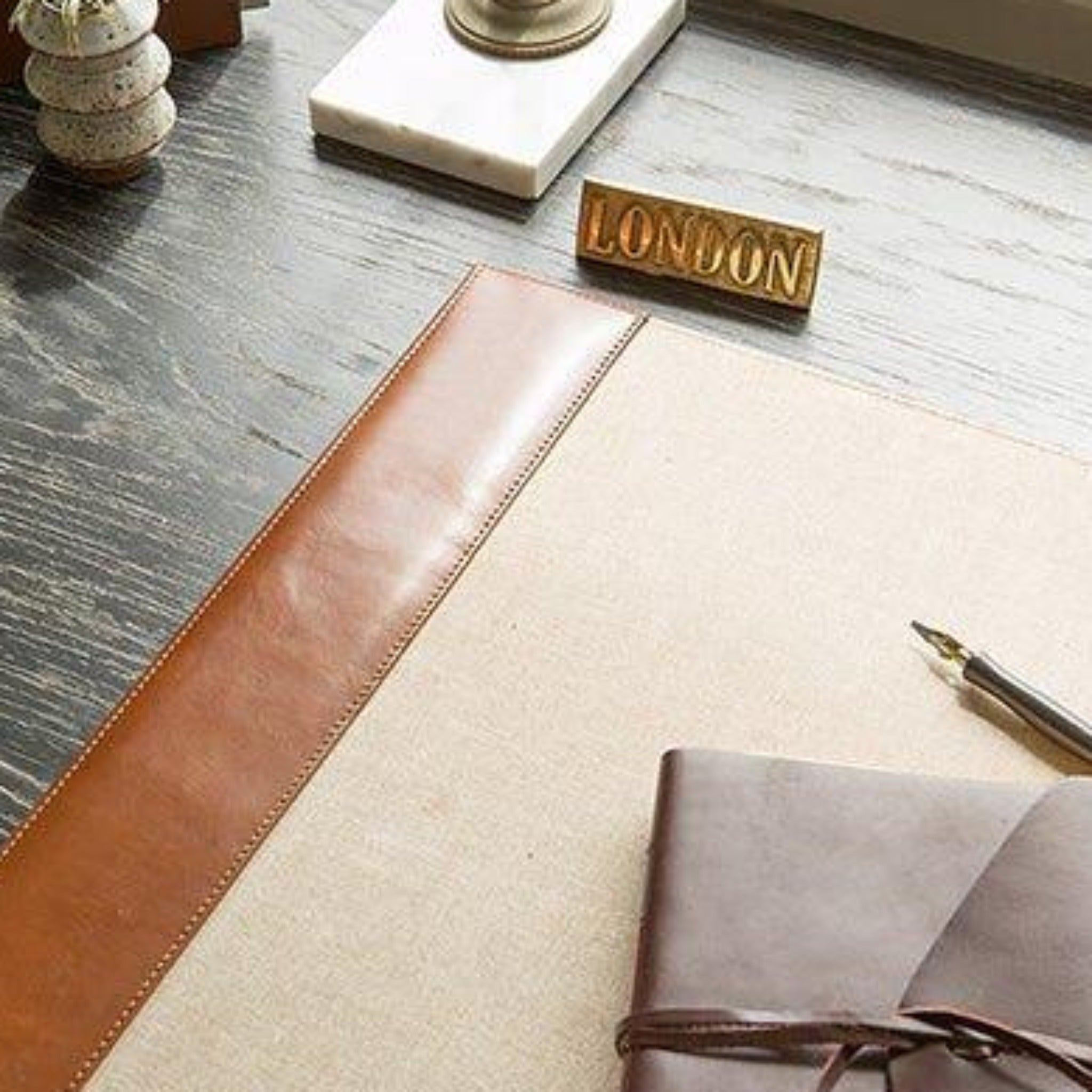 The deep brown of the Stirling’s tobacco leather pops against its natural chambray interior. A stately desk set for a tailored space. The set includes desk blotter and mouse pad. Desk Blotter measures 30"L x 18.5"W x 0.5H, Mouse Pad measures 9.5’’L x 8.5’’W x 0.5”H. Please note that there is a 25% restocking fee to return this item, plus the cost of return shipping. Click images for greater details.