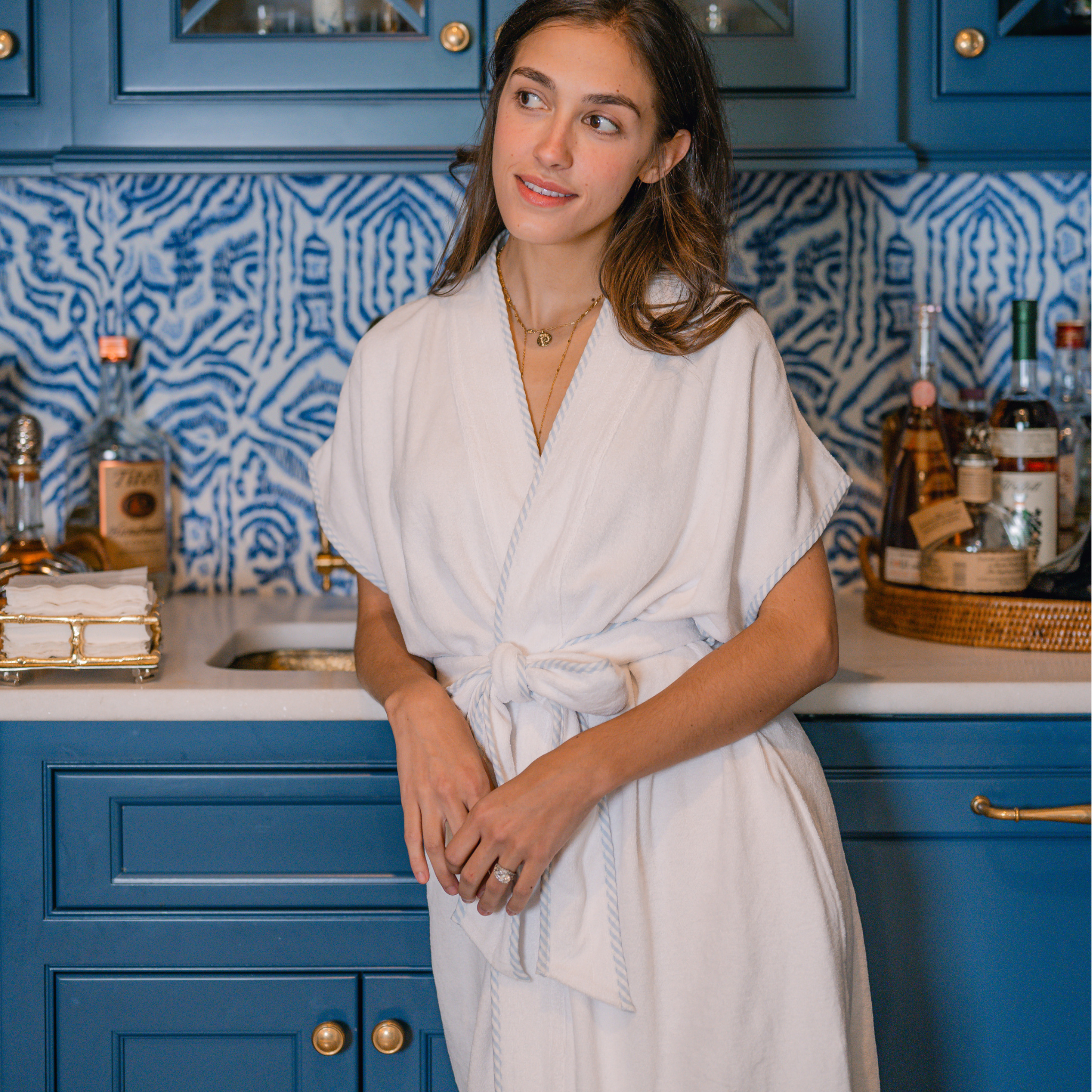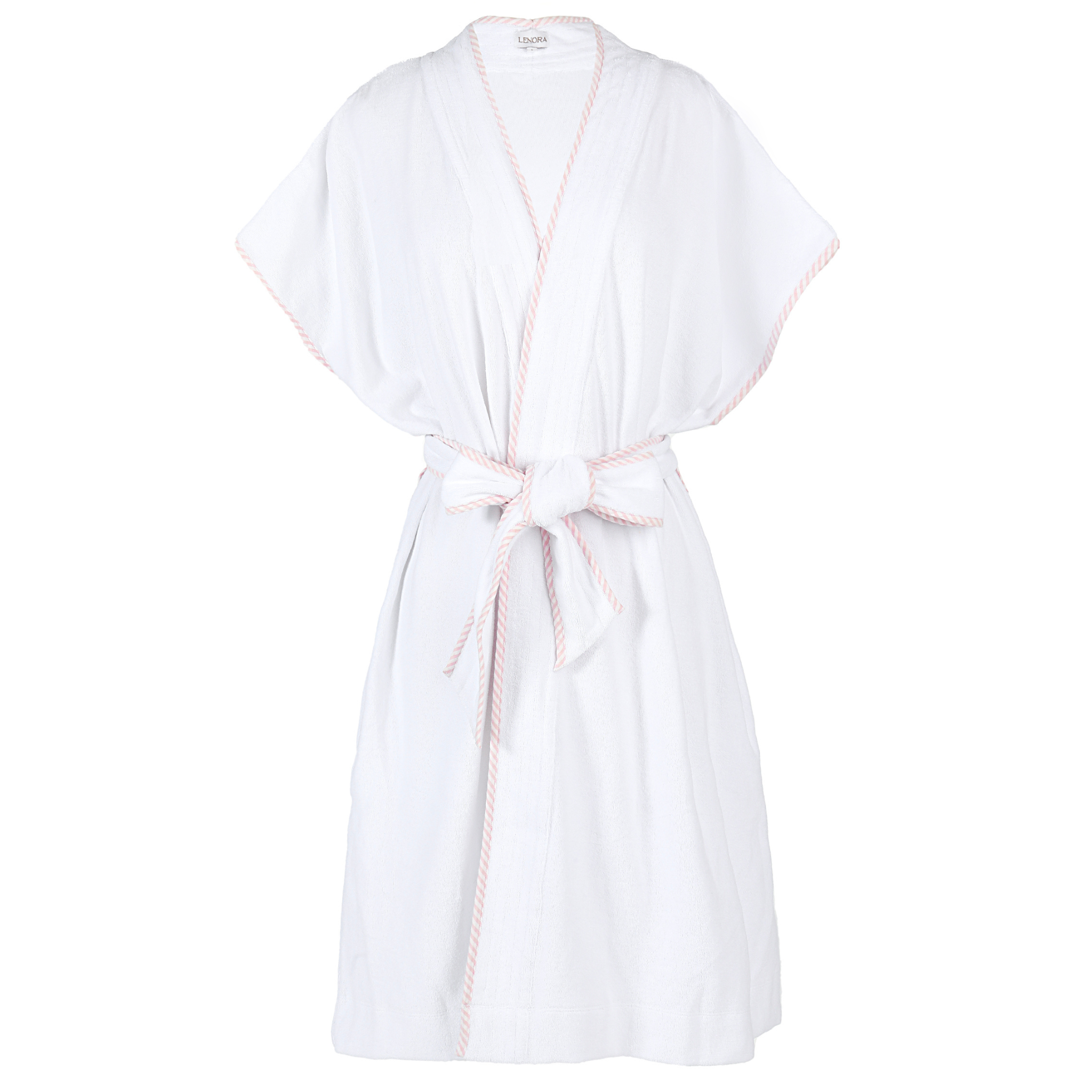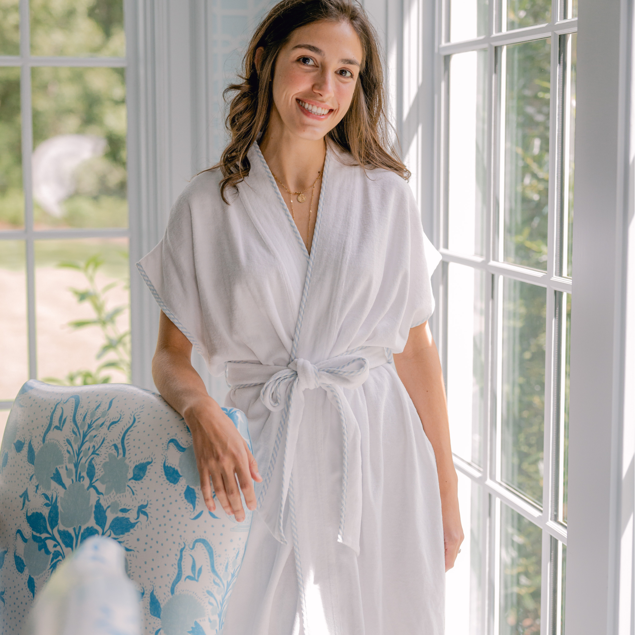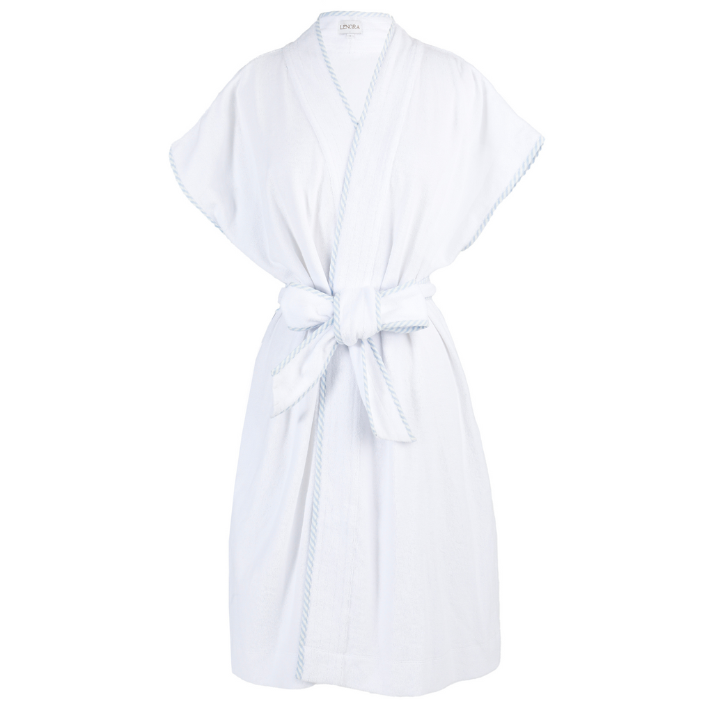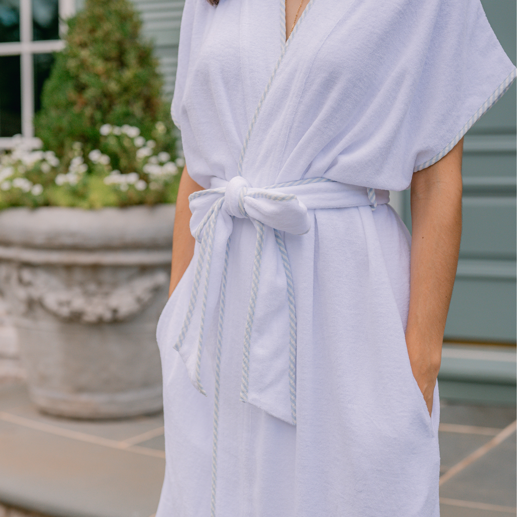 Our Terry Robe is a breezy loungewear essential that combines comfort and style. Crafted from plush cotton terry and trimmed with charming seersucker, this robe is designed to hit above the knee, offering a flattering and versatile silhouette. The cap-sleeve kimono style enhances its lightweight feel, making it ideal for summer or year-round use.