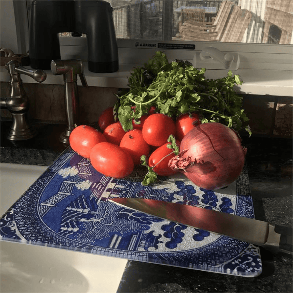 Blue Willow Glass Cutting Board, Available in Two Different Sizes