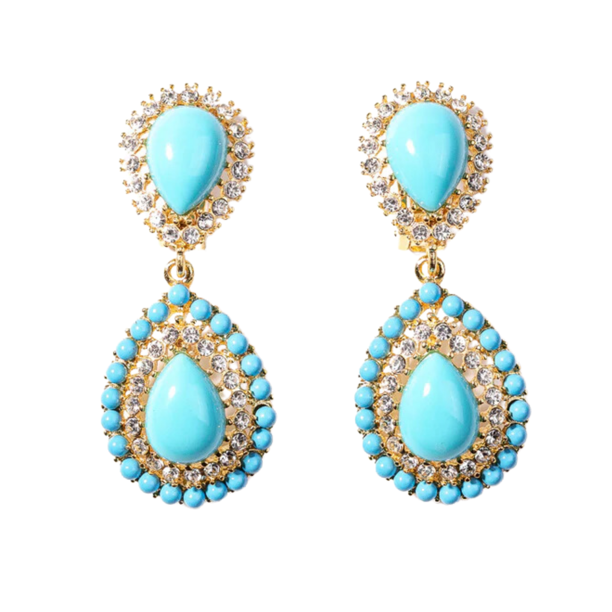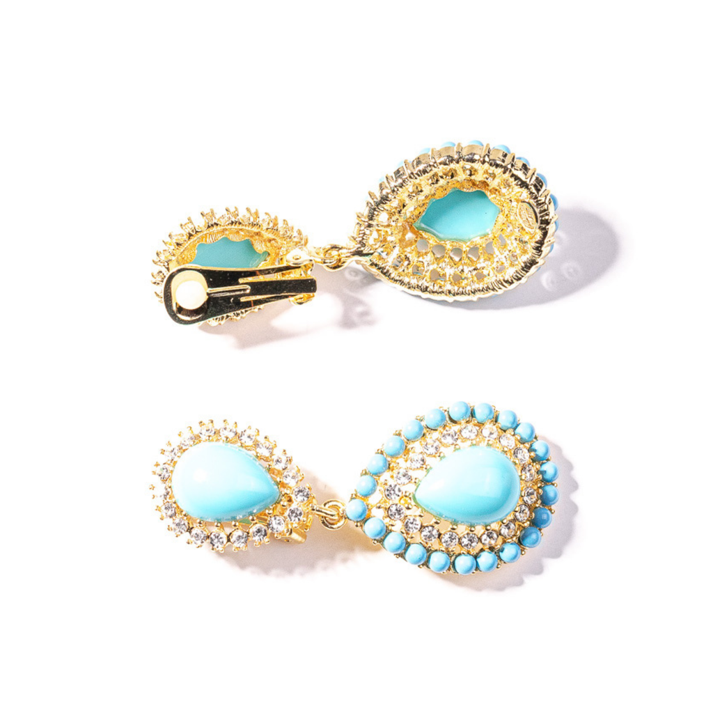 Turquoise cabochon centers drop clip earring with gold and crystal have the perfect balance between color and sparkle.