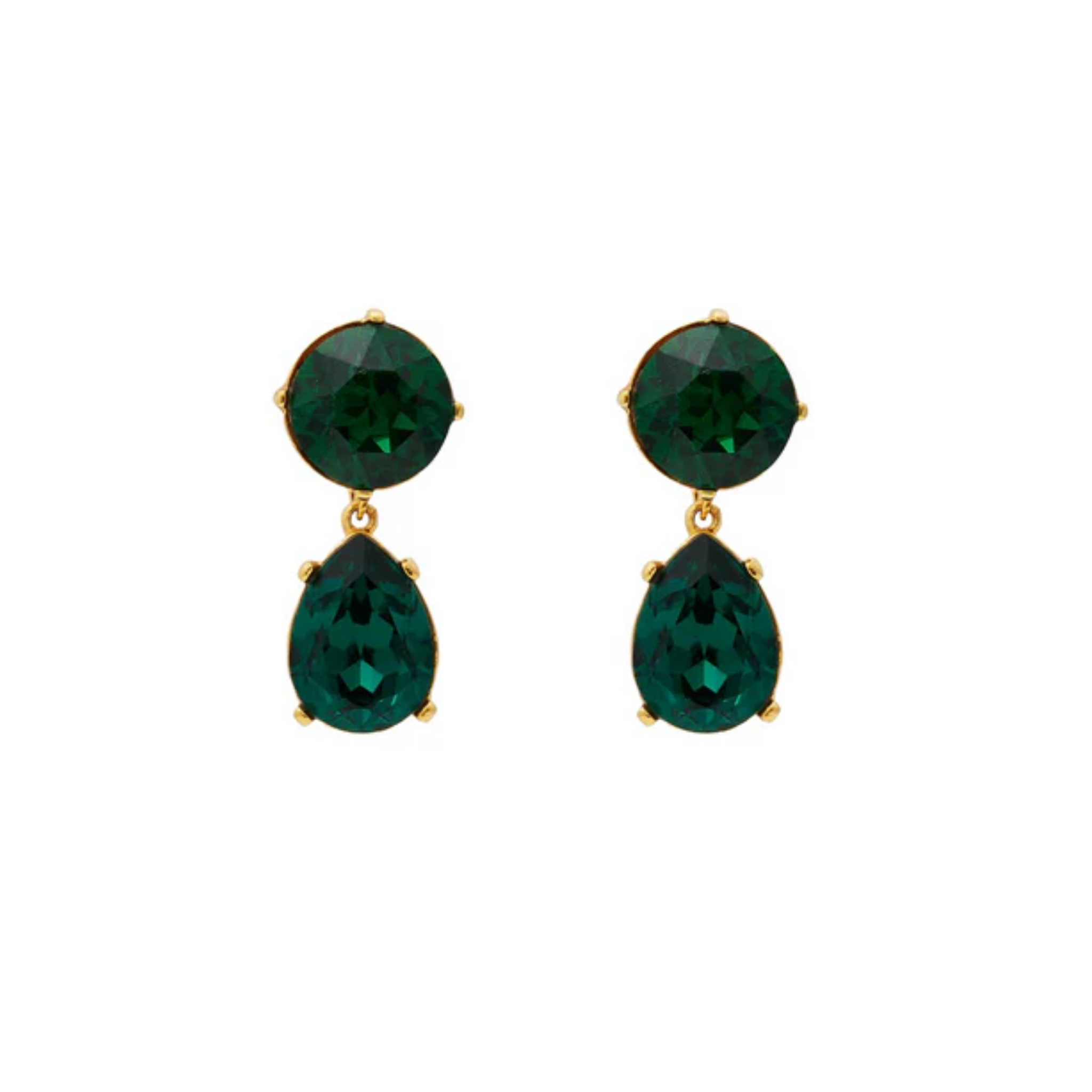 Each teardrop-shaped earring is adorned with rich, emerald-inspired stones, meticulously faceted to capture the depth and vibrancy of genuine emeralds. The warm gold setting enhances the lush green hues, creating a harmonious symphony that mirrors the opulence of precious gemstones.