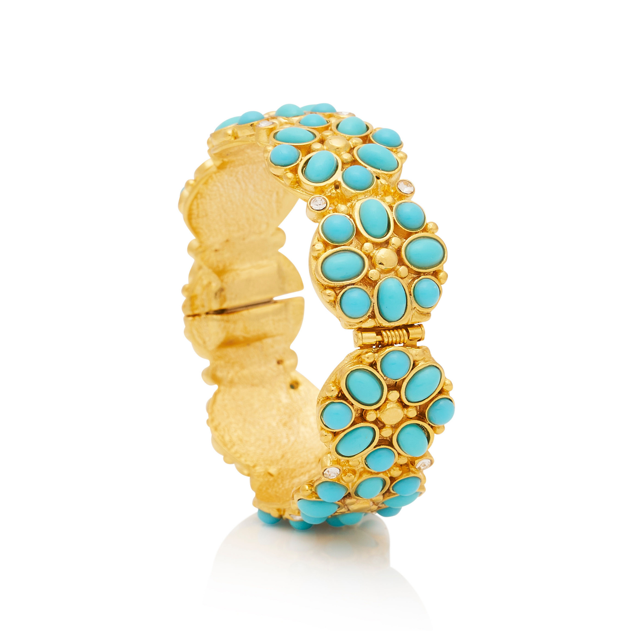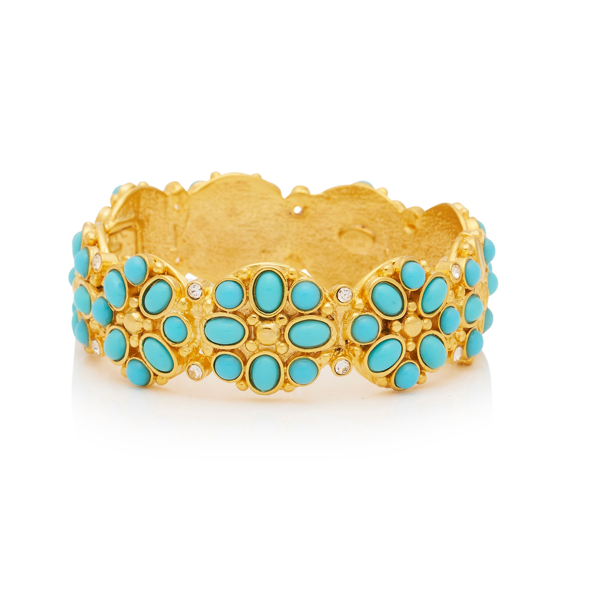 The centerpiece of this bracelet is a series of exquisite turquoise stones, each meticulously set within a radiant gold-tone frame. The vibrant turquoise hues evoke the natural beauty of the sea, adding a touch of refreshing color to your ensemble.