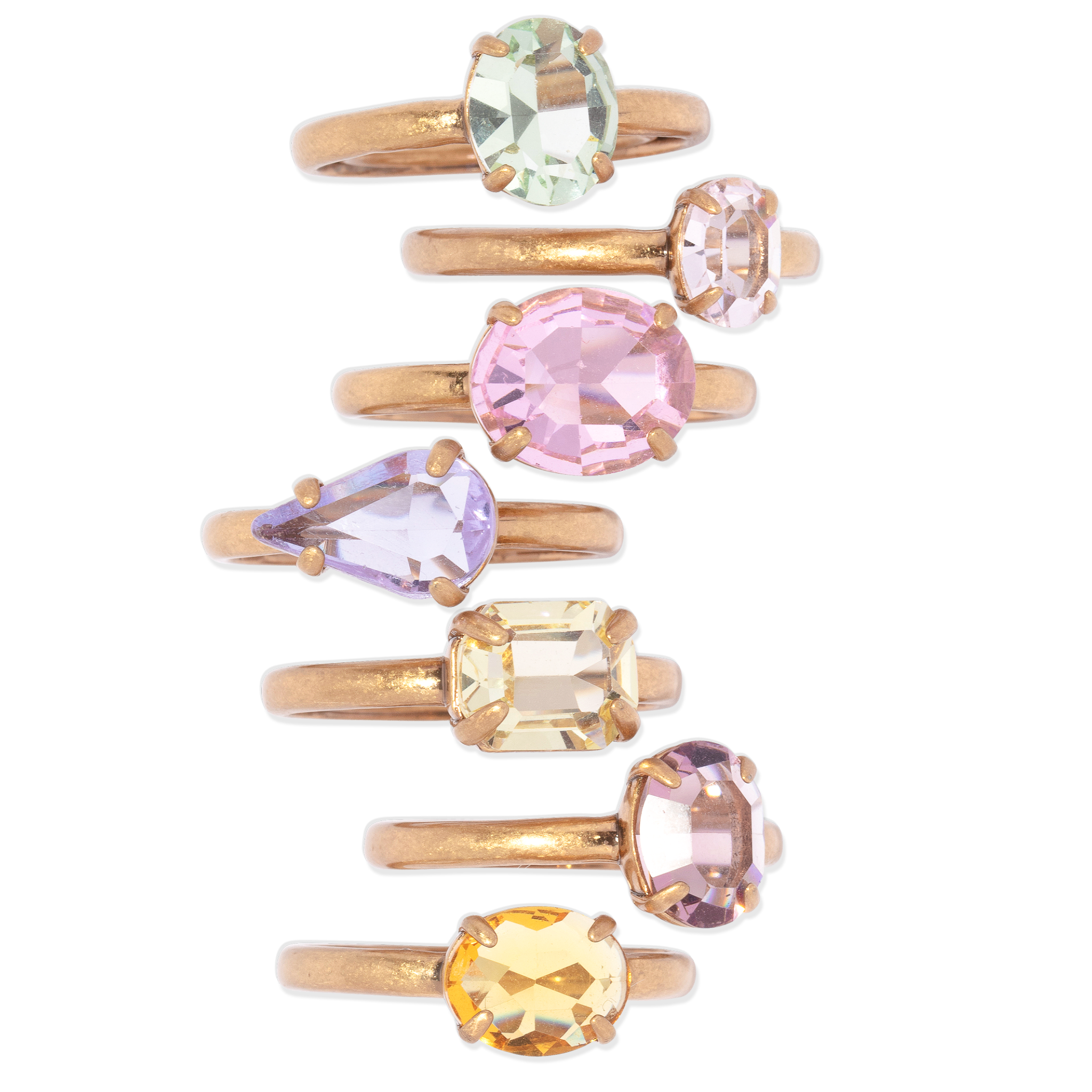 Try these gorgeous stackable rings nestled to create a colorful cluster or spread them out over several fingers - the styling combos are endless. Features hand-set glass stones, 18K antiqued gold finish over brass, and an inner ring sizer.