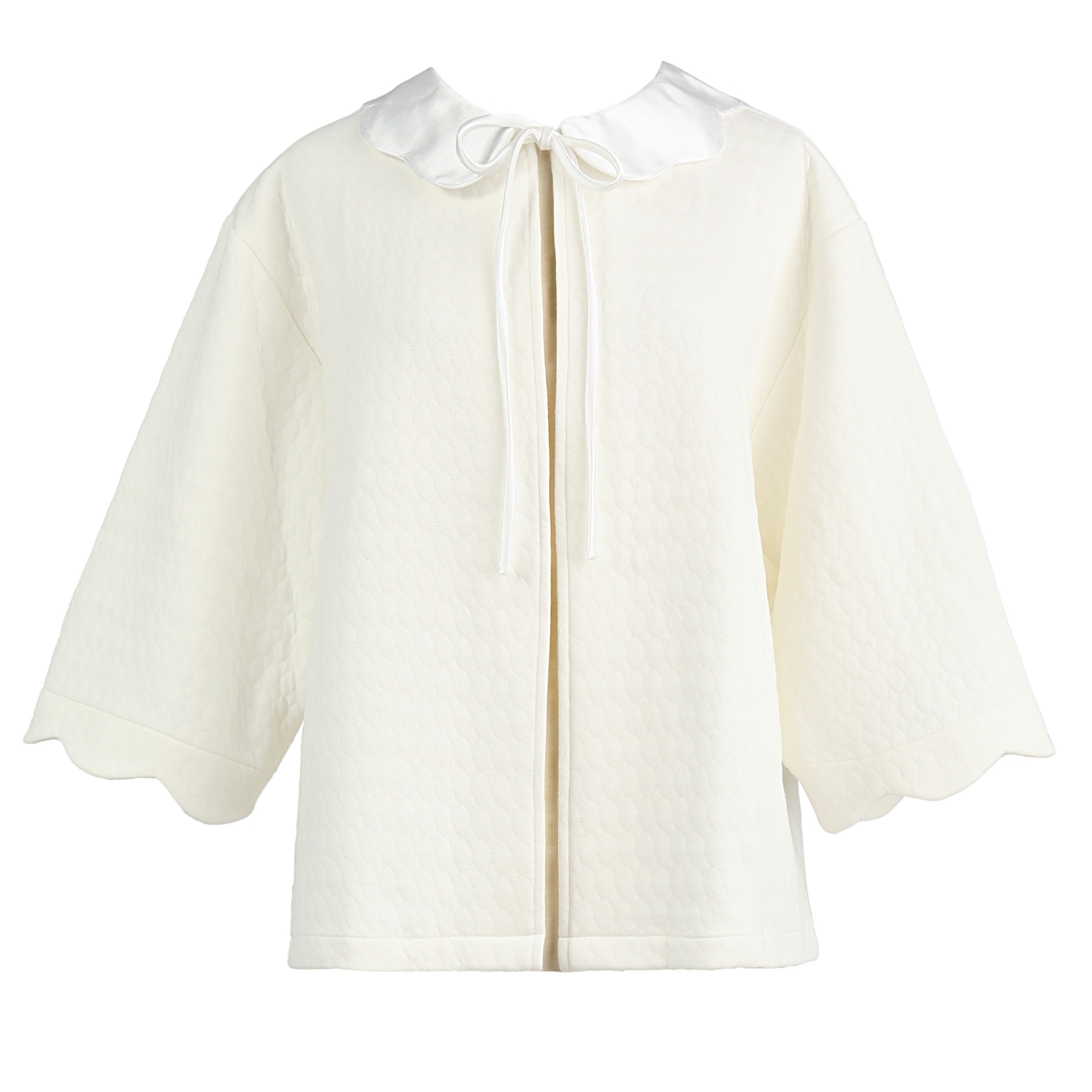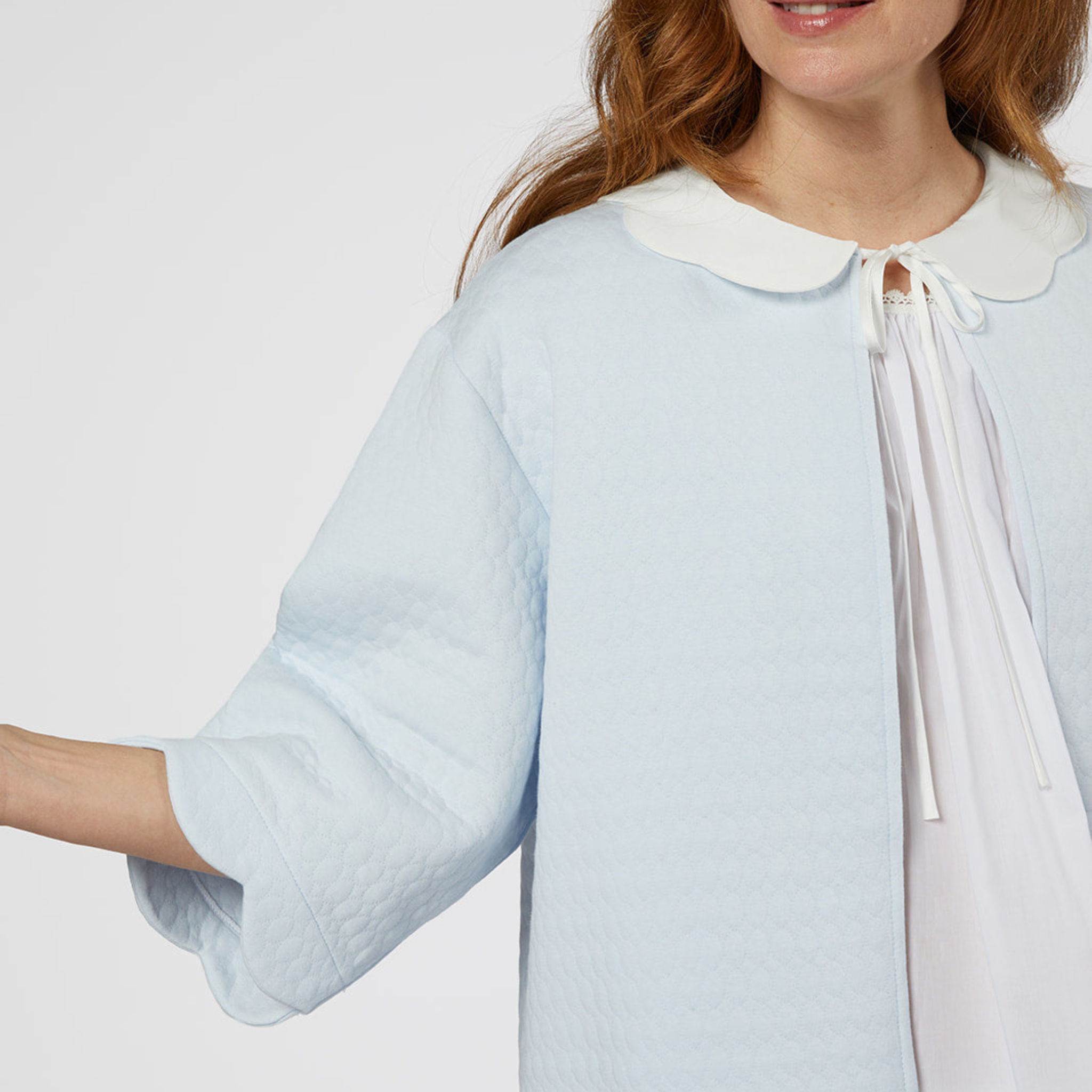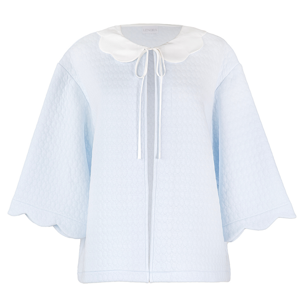 Wrap yourself in elegance with our Vivan Cotton Bedjacket. Featuring 3/4 length sleeves, a scalloped satin Peter Pan collar, and a tie front at the neckline, this bedjacket is perfect for adding a touch of sophistication to your loungewear.