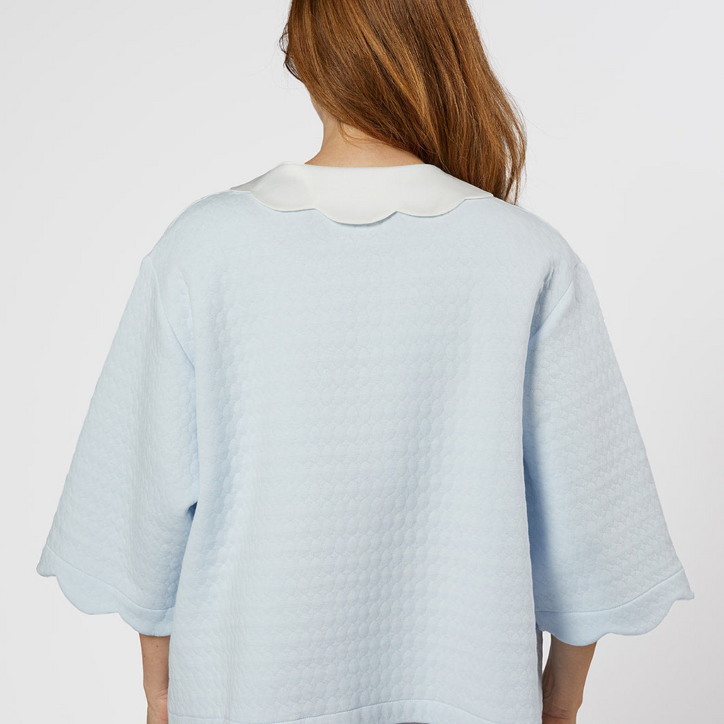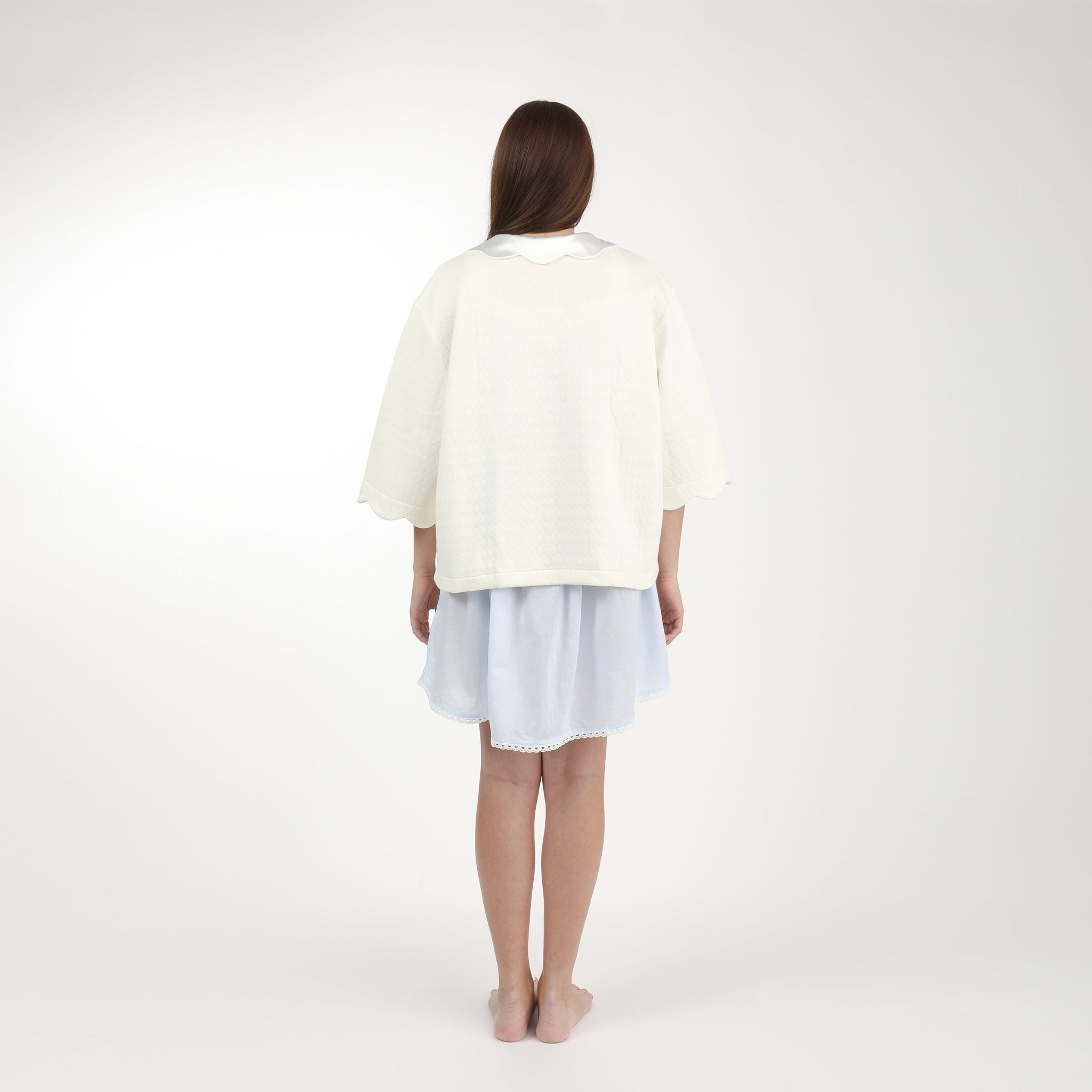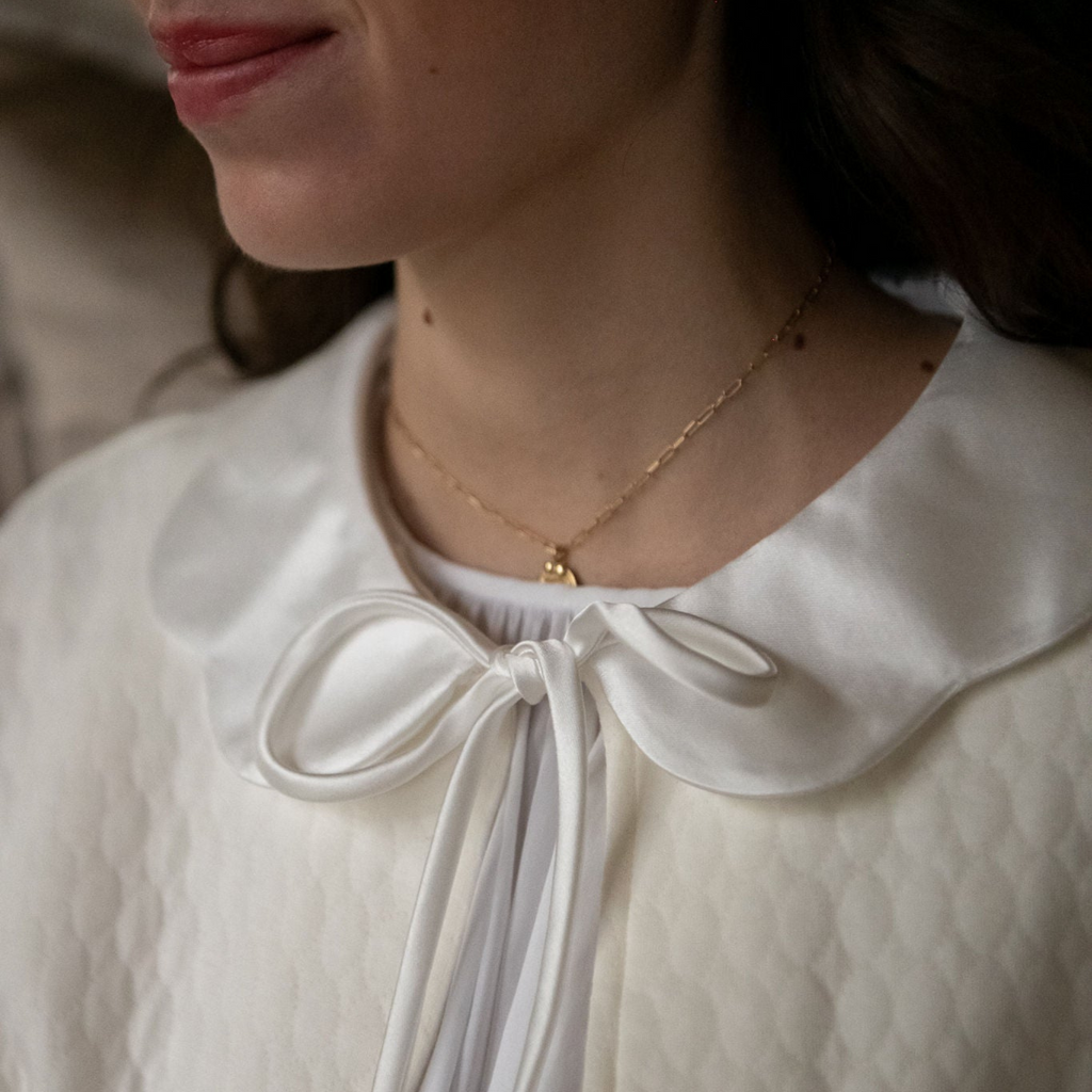 Wrap yourself in elegance with our Vivan Cotton Bedjacket. Featuring 3/4 length sleeves, a scalloped satin Peter Pan collar, and a tie front at the neckline, this bedjacket is perfect for adding a touch of sophistication to your loungewear.