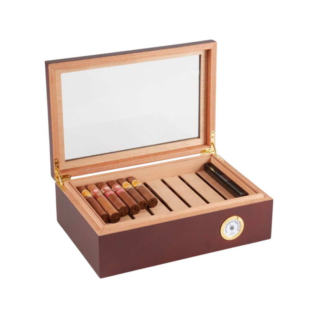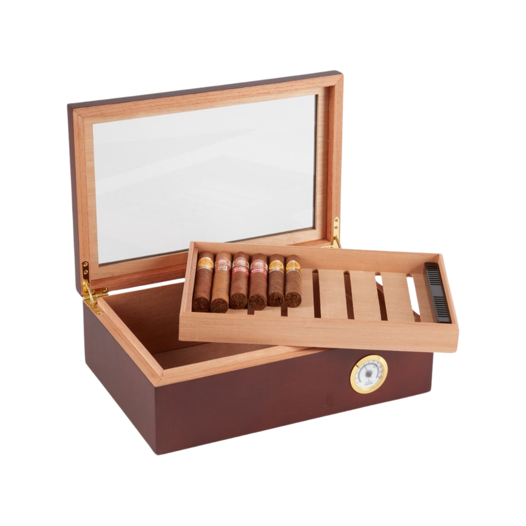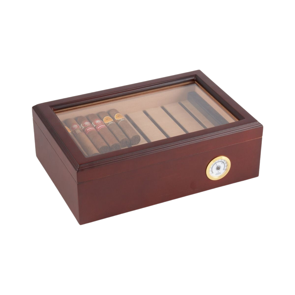 Crafted with precision and attention to detail, this humidor offers a sophisticated way to maintain the quality of your cigars while adding a touch of elegance to your space. The humidor is adorned with a rich and lustrous walnut finish, radiating sophistication and refinement. The glass top allows you to view your cigar collection without opening the humidor, preserving the internal humidity levels. Equipped with a built-in hygrometer, this humidor enables you to monitor and maintain optimal humidity levels.The interior of the humidor is lined with premium Spanish cedar, a wood known for its natural humidity regulation properties.