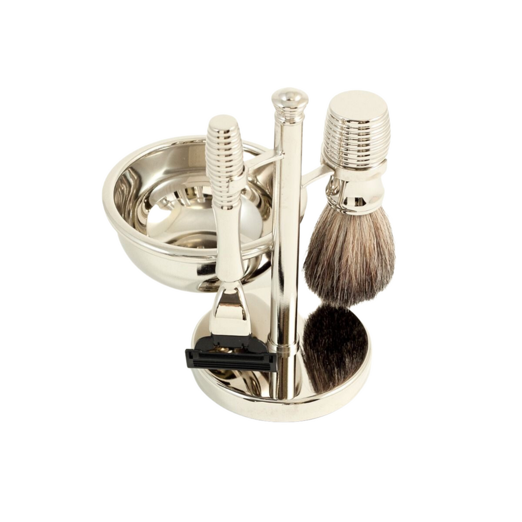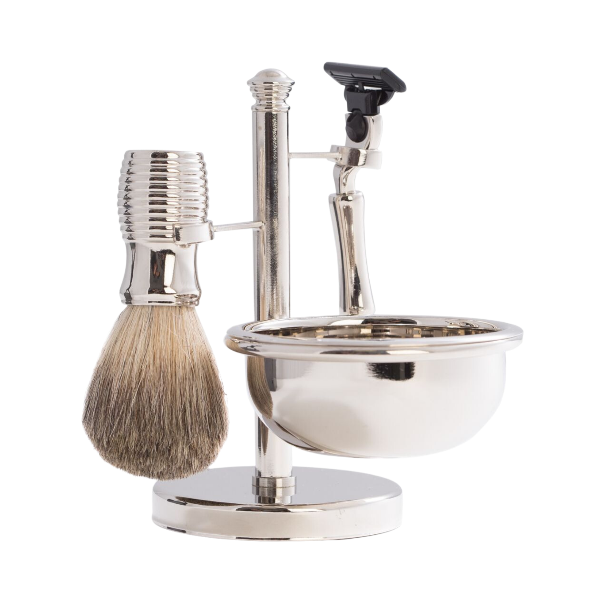 "Mach 3" Razor & Pure Badger Brush with Soap Dish on Chrome Stand
