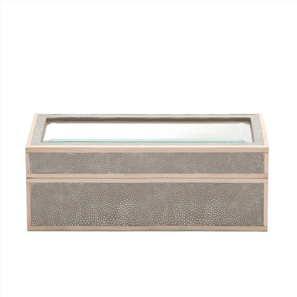 Watch out! These faux shagreen accents are a bedroom must-have. Pigeon & Poodle's most popular material covers the Elmbridge; a wood veneer border, poly-suede interior, and beveled glass lid are just a few of our brand-new watch box’s thoughtful details. This fabulous box holds five watches.