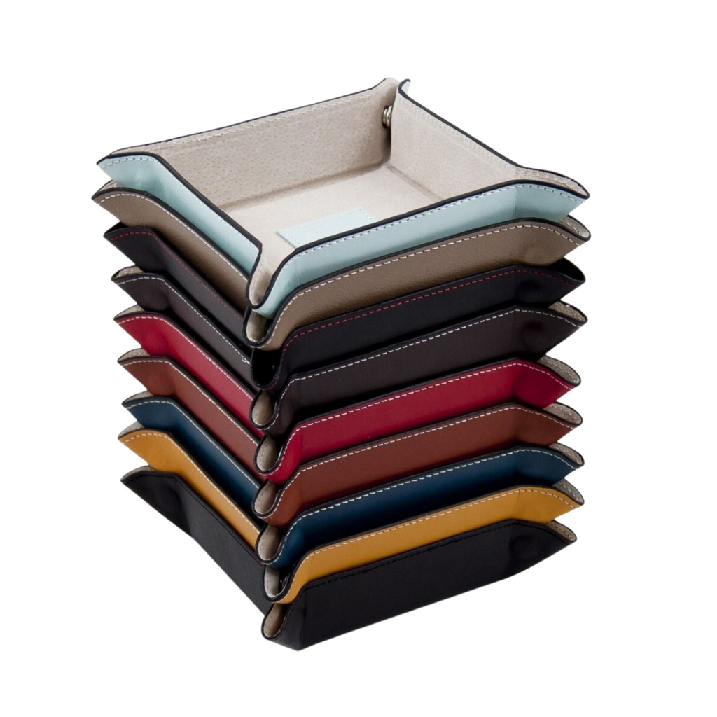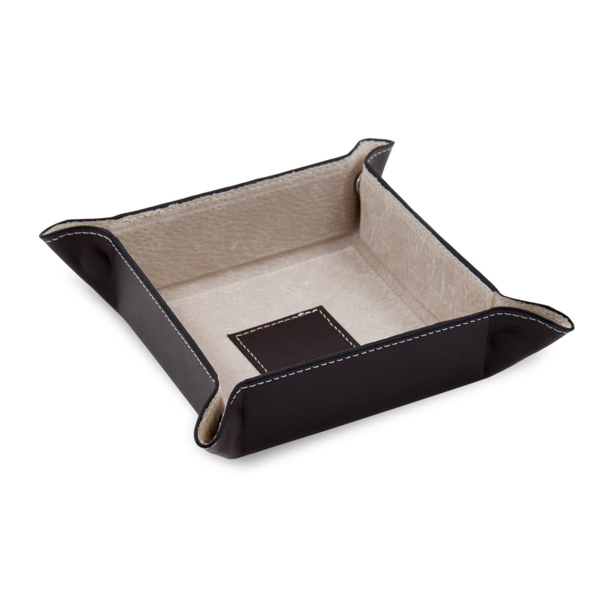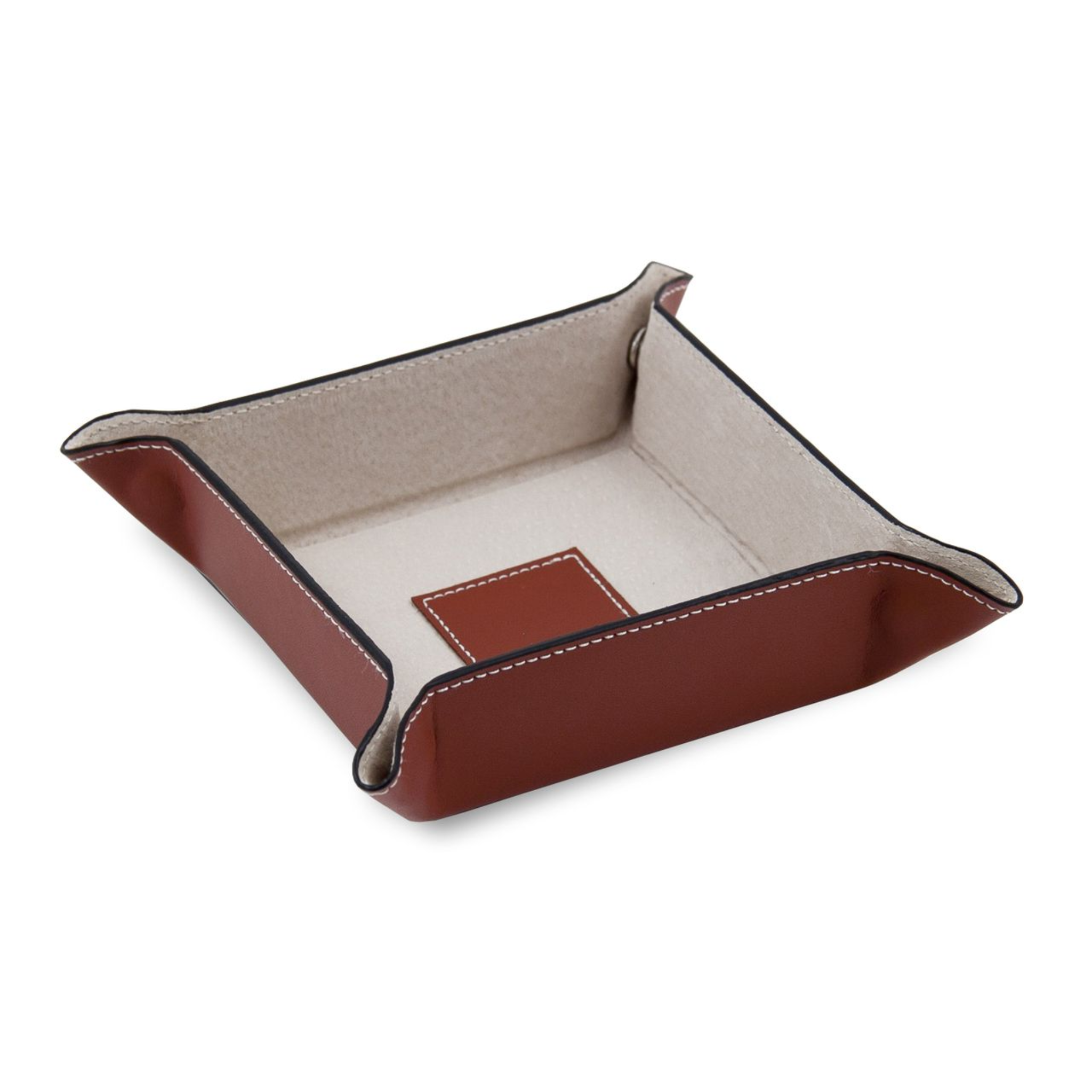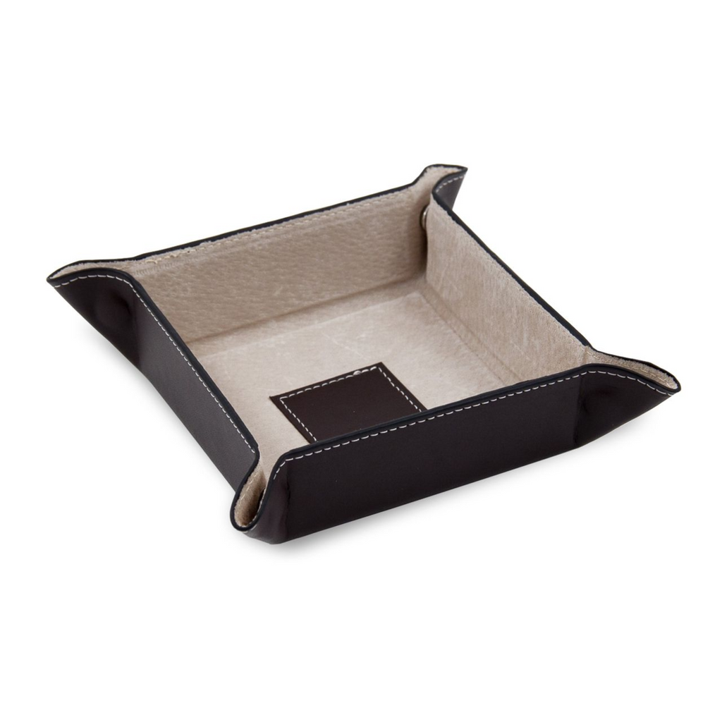 Keep your accessories readily accessible and neatly organized in our leather valet tray. This leather tray sits handsomely on any nightstand, desk, dresser, or counter. The valet has a Pig skin leather lining to prevent your belongings from scratching. The corner snaps give our valet a sleek and easy way to lay flat and travel with. The perfect gift for the person who has it all!