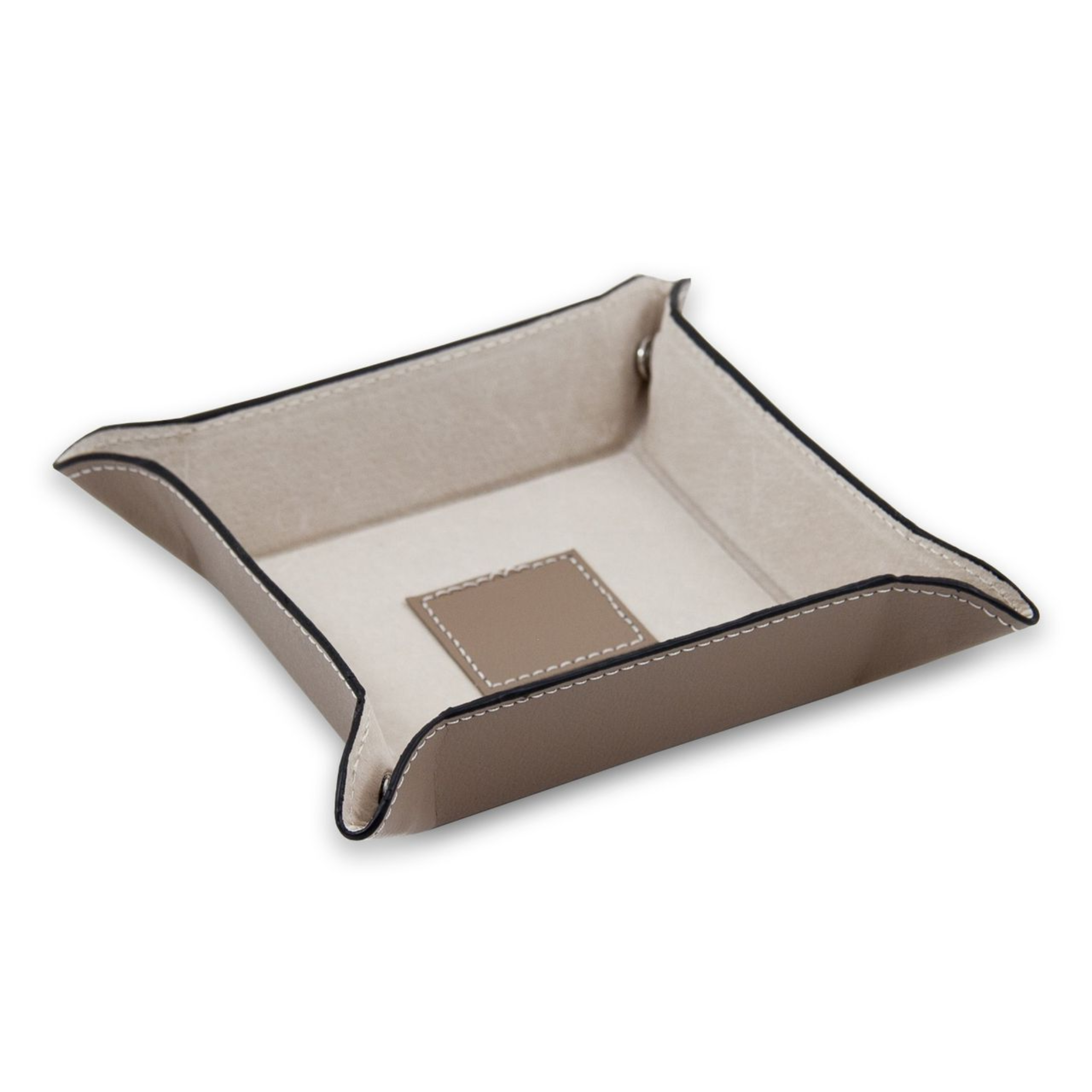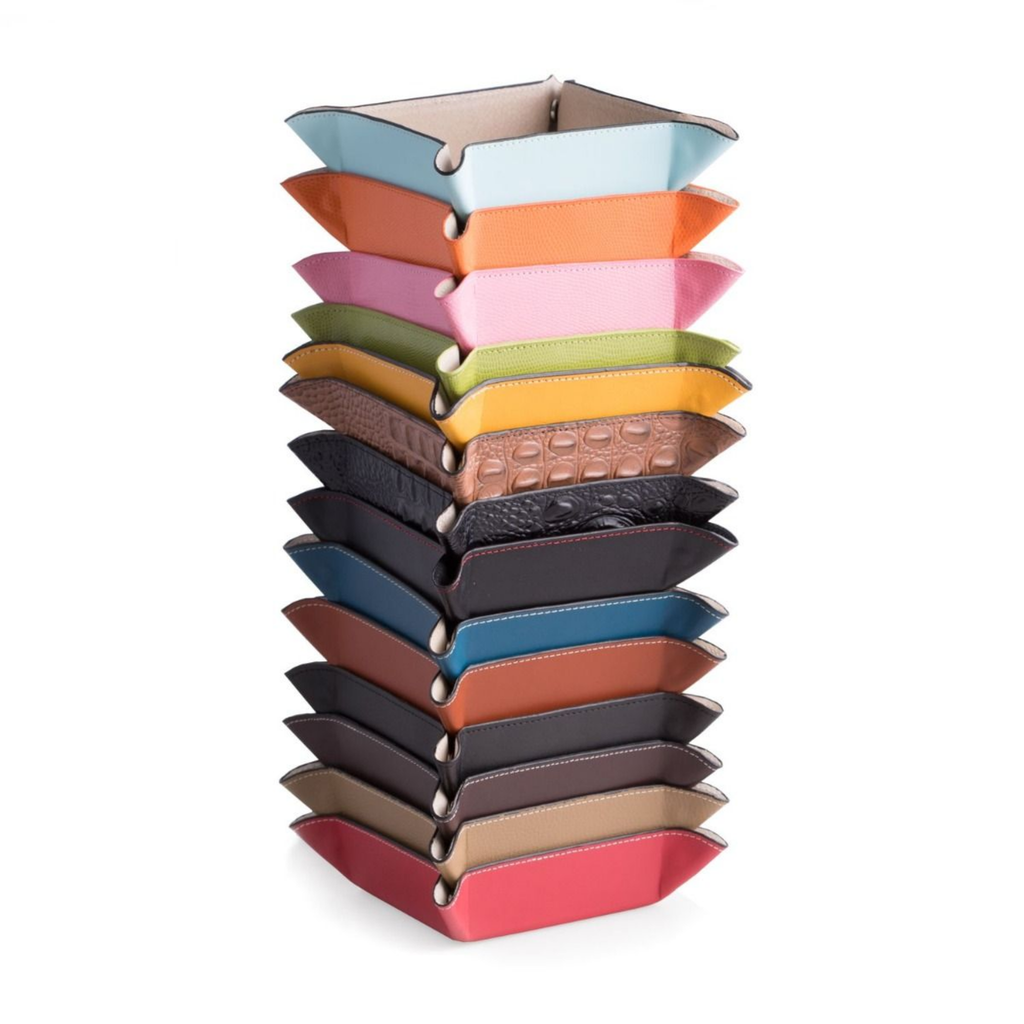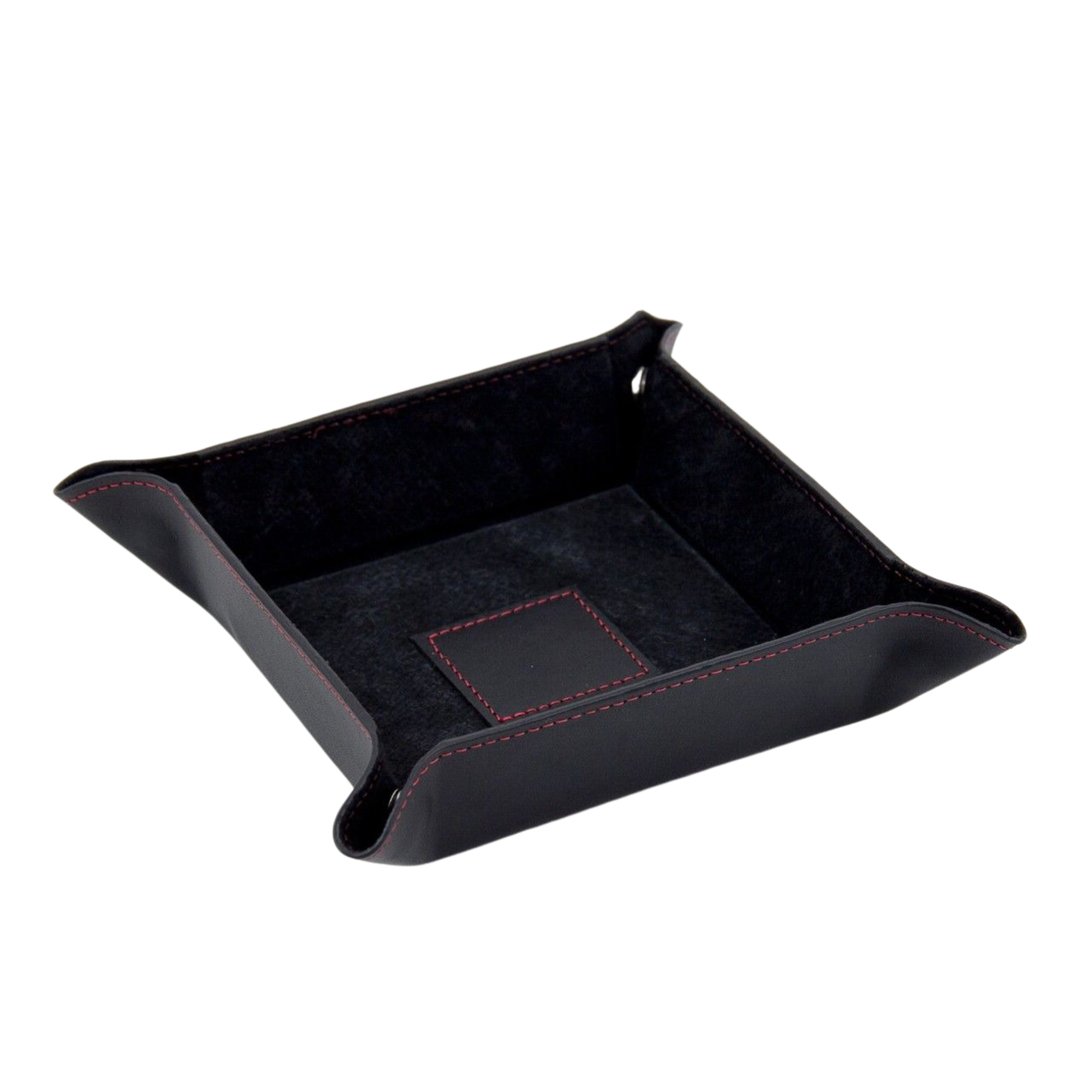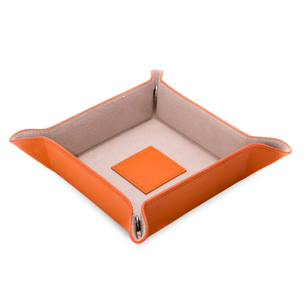 Keep your accessories readily accessible and neatly organized in our leather valet tray. This leather tray sits handsomely on any nightstand, desk, dresser, or counter. The valet has a Pig skin leather lining to prevent your belongings from scratching. The corner snaps give our valet a sleek and easy way to lay flat and travel with. The perfect gift for the person who has it all!