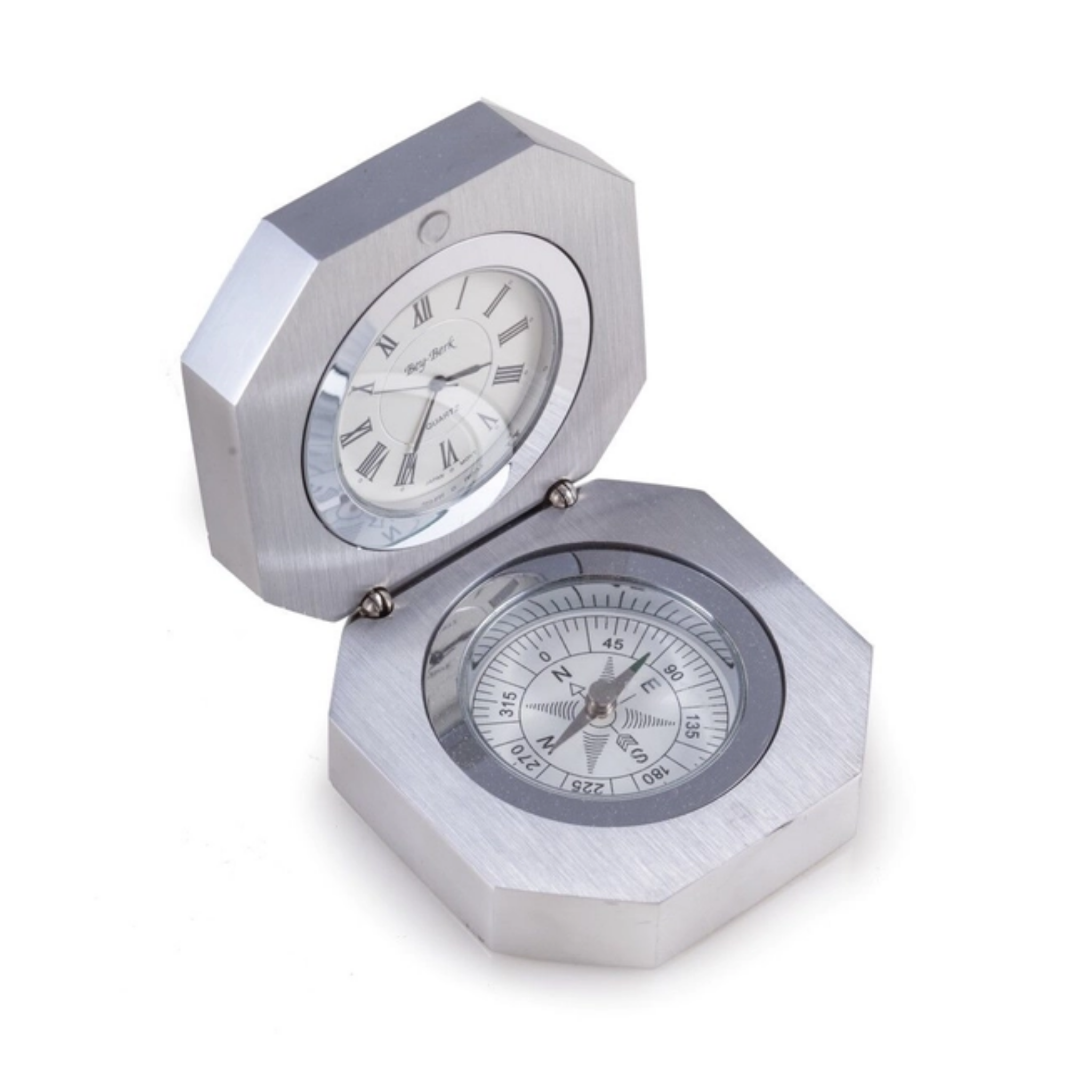 A nautical lover gift, a hiker gift, a scout leader gift. They will all enjoy this large-faced steel compass in a hinged case. Perfect for personalization. Compass and Clock in Stainless Steel Hinged Case.