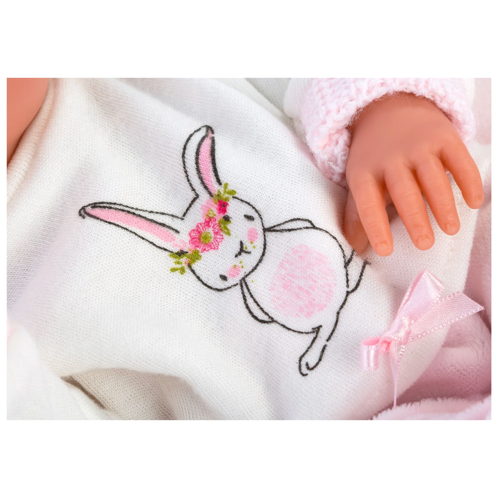 Cory stylish outfit shown is a combination of a white knit shirt with a bunny, blue fleece pants, and a matching knit hat with pom pom. His look is complete with a blue and white cushion, making a perfect addition to any collection.