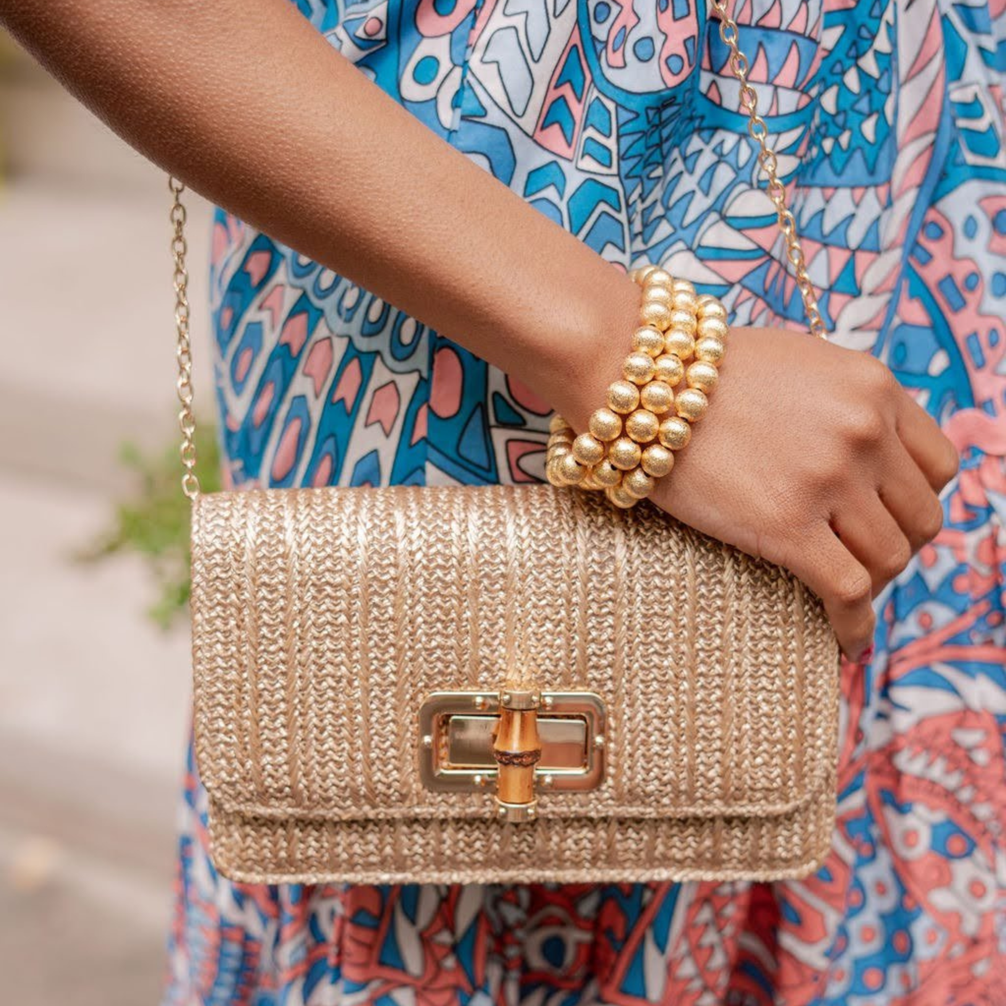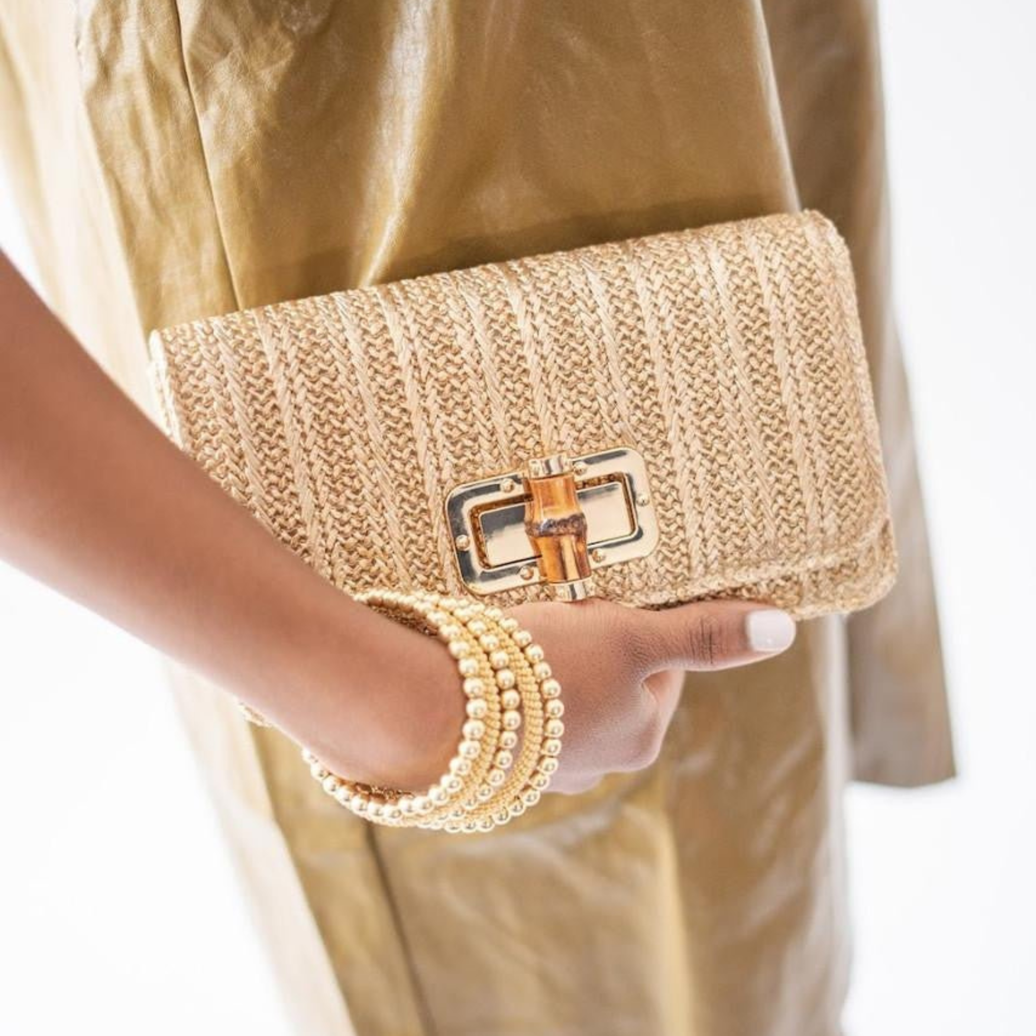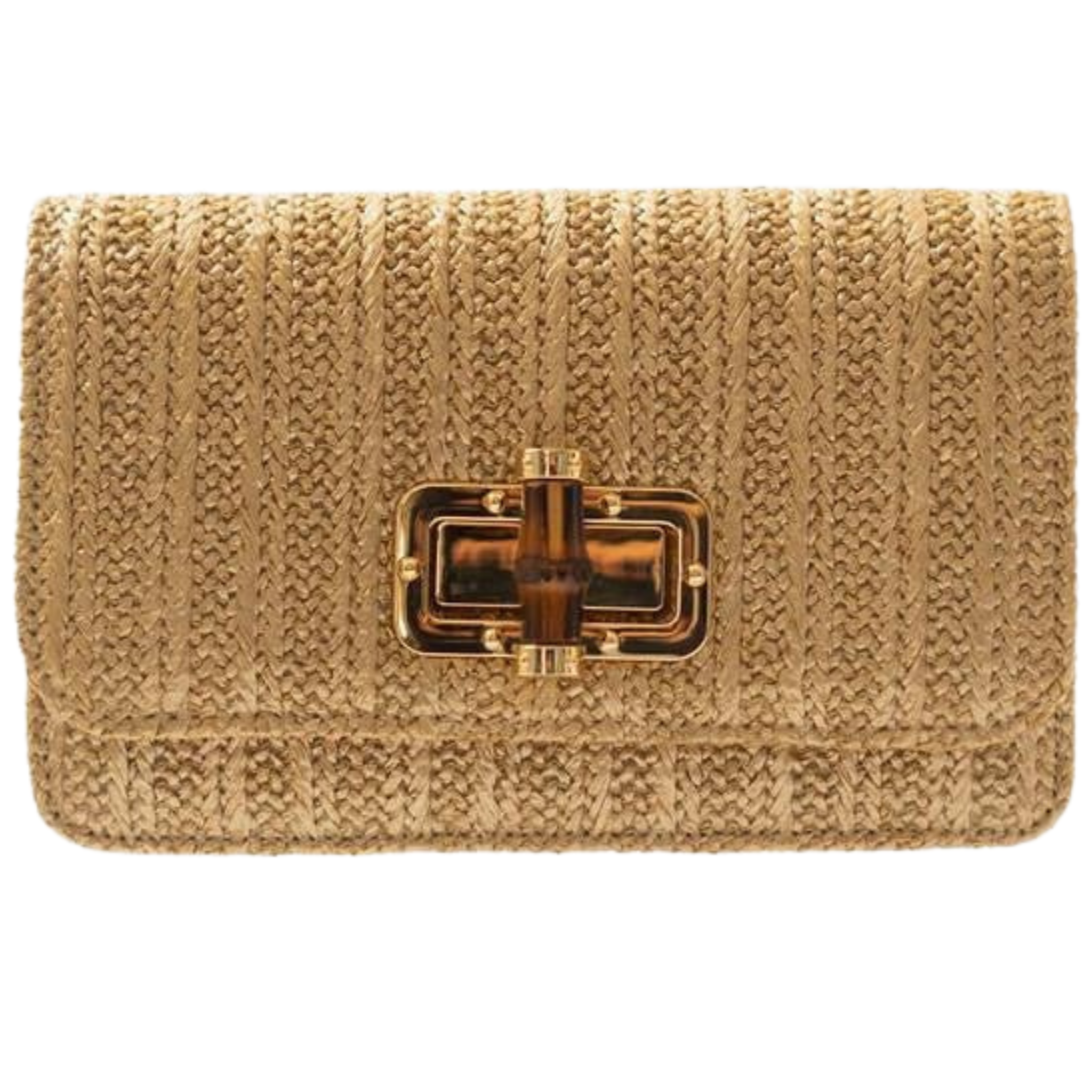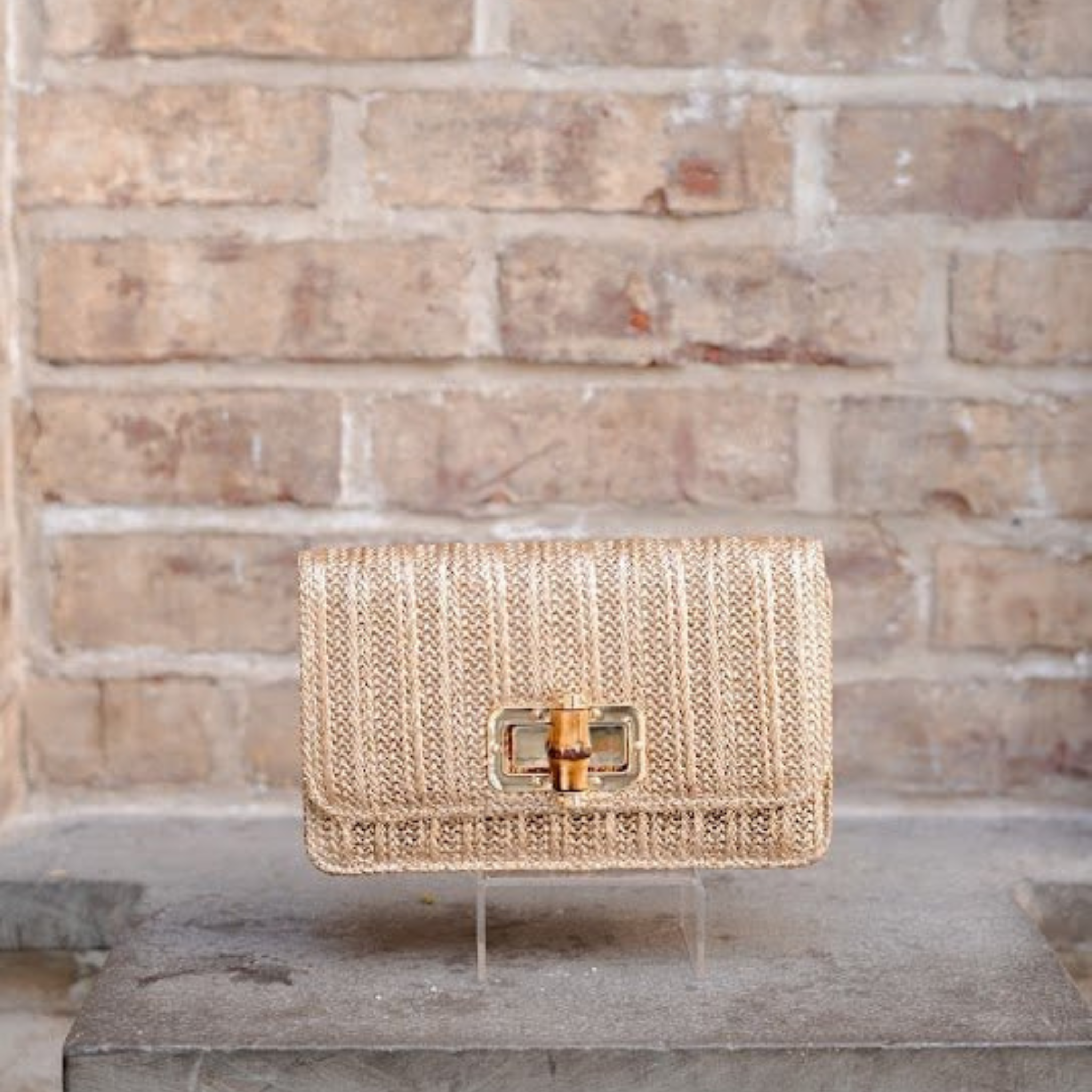 Perfect blend of natural texture and refined elegance. Crafted from shimmering gold-toned straw, it features a unique bamboo toggle closure that adds a touch of organic charm.