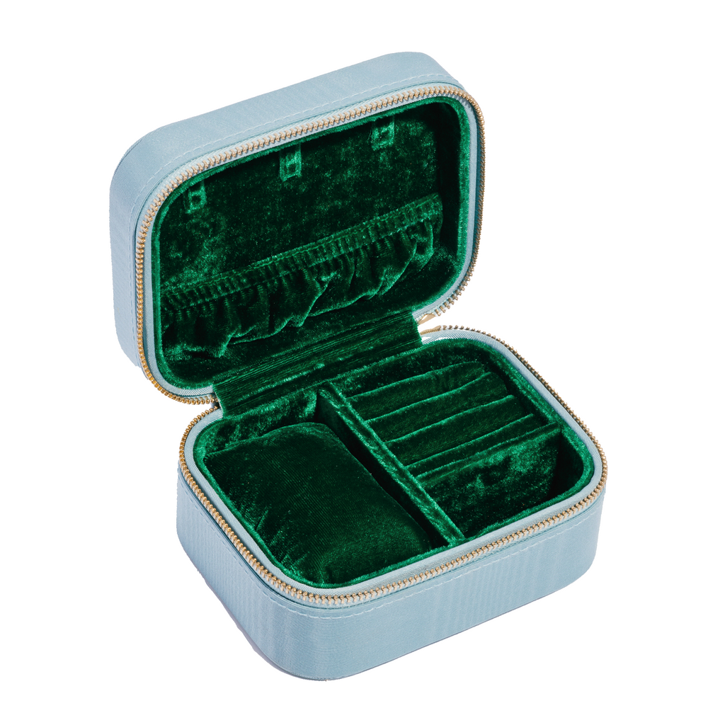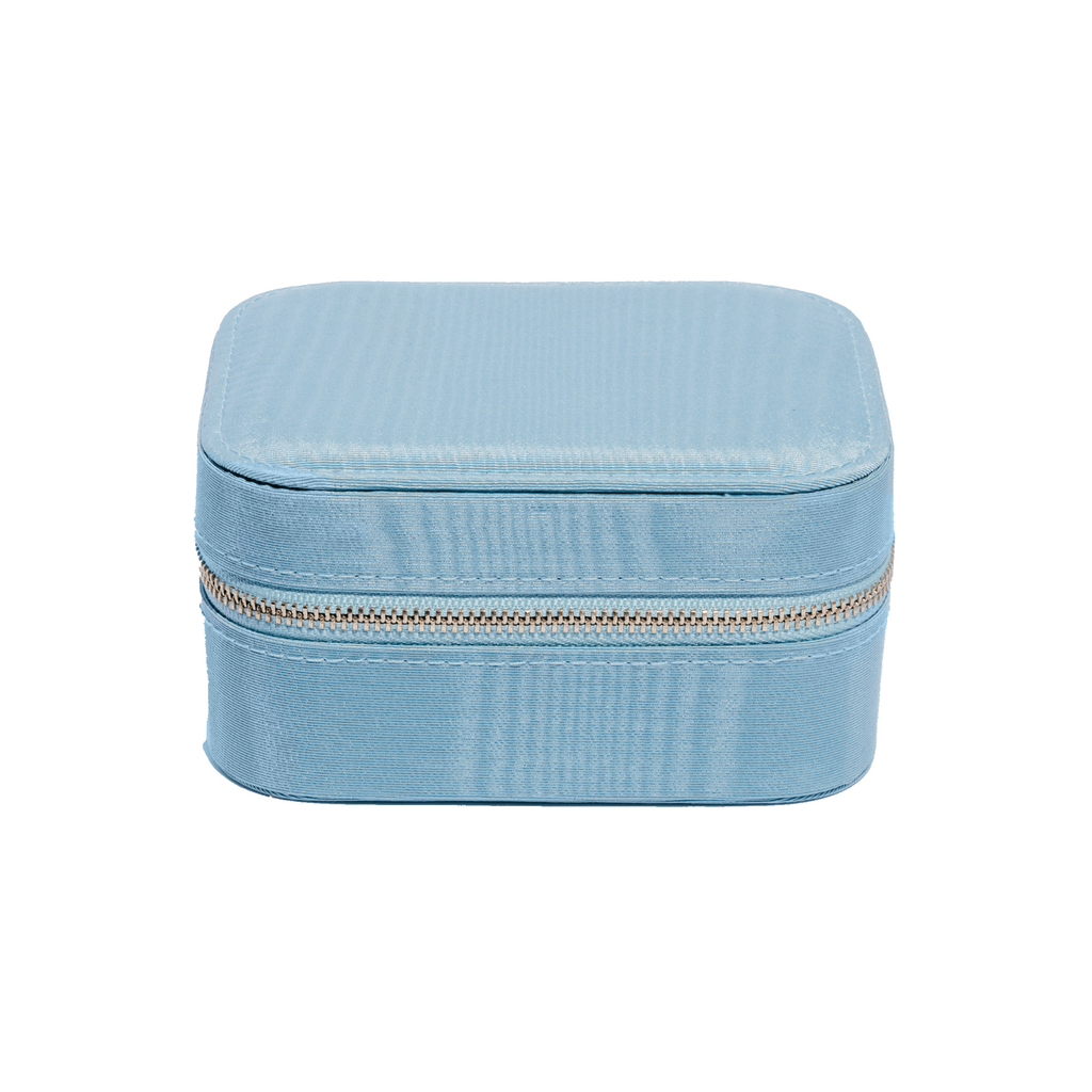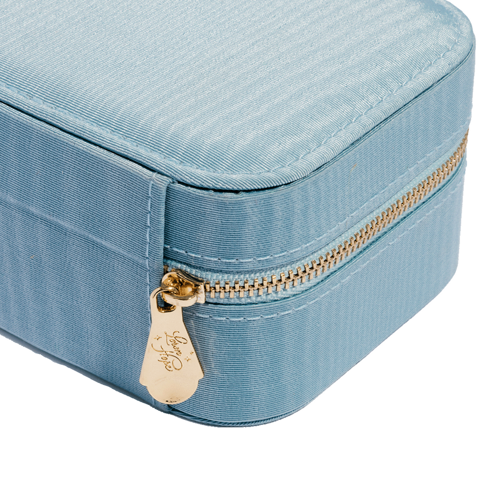 • Material: Moiré fabric exterior, silk velvet interior, 24k shiny gold finish over brass zipper.