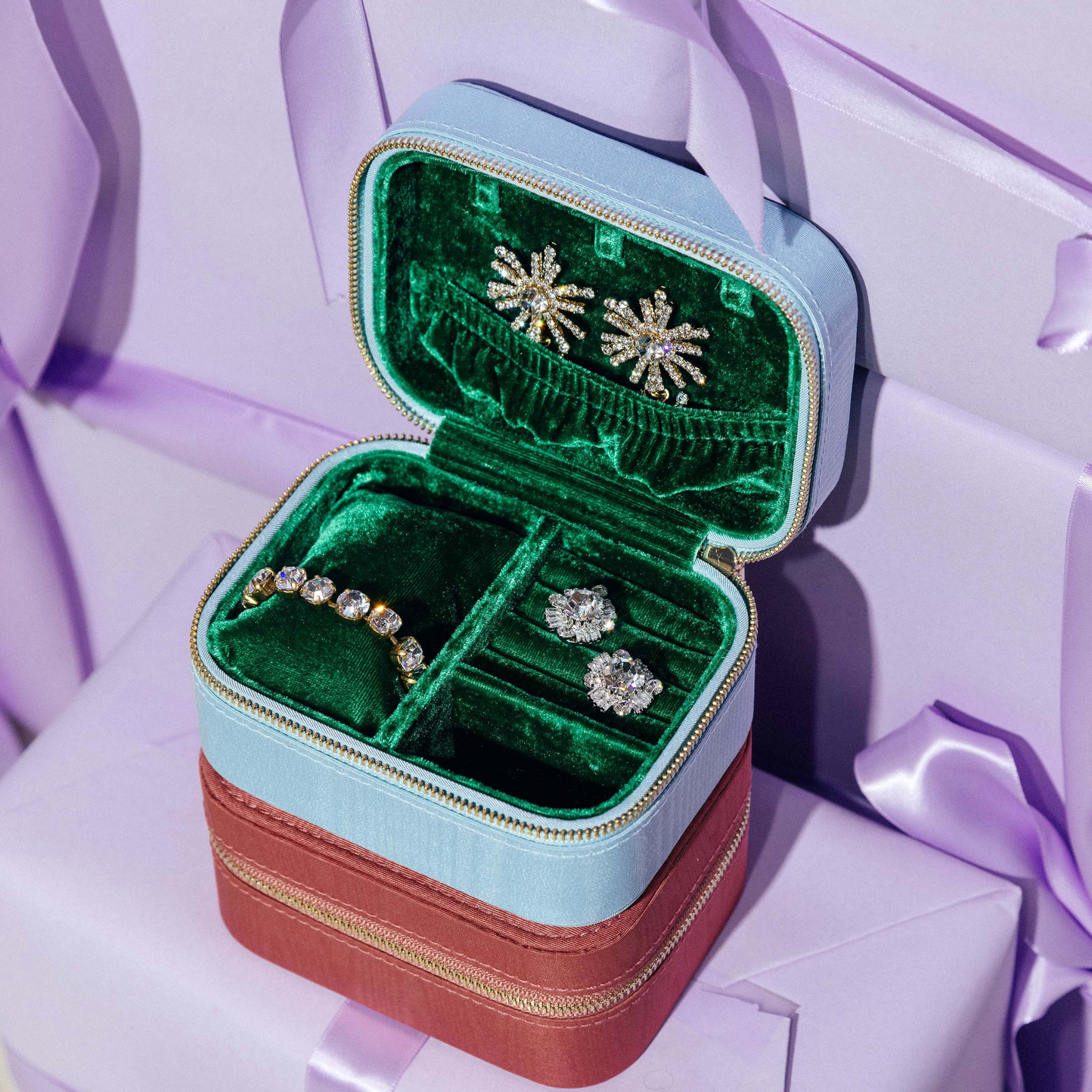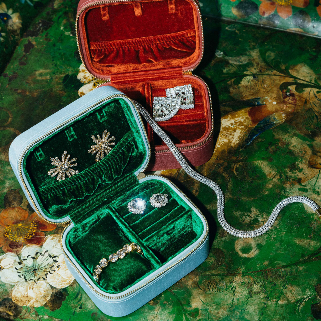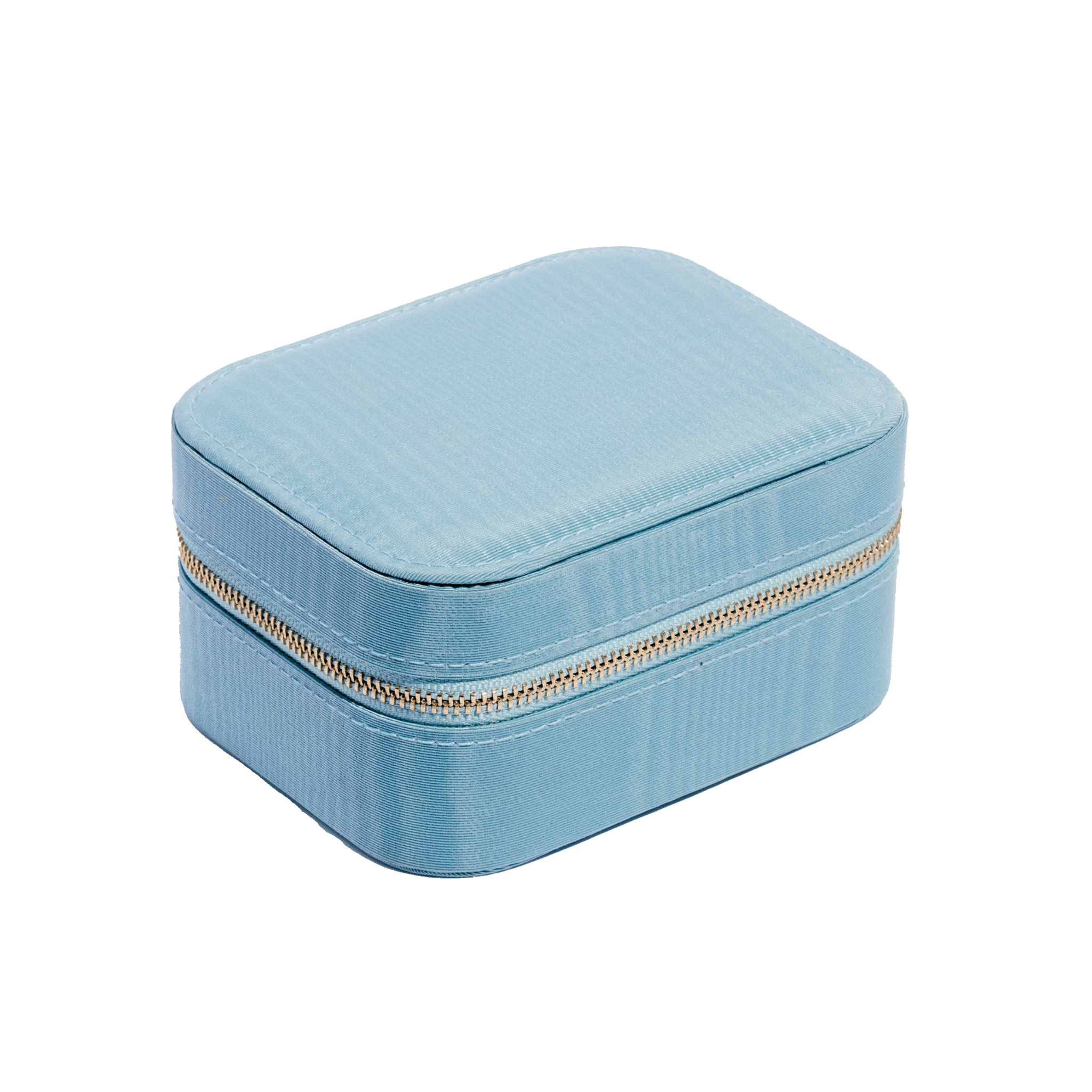 • Material: Moiré fabric exterior, silk velvet interior, 24k shiny gold finish over brass zipper.