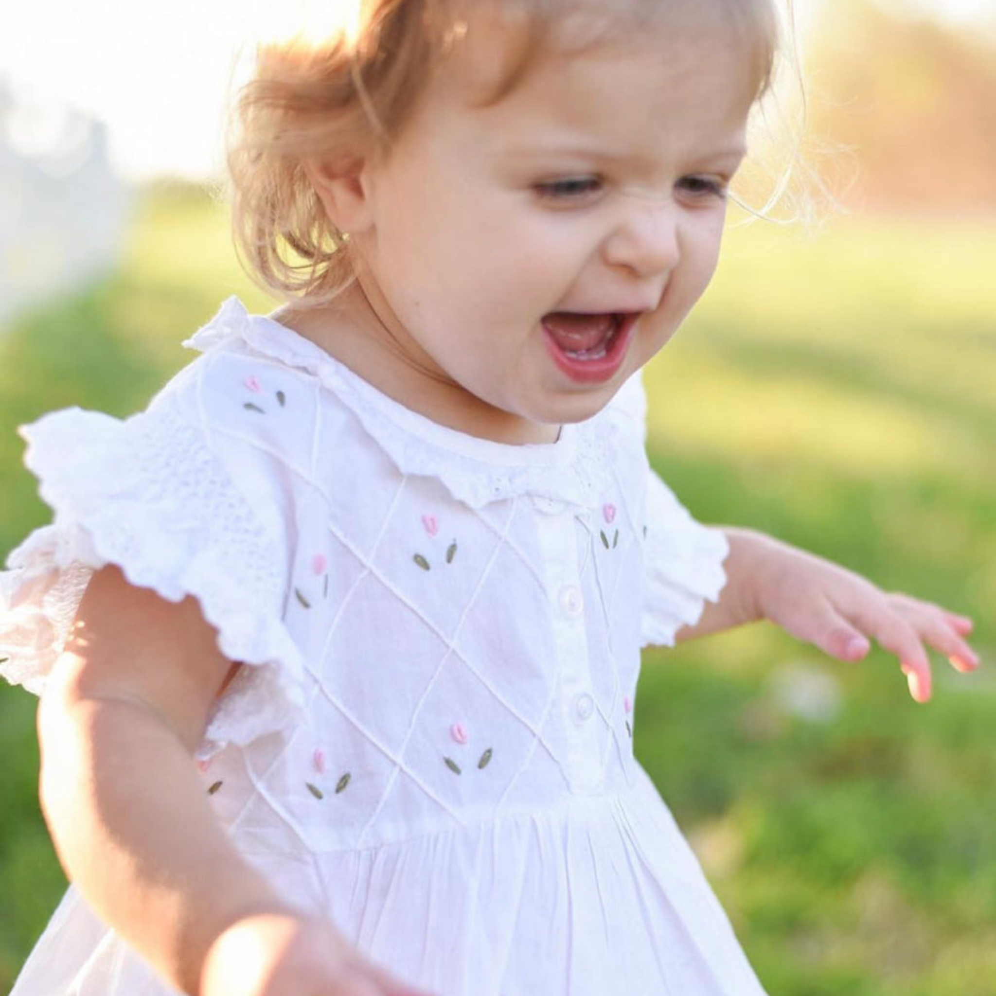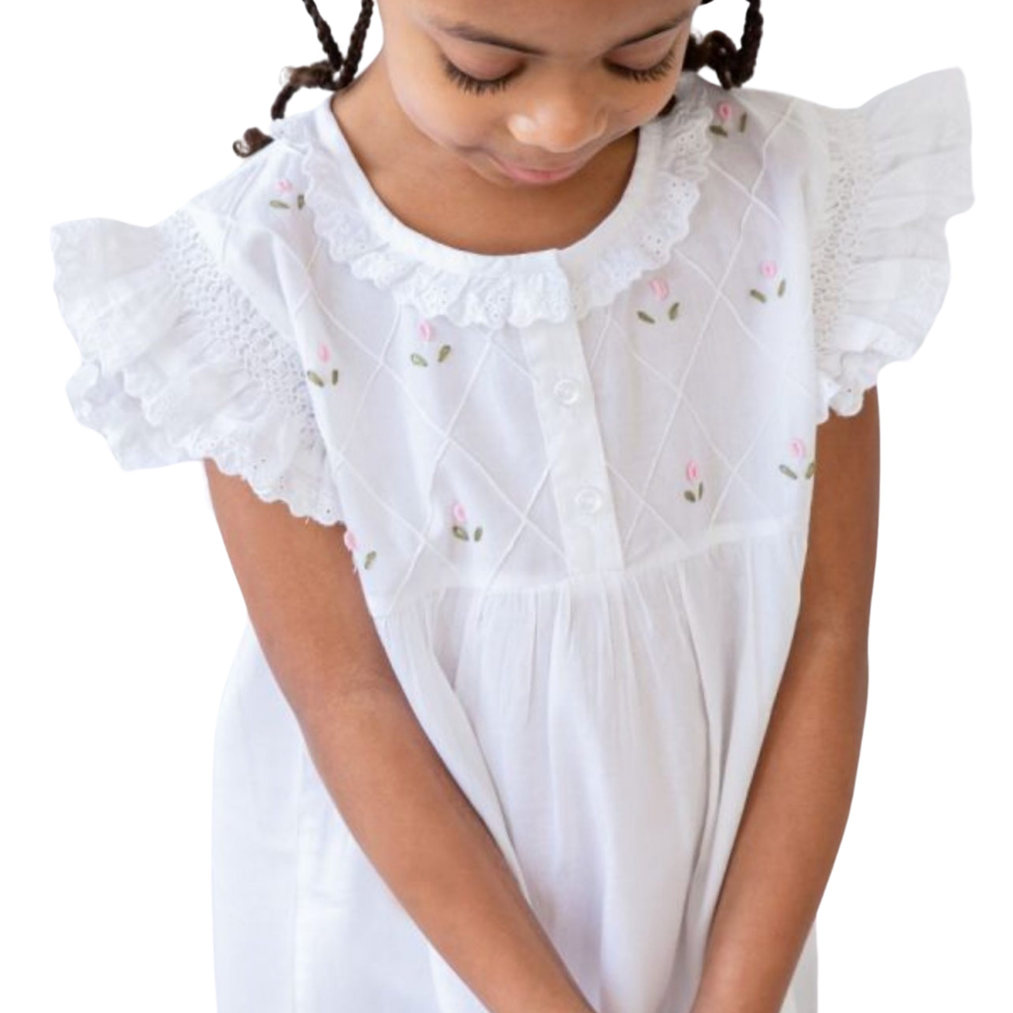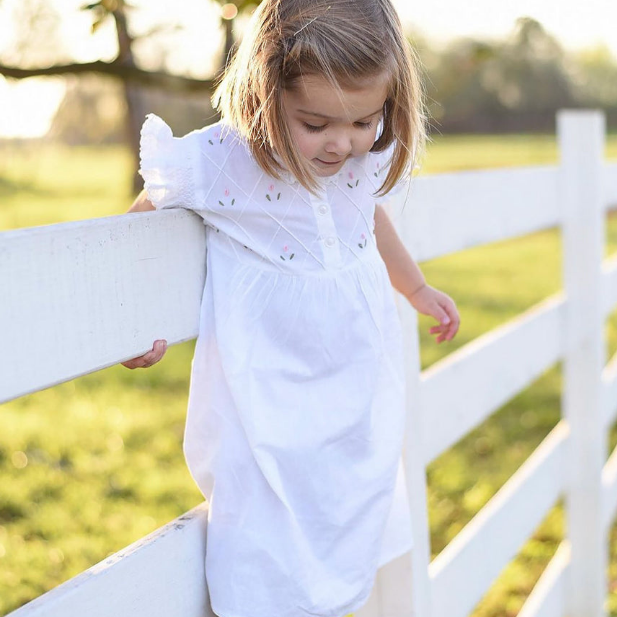 The adorable little Rose dress is a new arrival and gorgeous for spring and summertime. The dress features hand embroidered rosebuds, eyelet lace trim, and angel sleeves. The style runs slightly bigger than others so keep that in mind when ordering! It's a darling dress for your little girl to wear for play time, story time and twirl time!