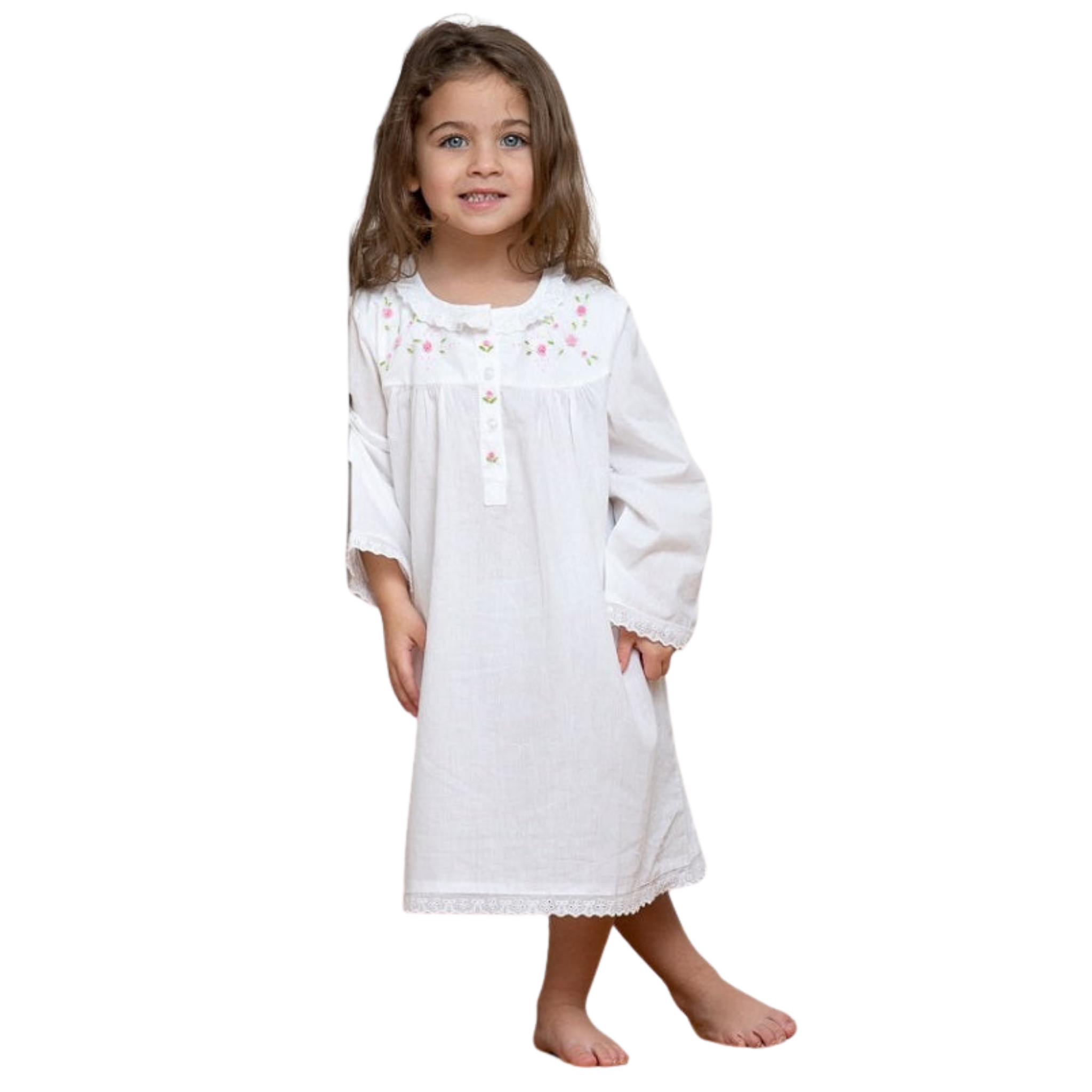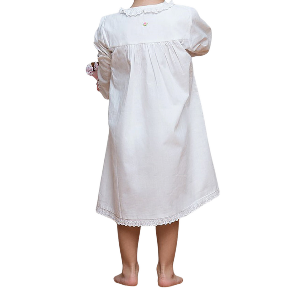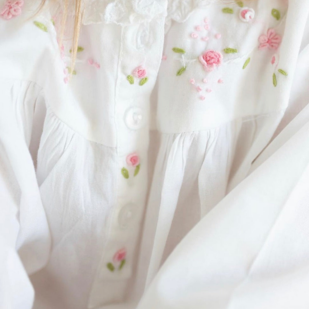 - Embroidery: Hand Embroidered Soft Pink Roses on Bodice, Single Sweet Rosebud on Back of Neck, and Eyelet Lace Trim on Hem