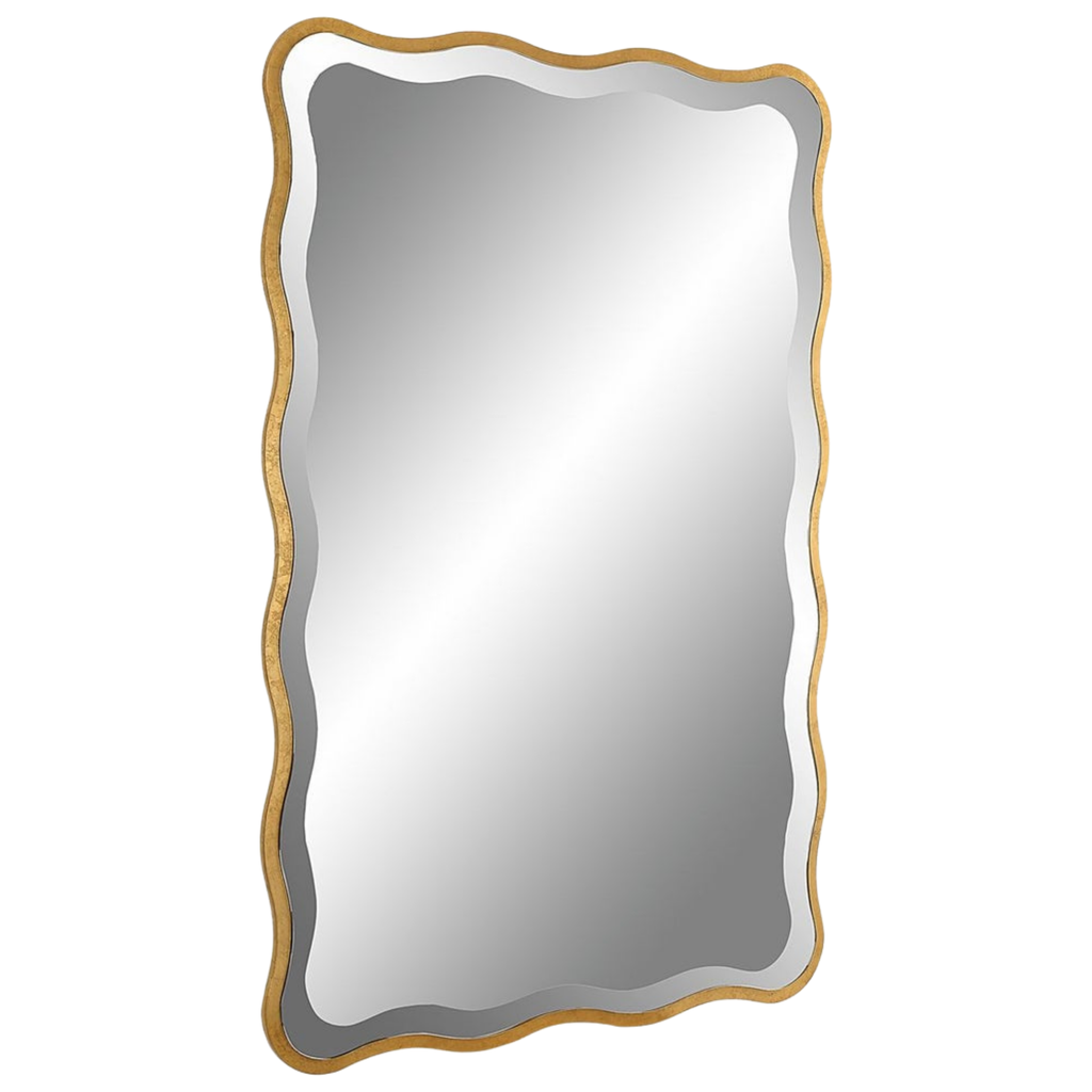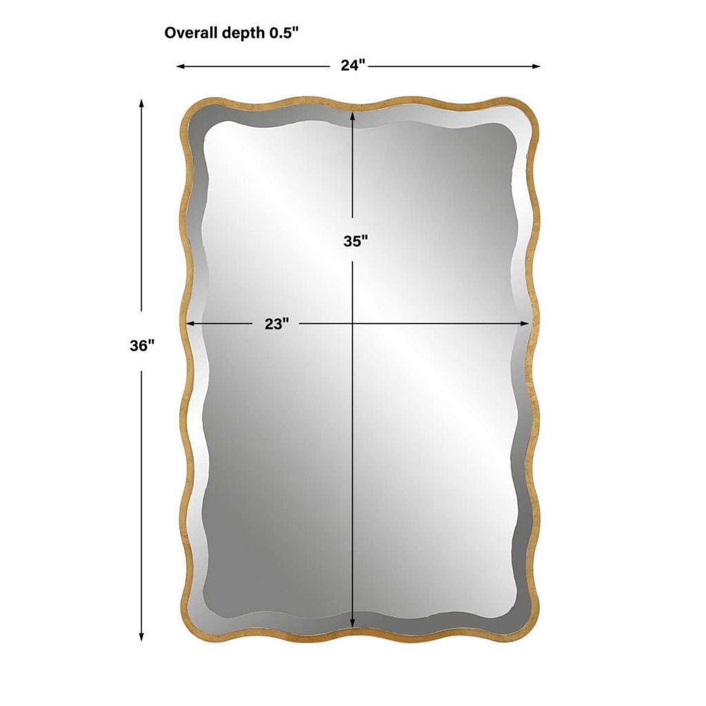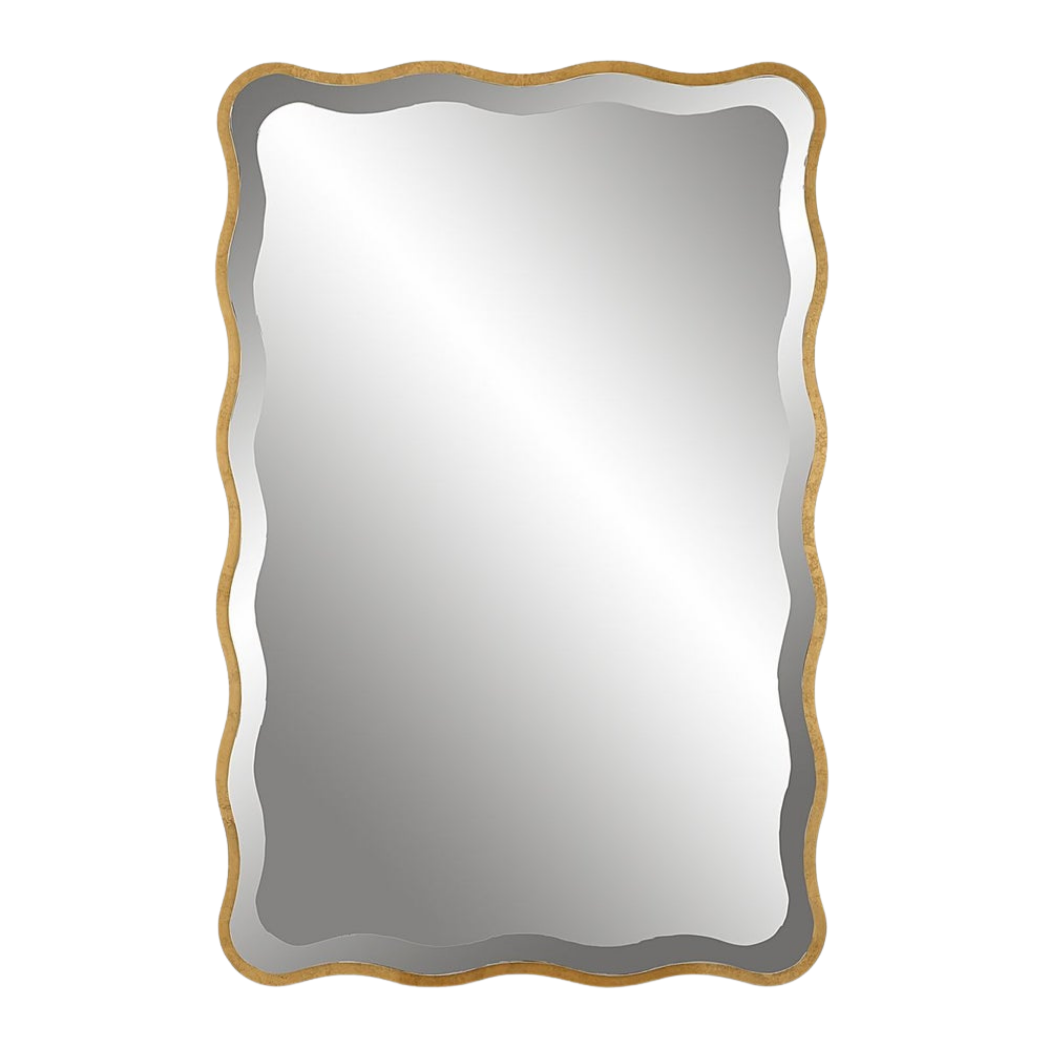 Showcasing a feminine scalloped edge, this shaped wood mirror adds whimsical flair to any design. The mirror is finished in an antiqued gold leaf, and has a 1" bevel.