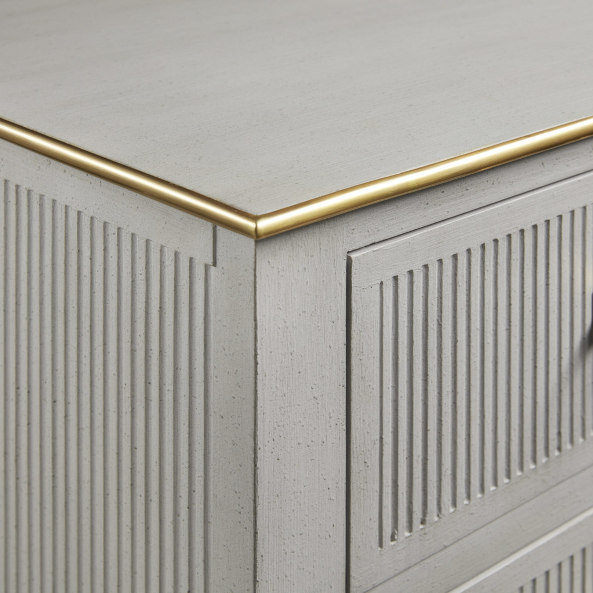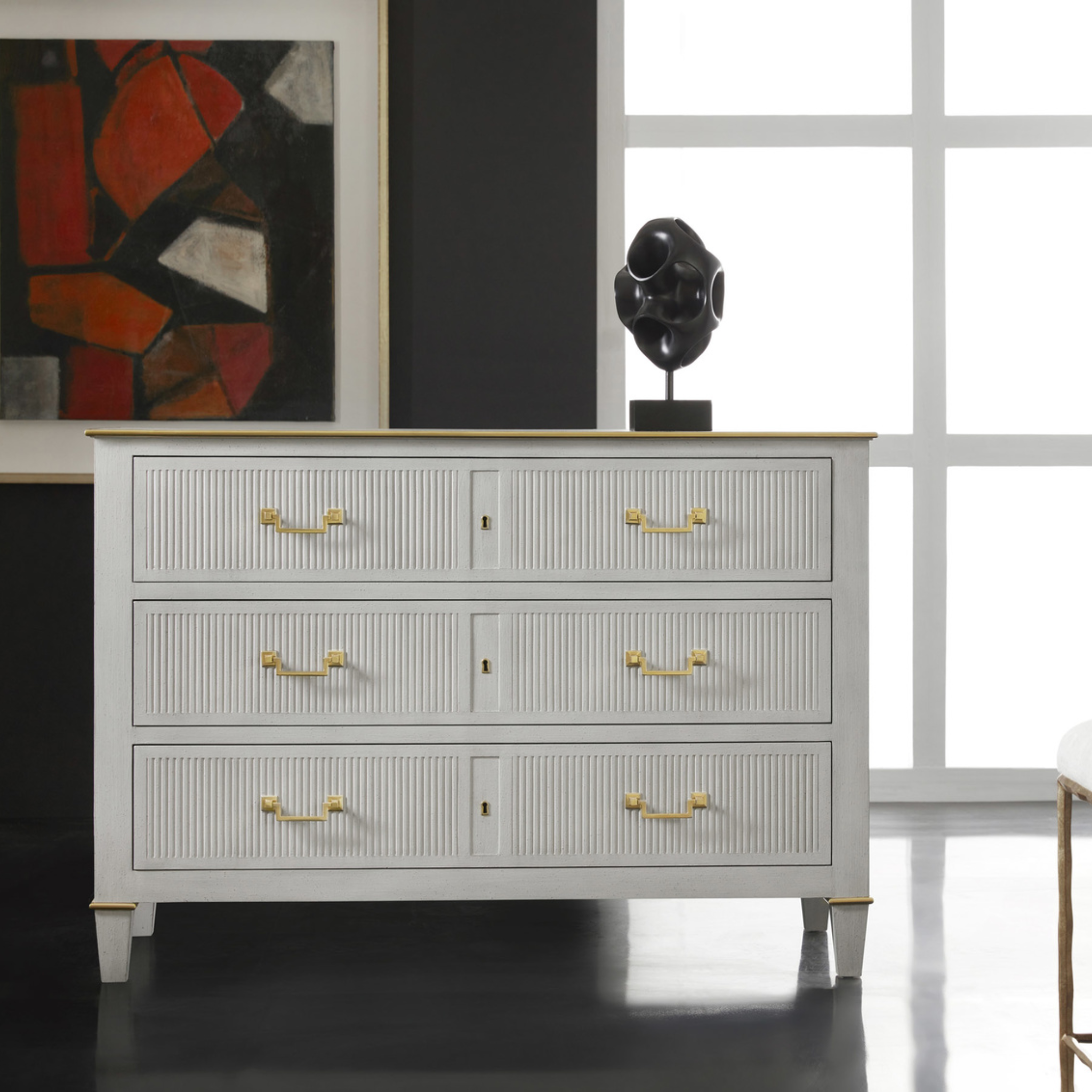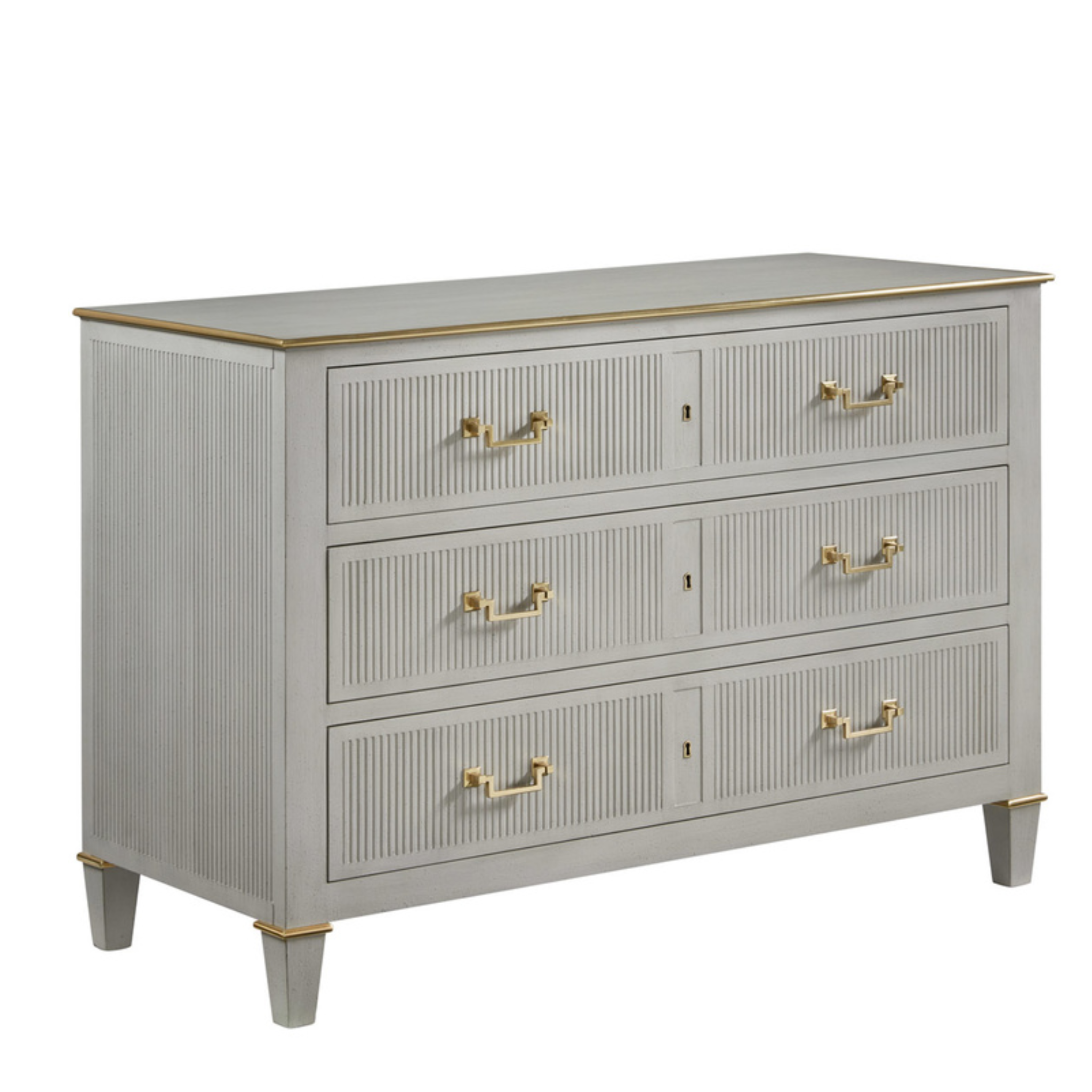This dresser showcases reeded drawer fronts in an antique painted finish, complemented by solid brass hardware.
