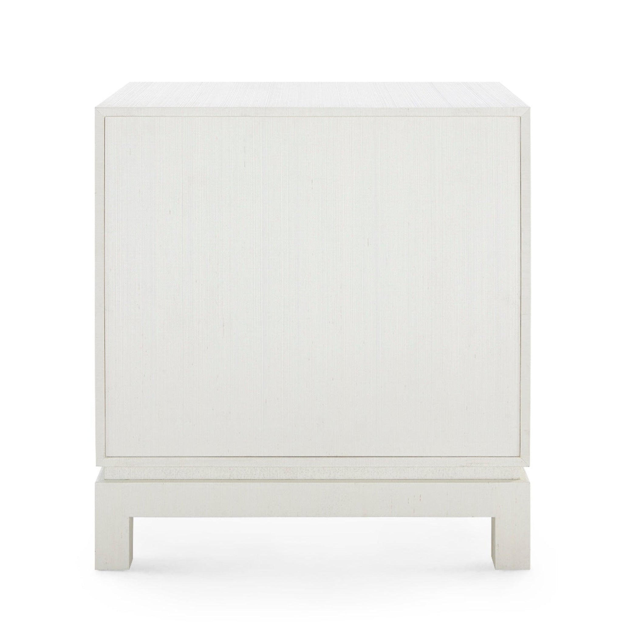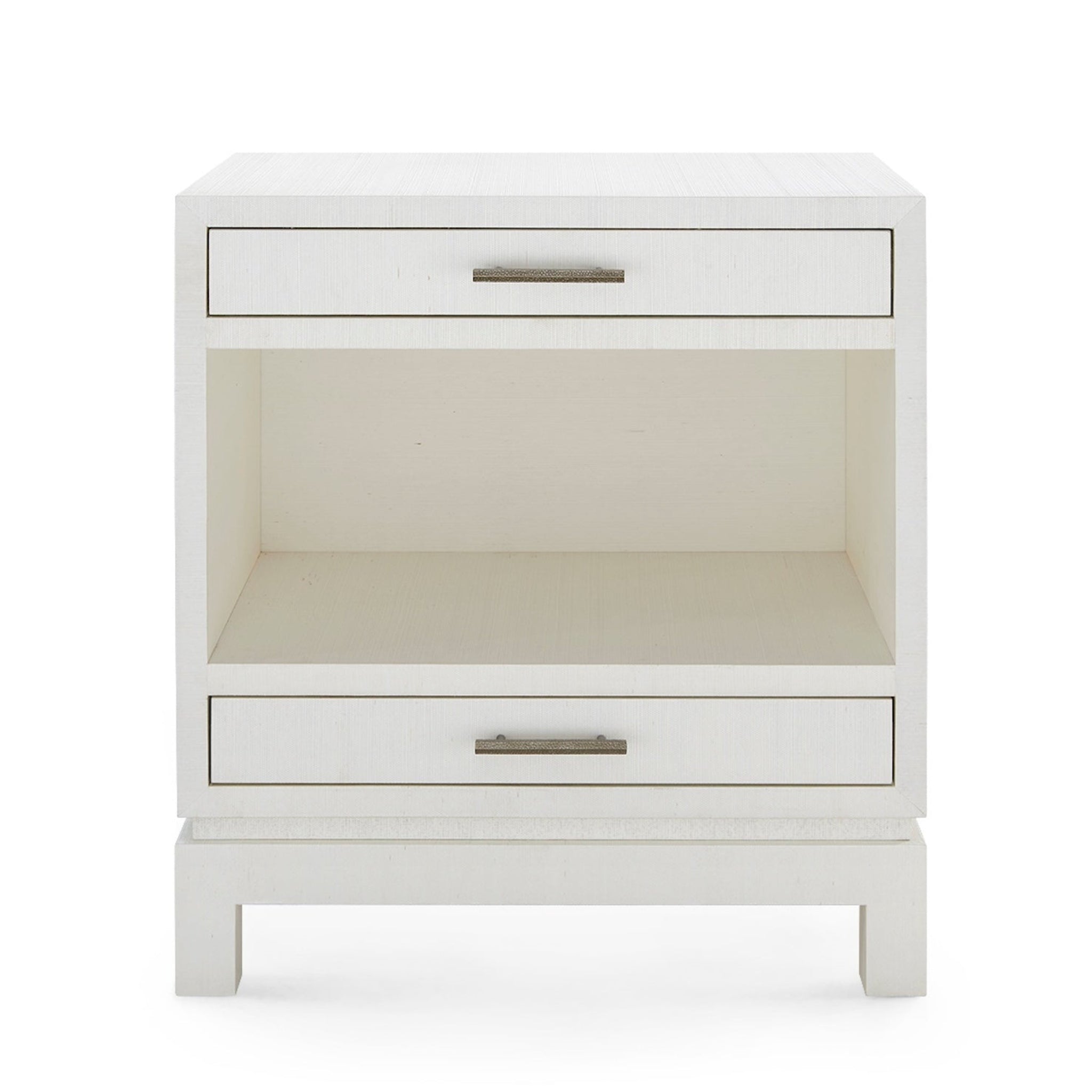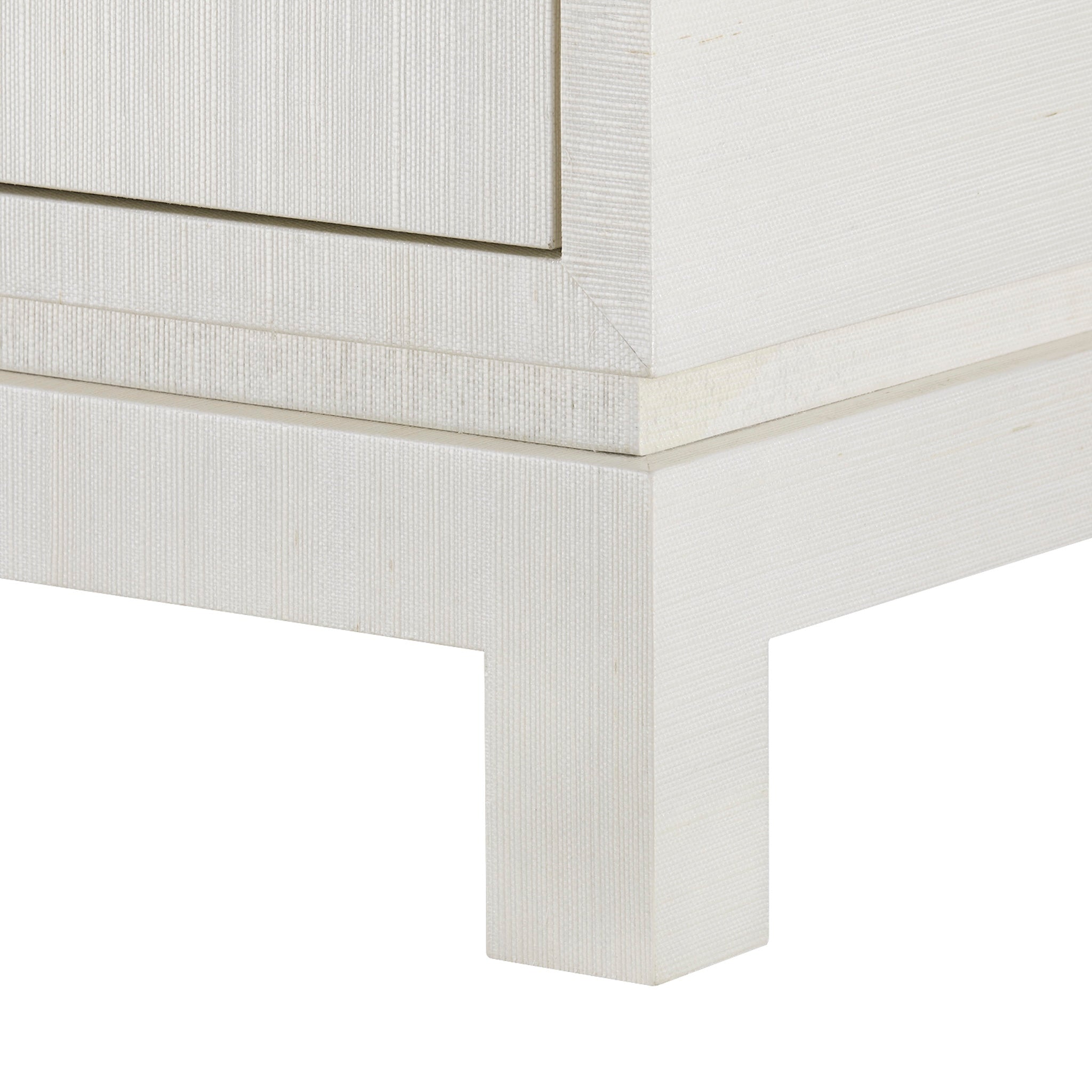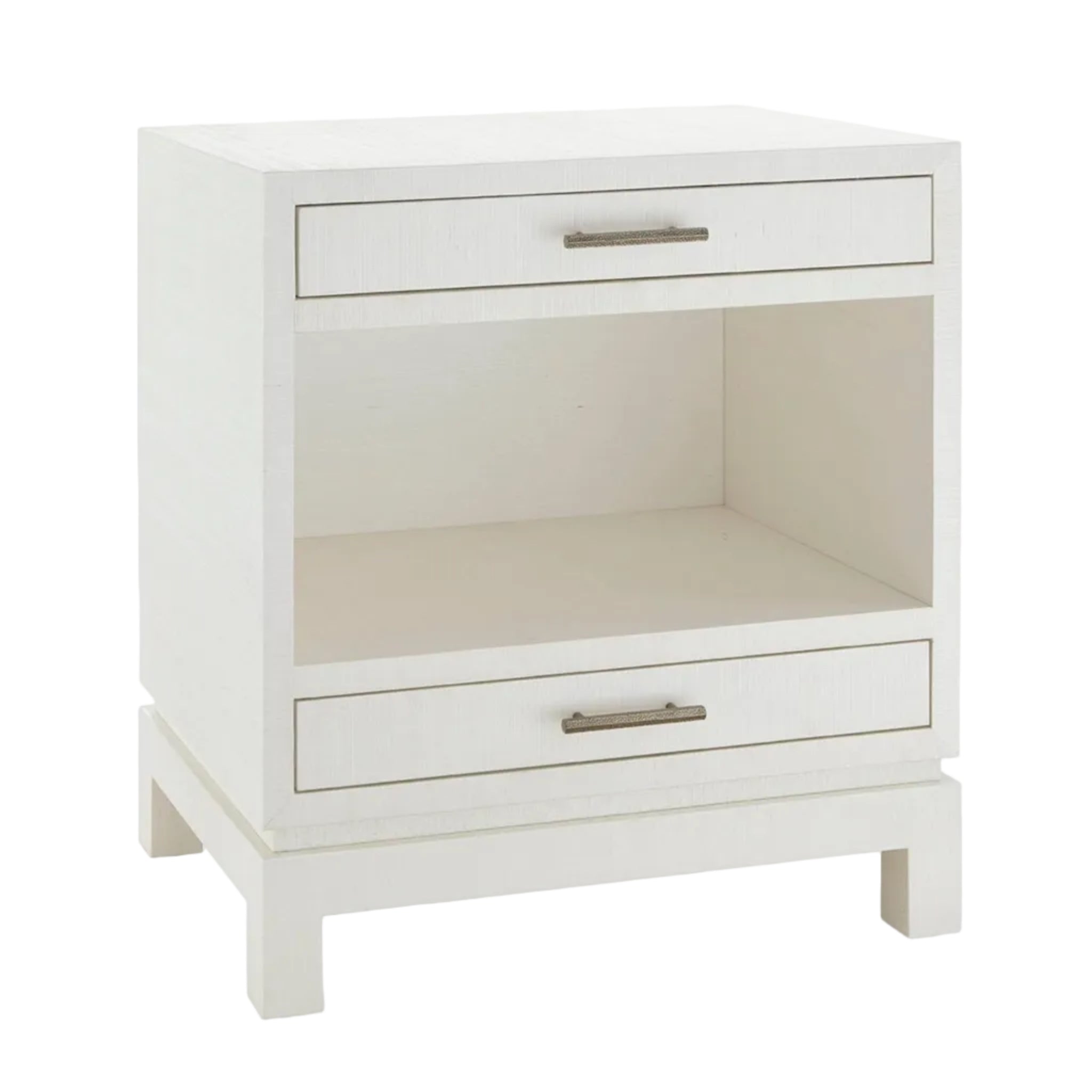 The Florence 2-Drawer Side Table pairs clean-lined simplicity with luxurious texture, wrapped in bleached grasscloth and accented by warm satin bronze pulls. With two soft-close drawers and an open center shelf, it offers a refined balance of hidden storage and display space.