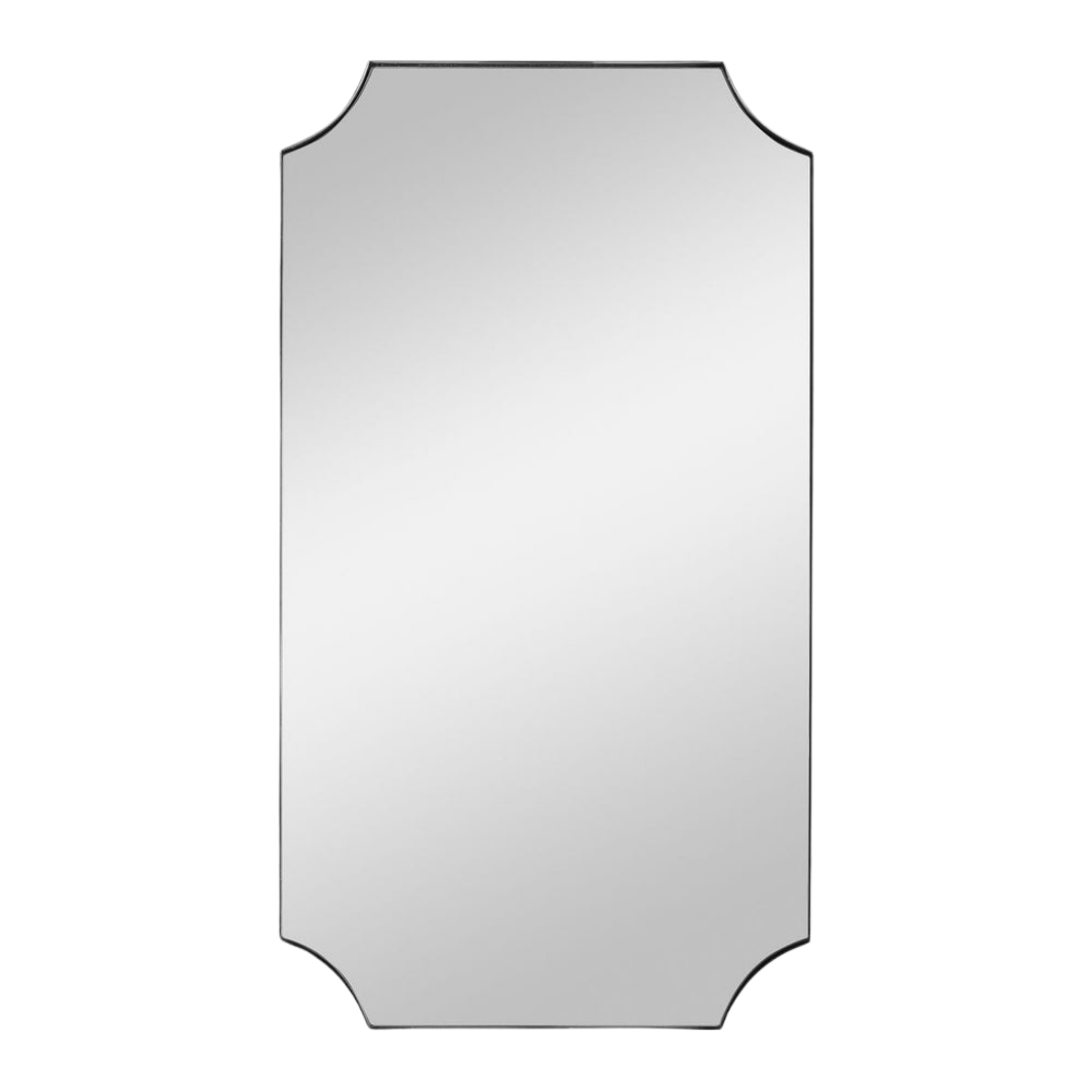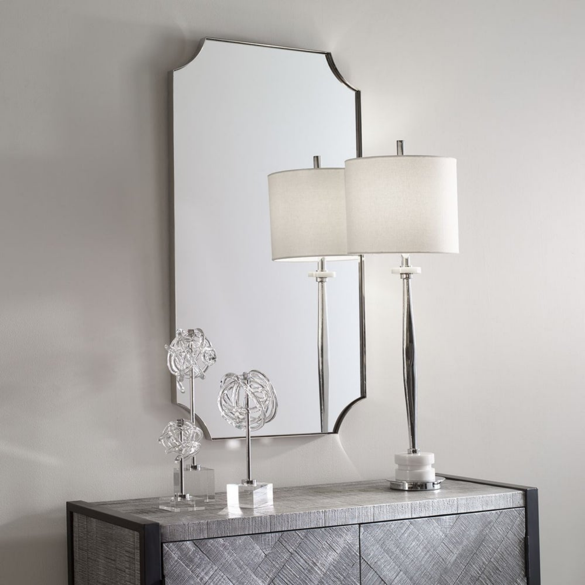 A stylish take on updated traditional style, this mirror features a stainless steel frame finished in a polished nickel with scalloped corner detailing. May be hung horizontal or vertical.