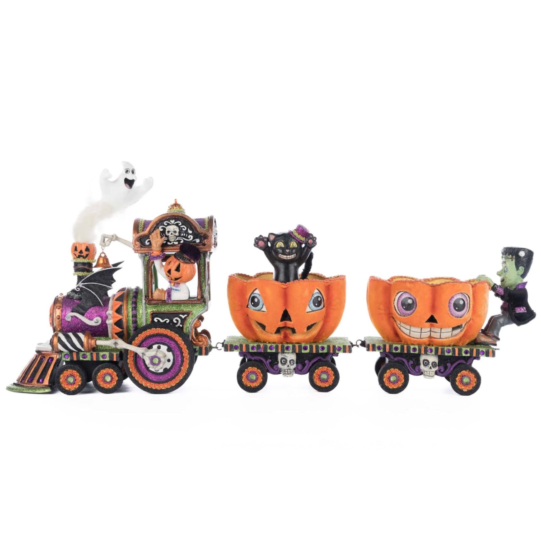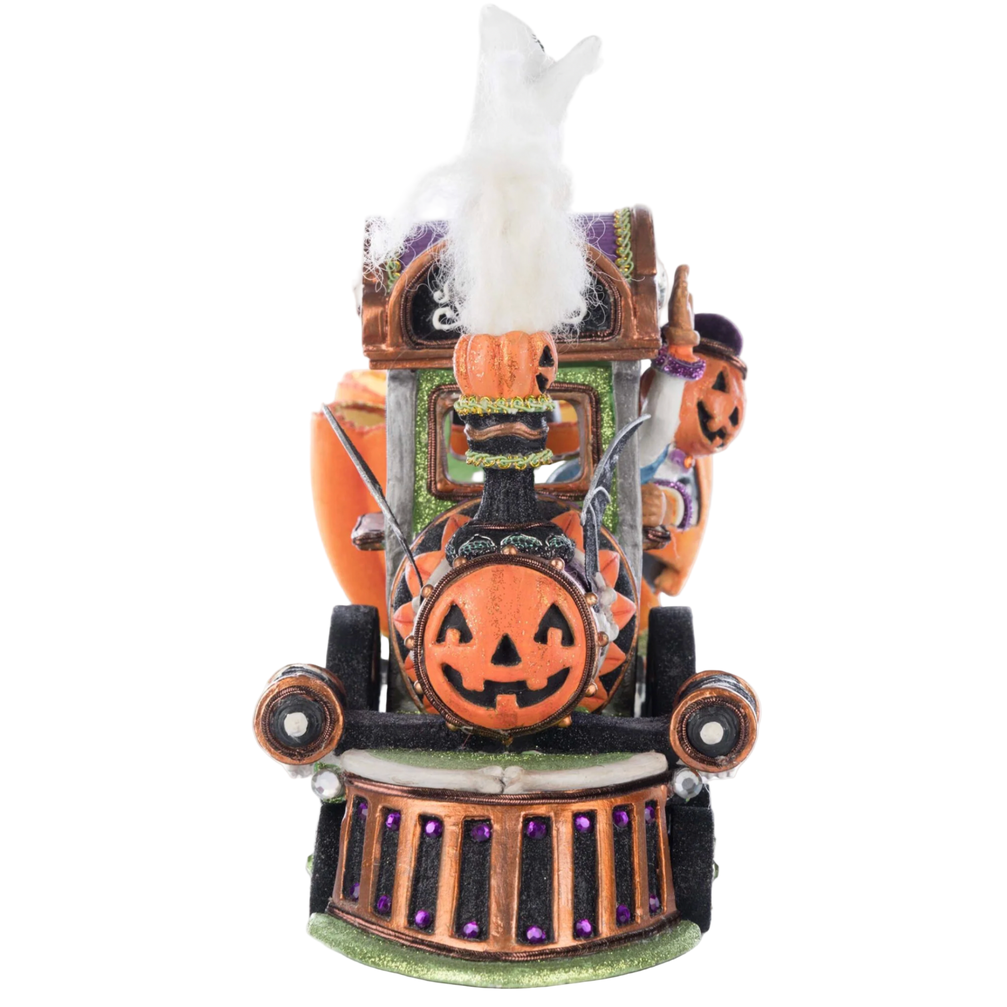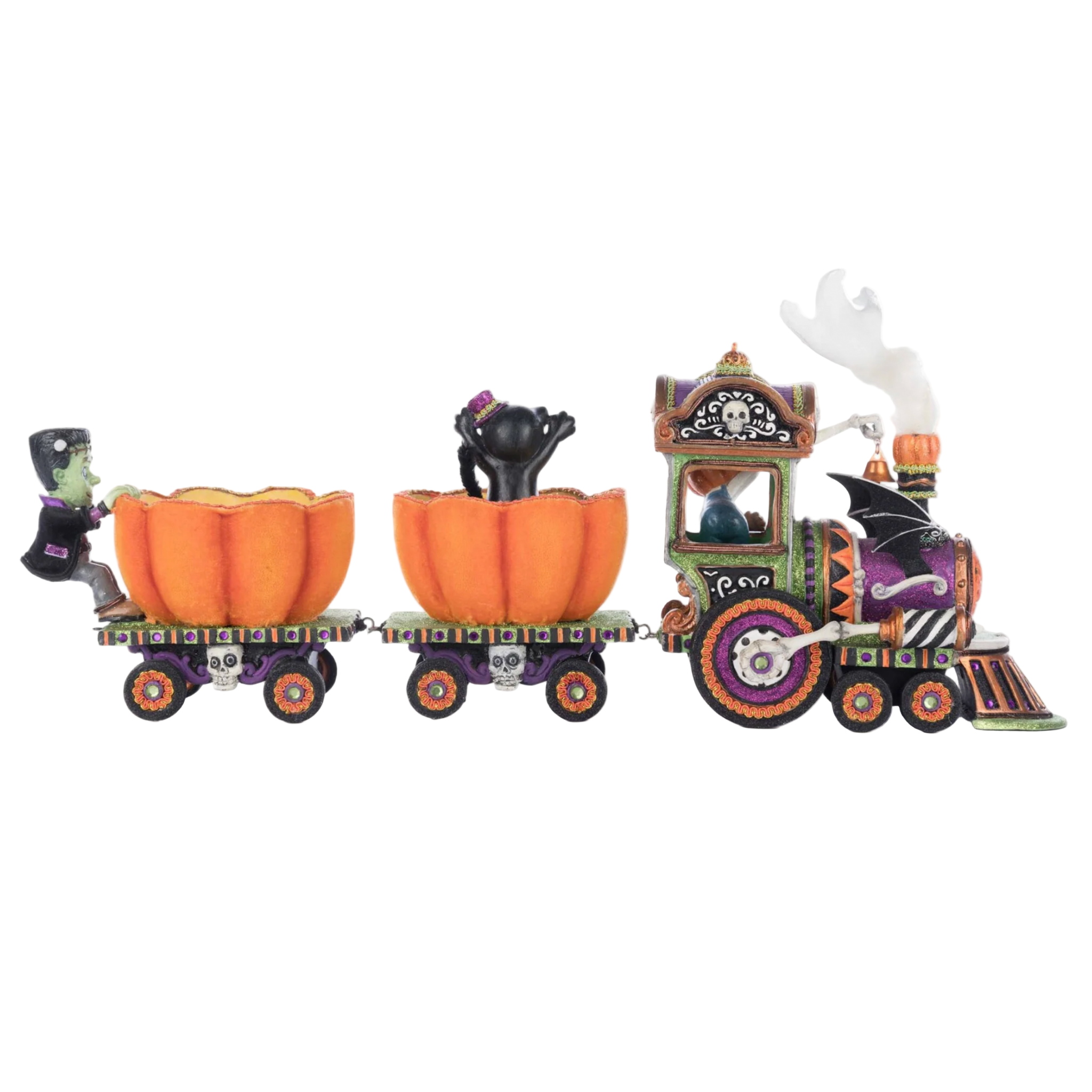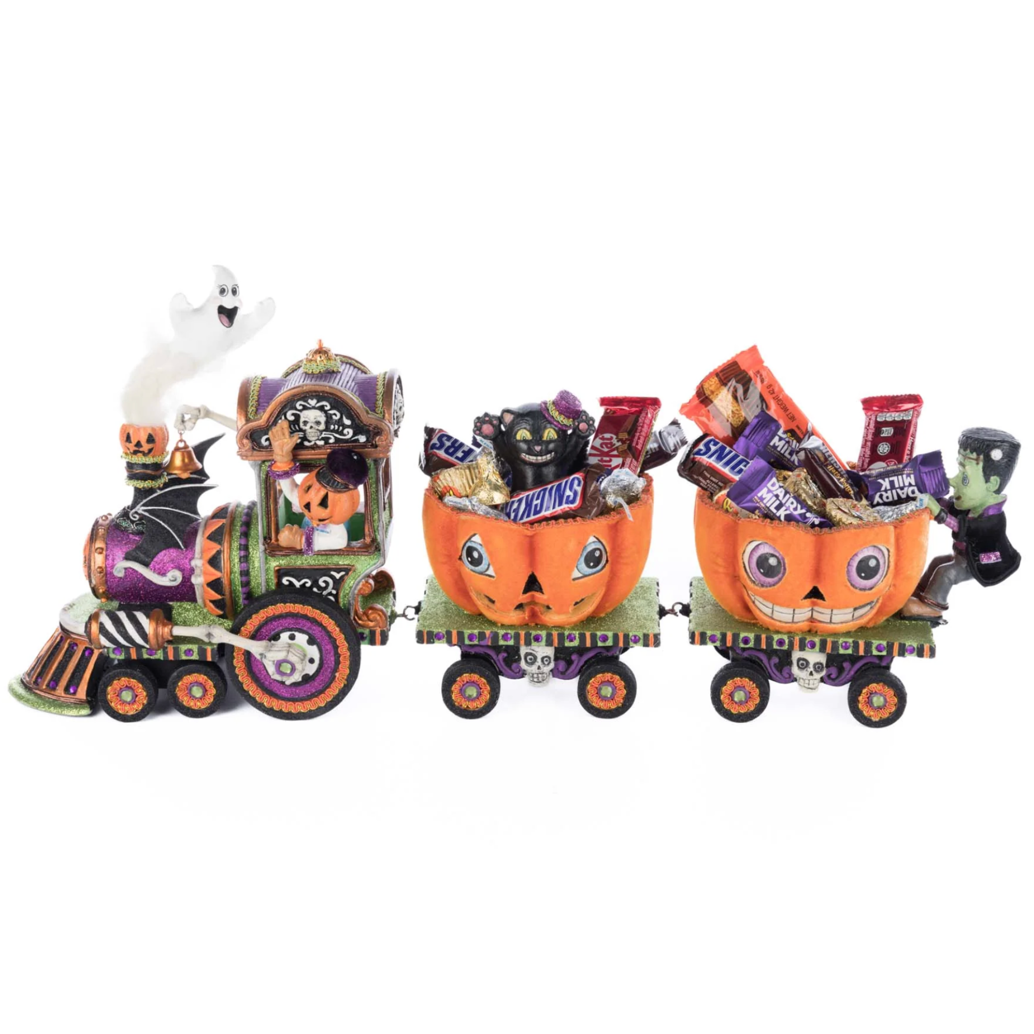 This spectacular three-piece train dazzles with intricate swirls, glitter, and vibrant fabrics. Two velvet pumpkin cars, decorated with hand-painted Halloween characters and a cheerful Jack-O’-Lantern conductor, eagerly await your candy.