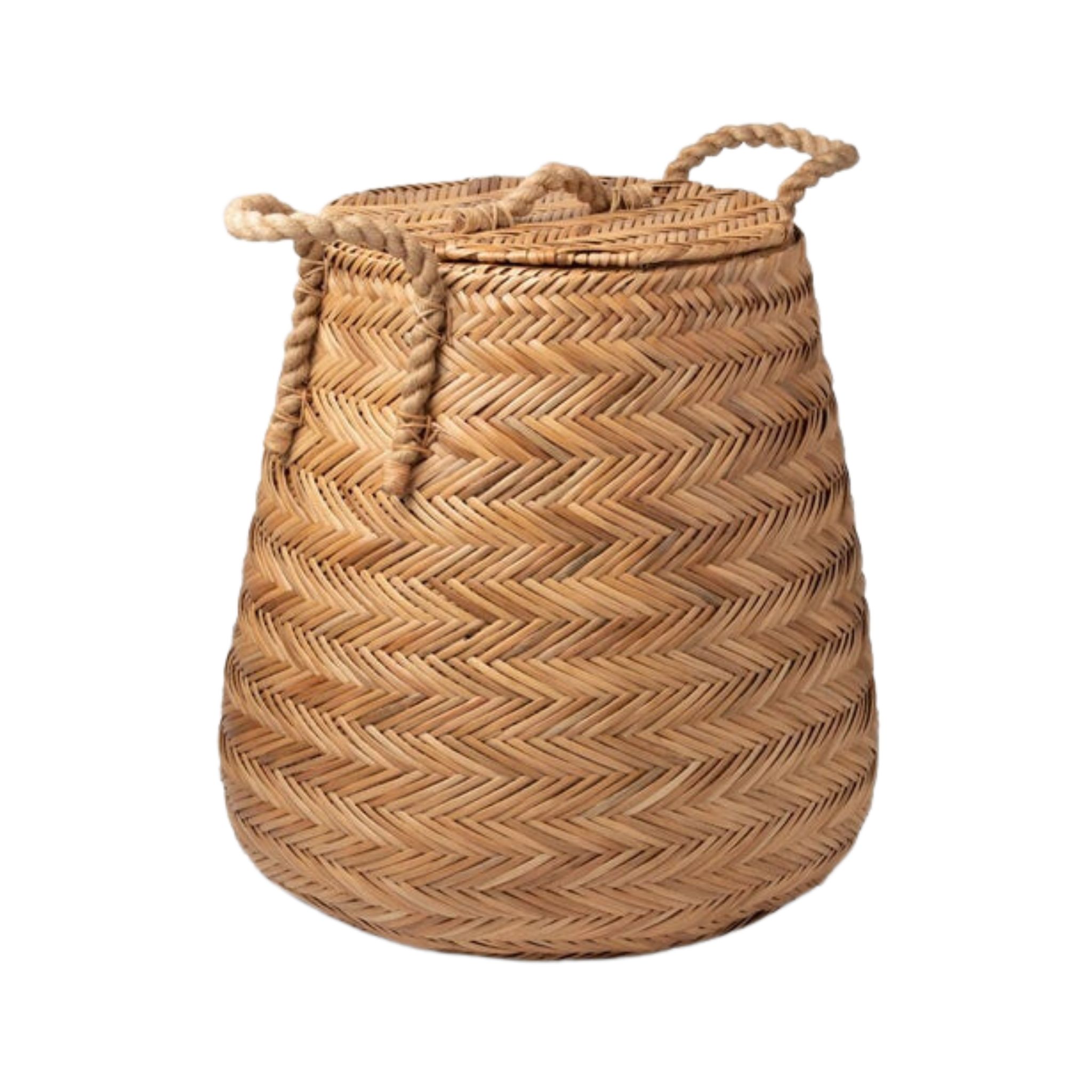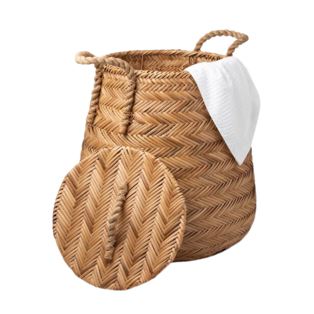 Oversized rattan hamper with chevron weave and nautical-inspired jute rope handles. Detachable lid.