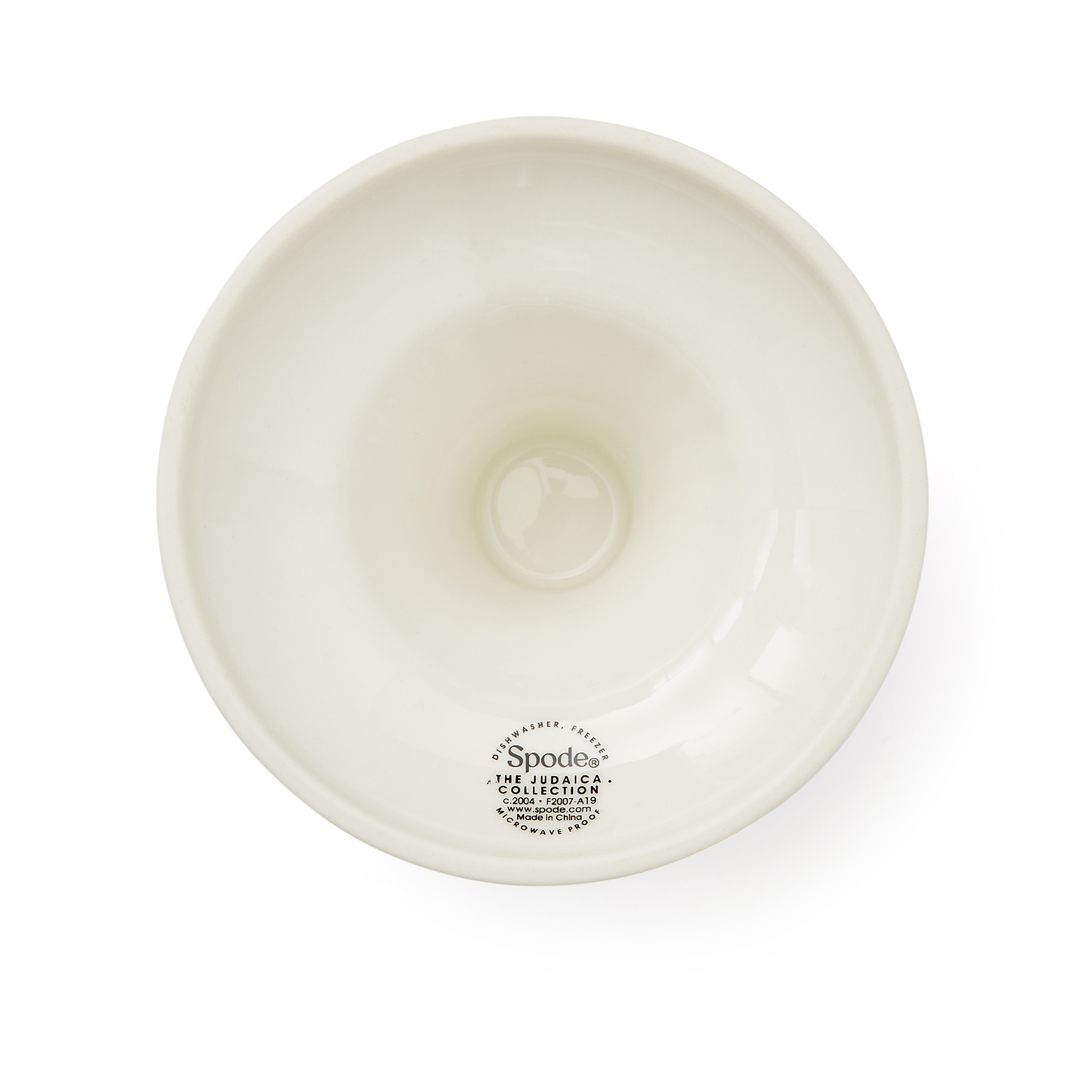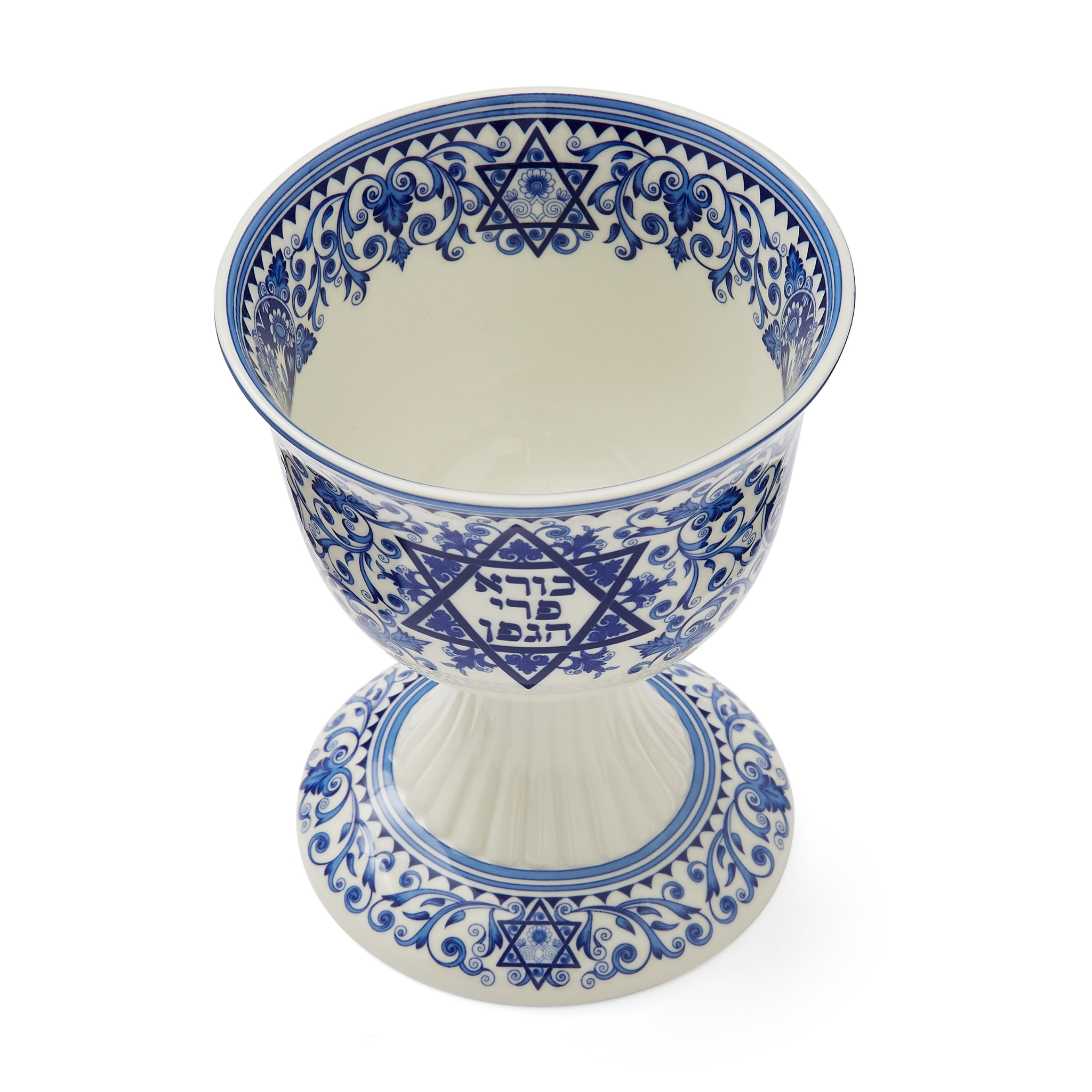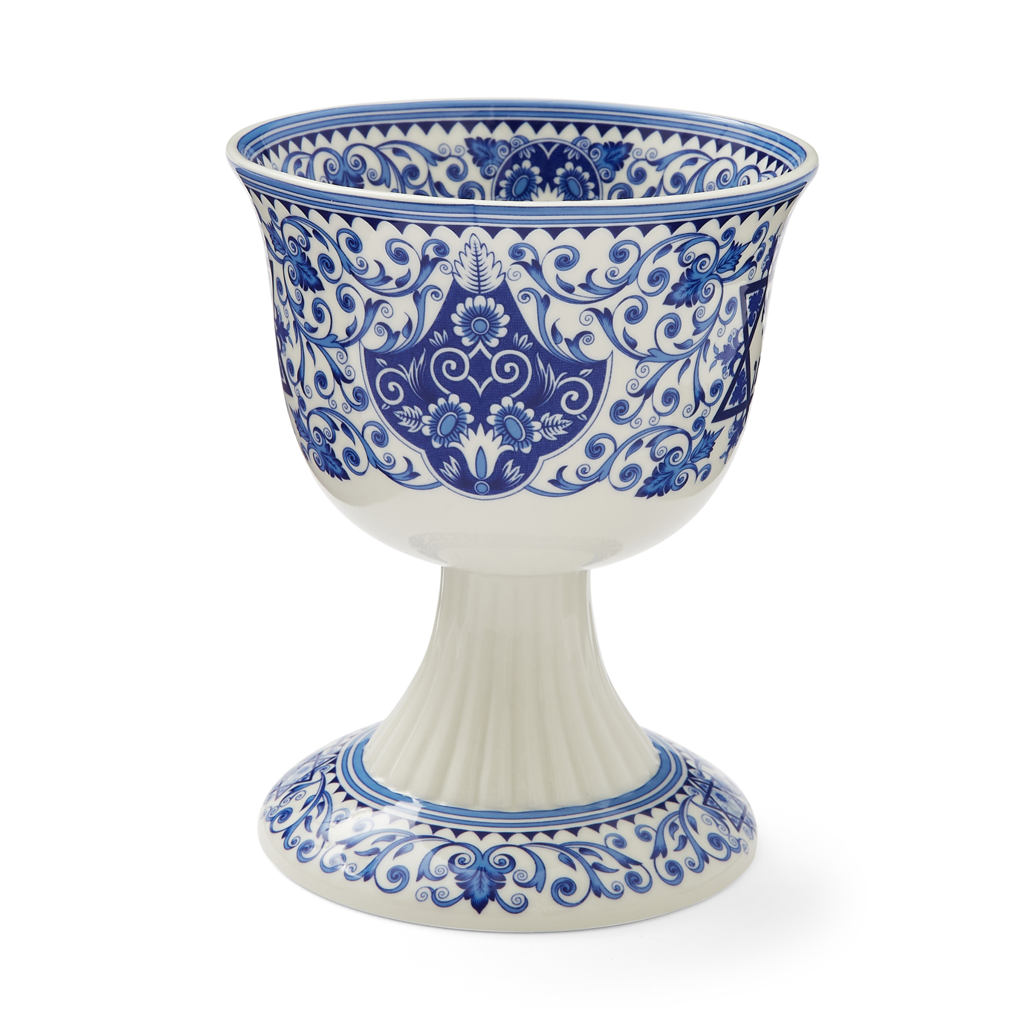Our Judaica Kiddush Cup is an elegant piece to use when the Kiddush is said over the wine to sanctify the Sabbath. The Kiddush Cup. With the Hebrew phrase on the Kiddush cup translating to "who creates the fruit of the vine.", this cup may also be used during holiday and festival meals like the Passover Seder and Rosh Hashanah. The design is based on historic Judaic manuscripts from the 1880's, influenced by early ceramic tile motifs, and features the traditional colors of blue and white. The motif of stylized flowers and vines are interwoven amongst the straight-edged Star of David adding a beautiful addition to your Sabbath meal.