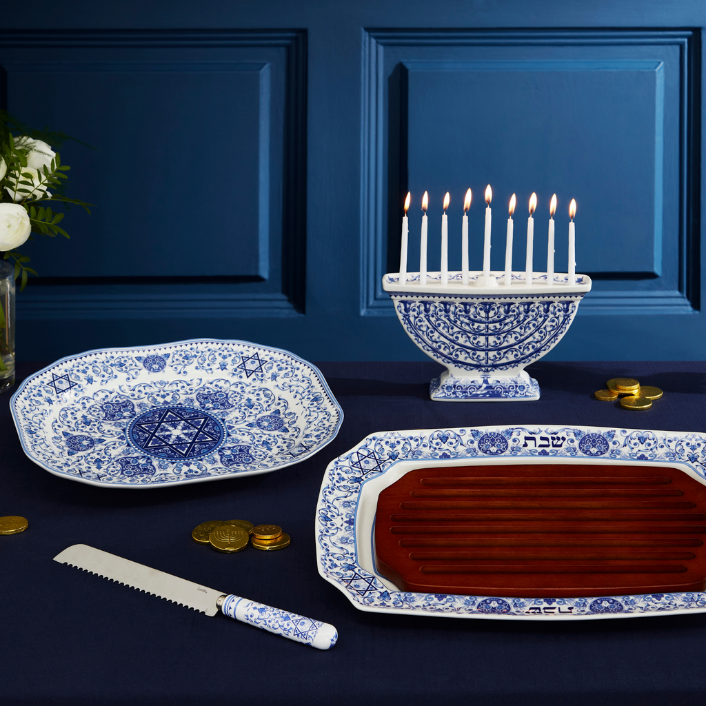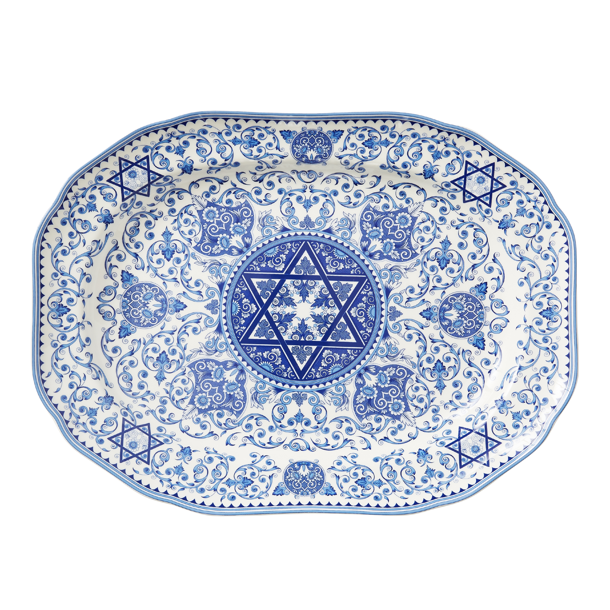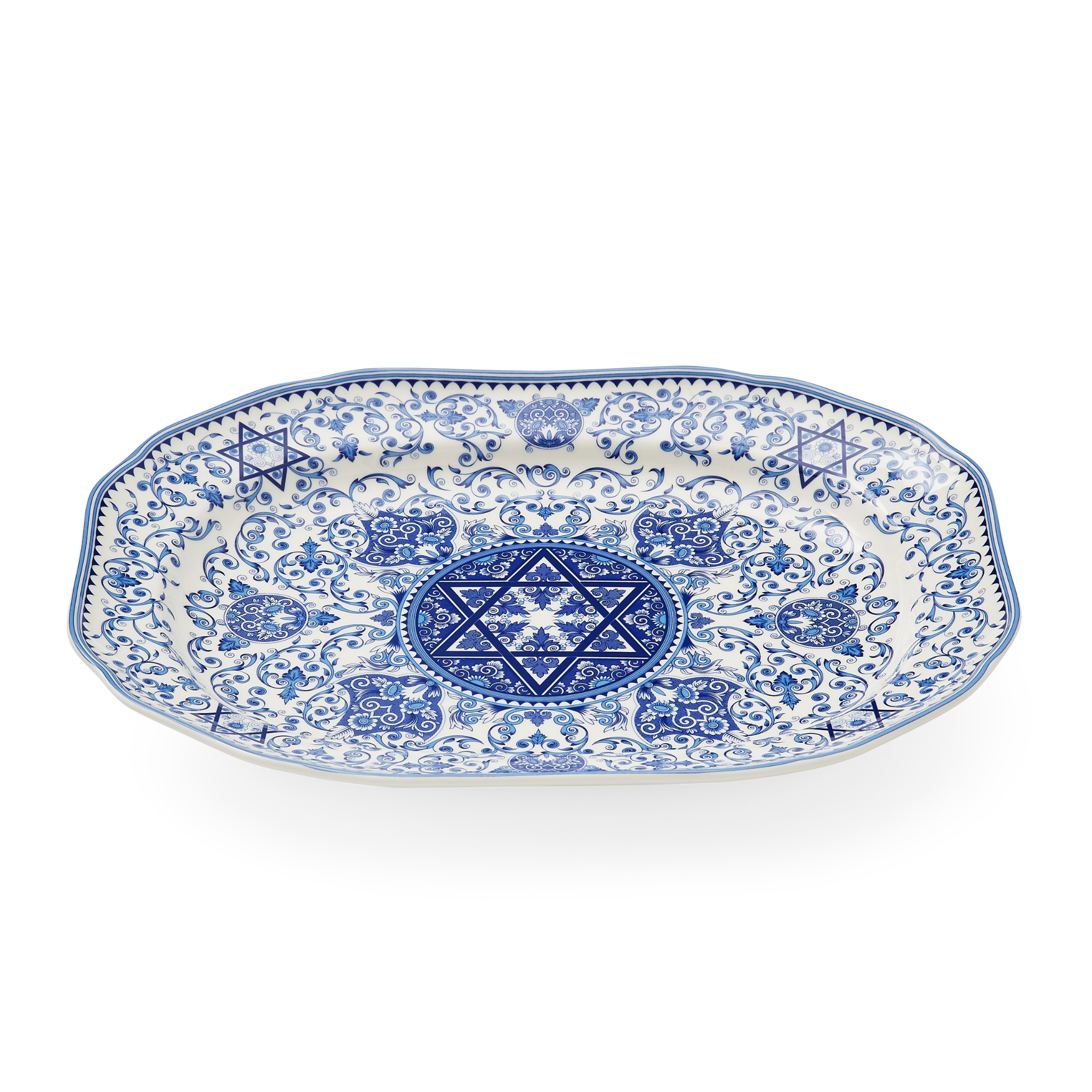 The Oval Platter from the Judaica collection is an elegantly designed serving tray featuring a design based on historic Judaic manuscripts from the 1880's, influenced by early ceramic tile motifs in a beautiful blue and white colorway. Generously sized at 14 inches, this oval platter can be used for Sabbath dinners as well for serving all year long.