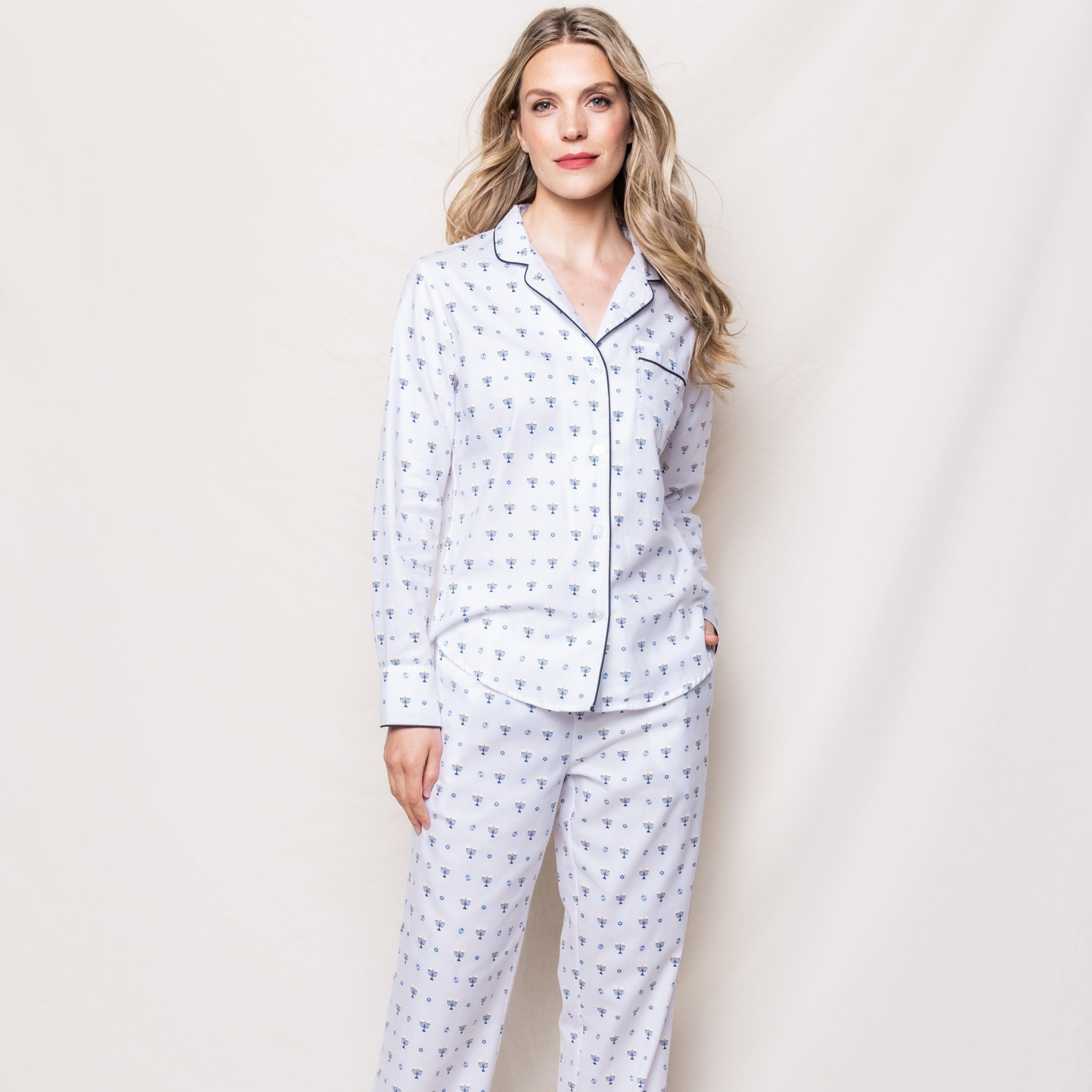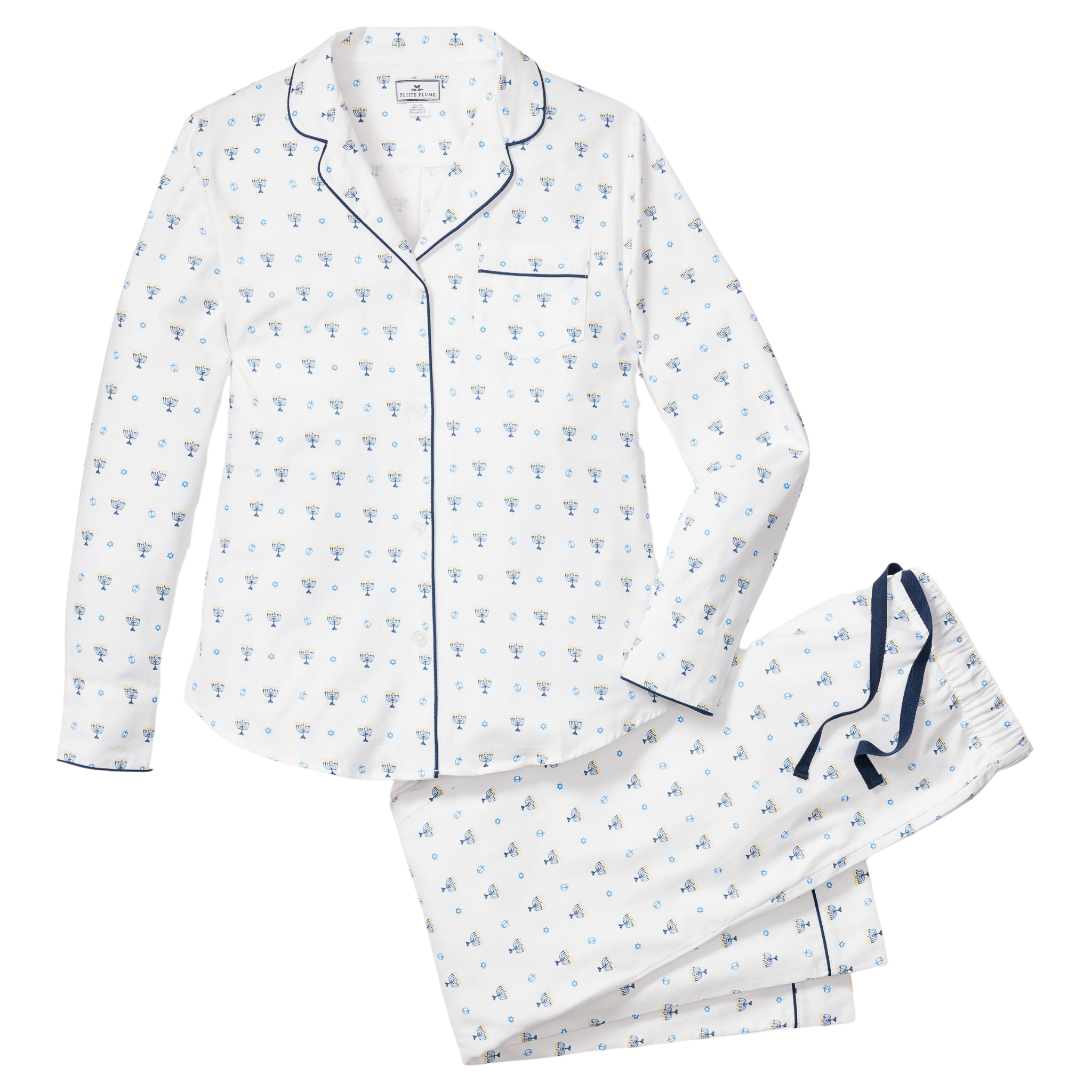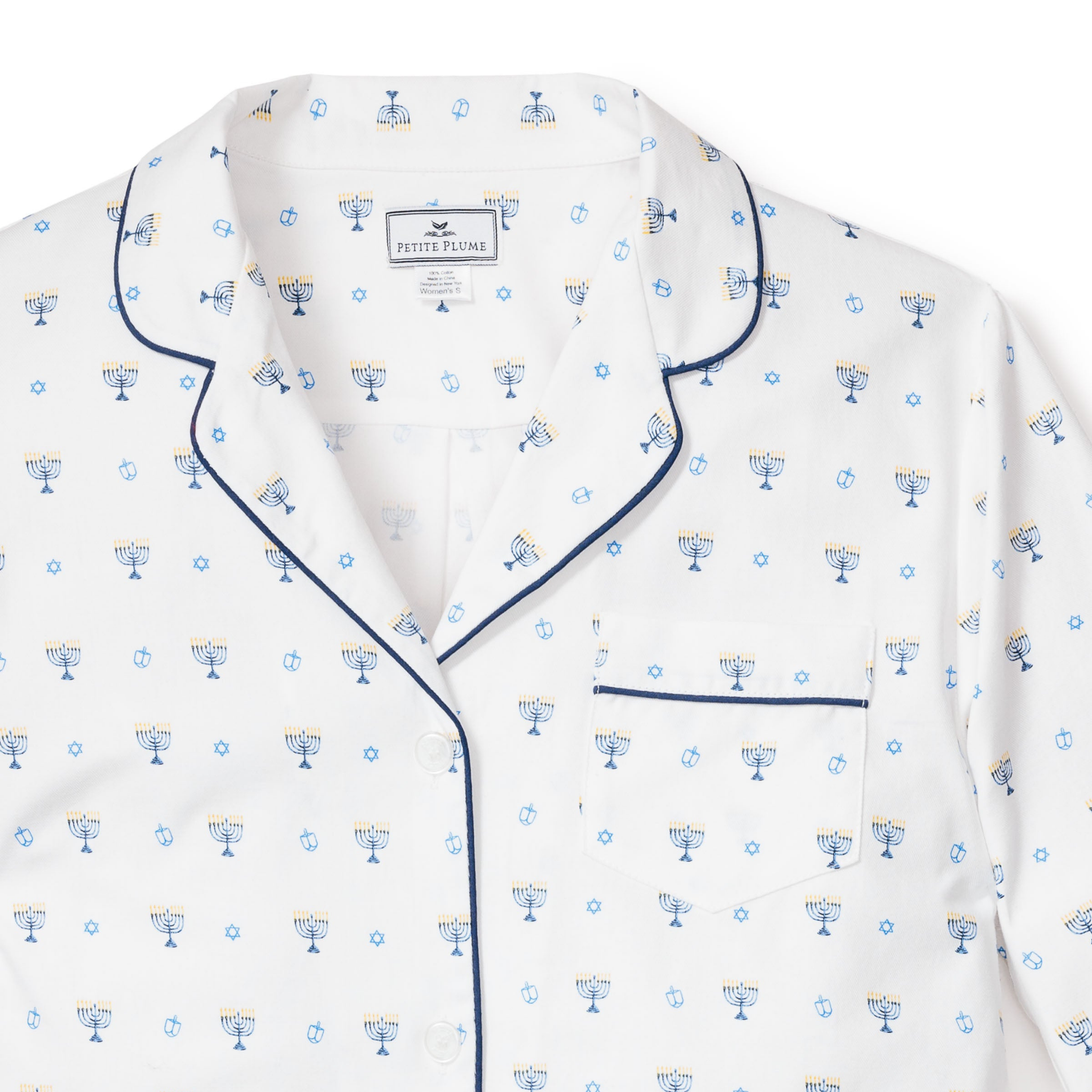 Illuminate your nights and celebrate the joyous festival of Hanukkah with this print that pays homage to the cherished traditions of the festival of lights. In classic shades of blue and white, the colors of Hanukkah, and adorned with the iconic menorah, symbolizing the miracle of the oil, and the spinning dreidel, representing the joyous games and traditions of the season, these pajamas immerse you in the spirit of this special time. This classic twill pajama set is accented with navy piping and finished with logo buttons.