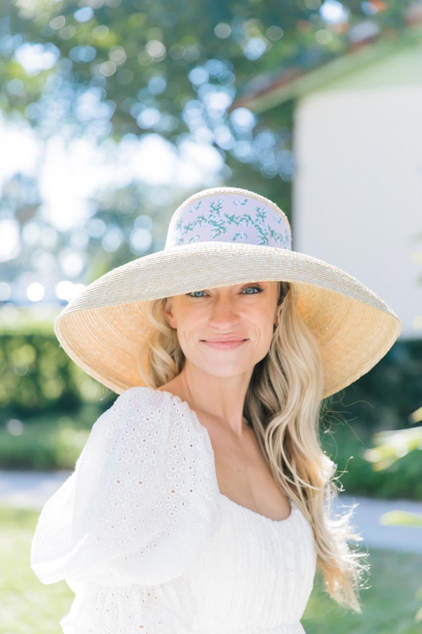 Inspired by days at the beach and in the garden, this handcrafted wheat straw hat features a tall crown, wide downturned brim, and a signature ribbon in an exclusive Giddy Paperie print. Adjustable drawstring ensures a perfect fit. Custom made, ships in three weeks.