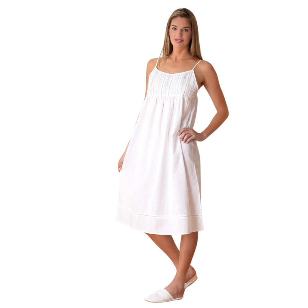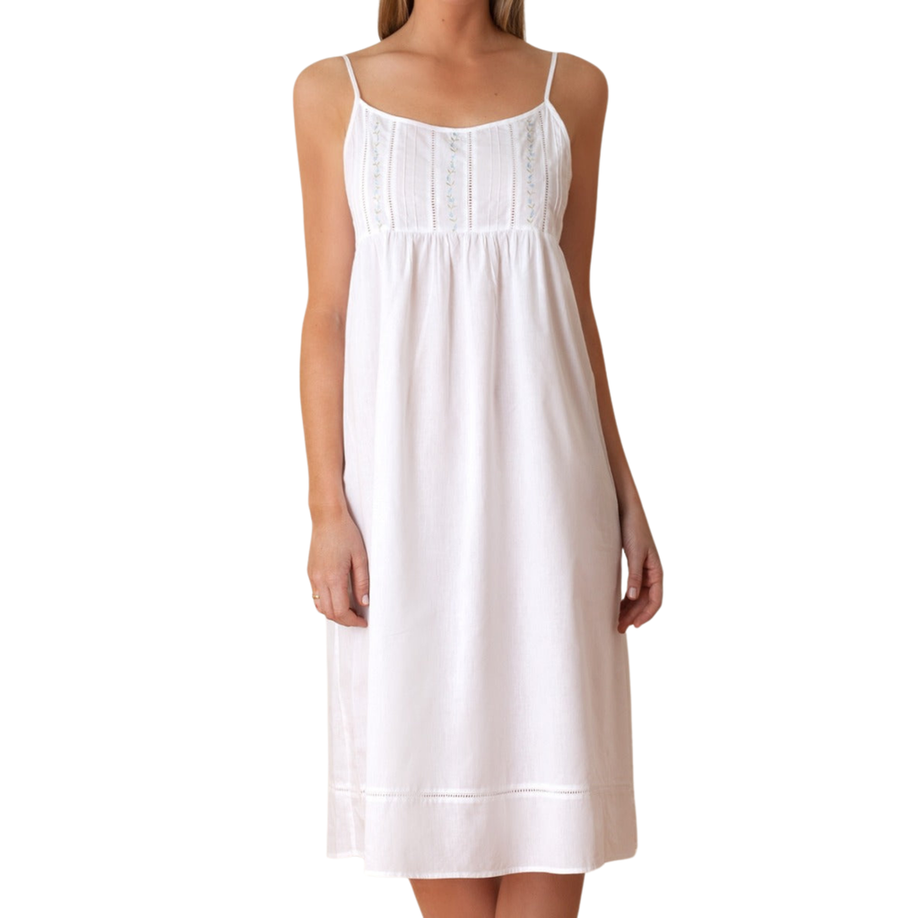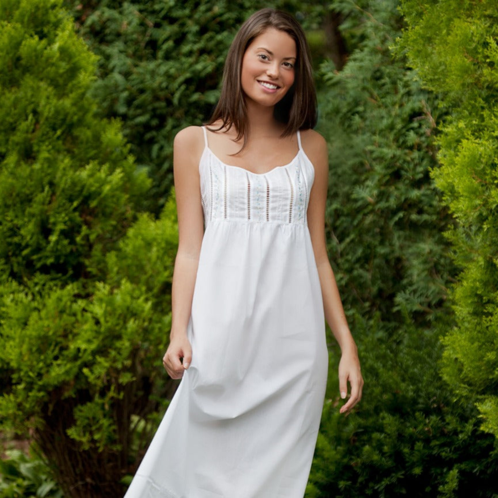 The Elaine Nightgown is made from crisp, white cotton and features spaghetti straps and delicate vines of blue flowers between columns of hem stitch and pin tucks. You'll love how you look and feel in this lovely nightgown.